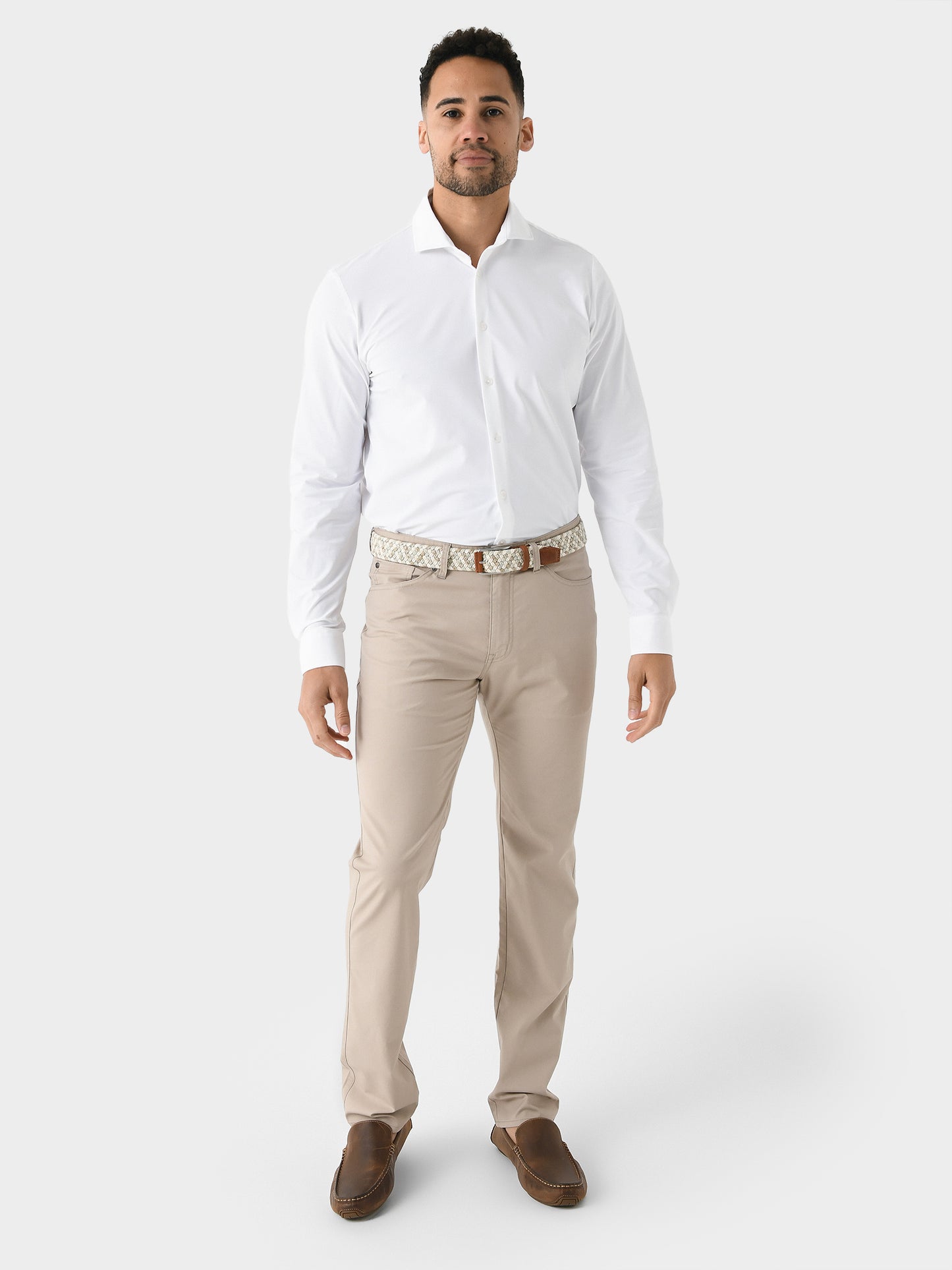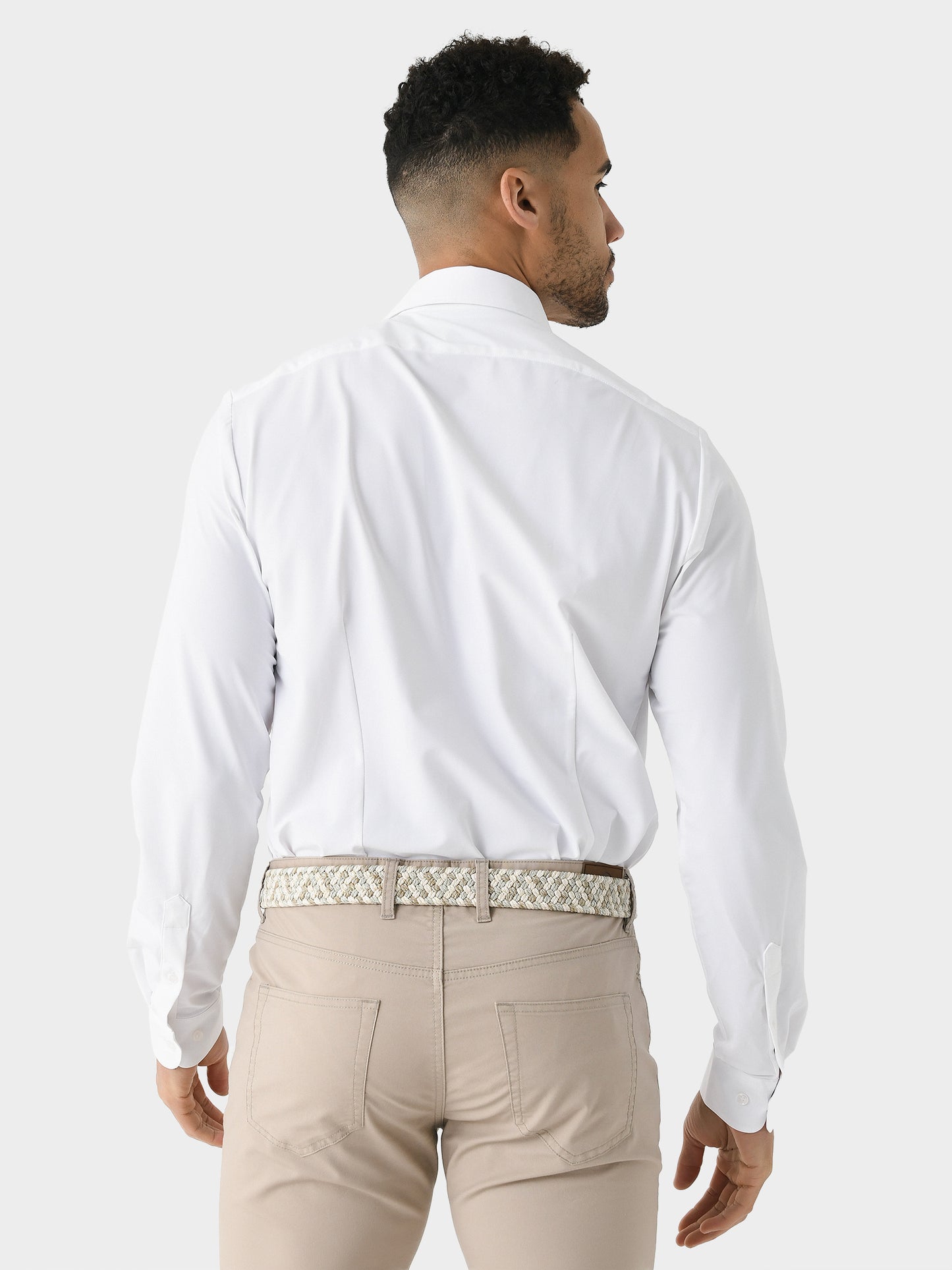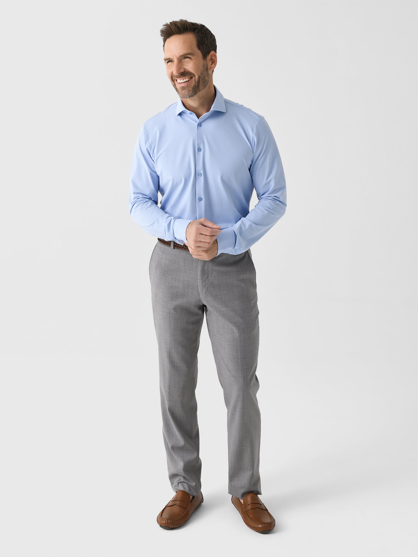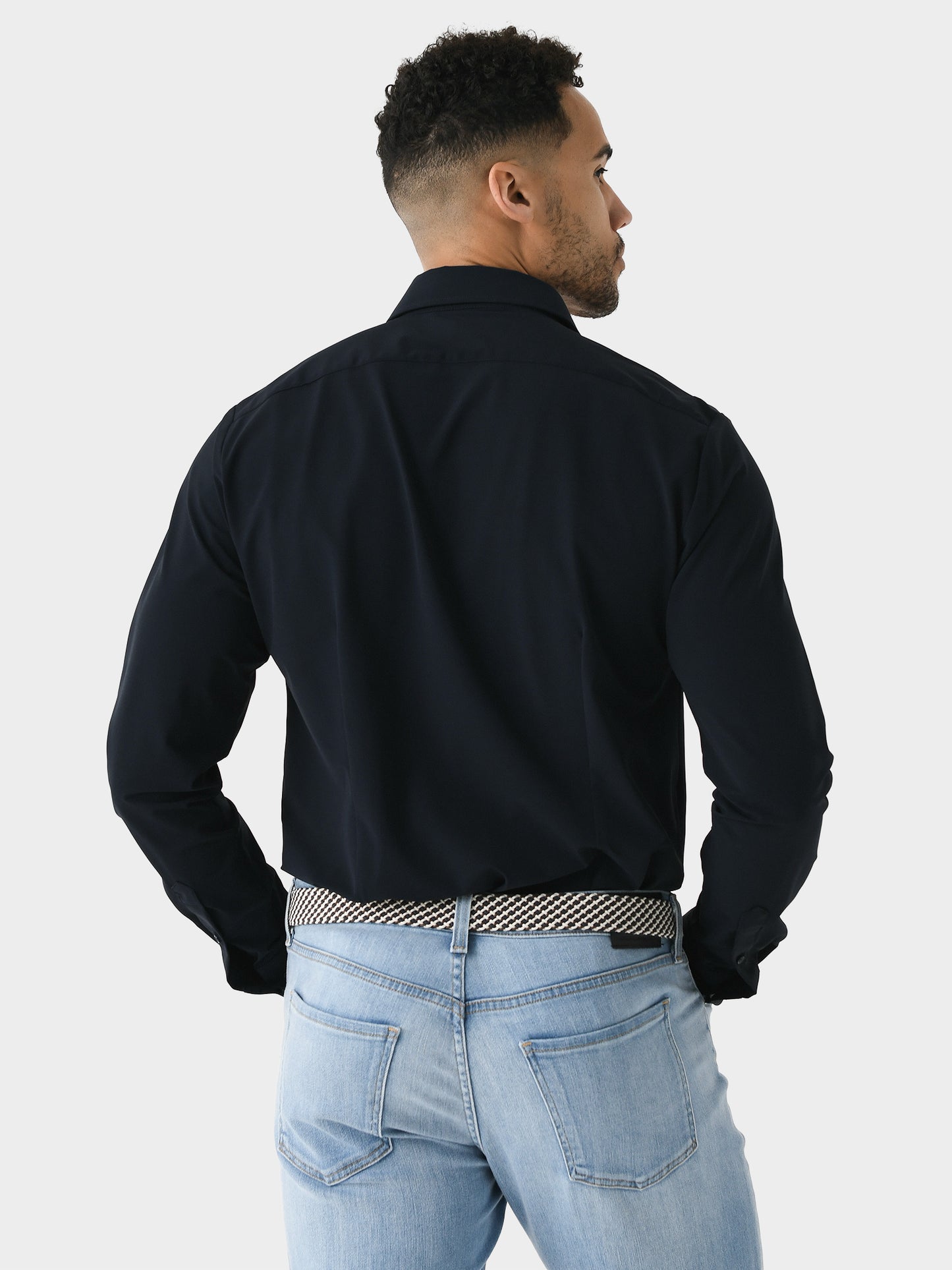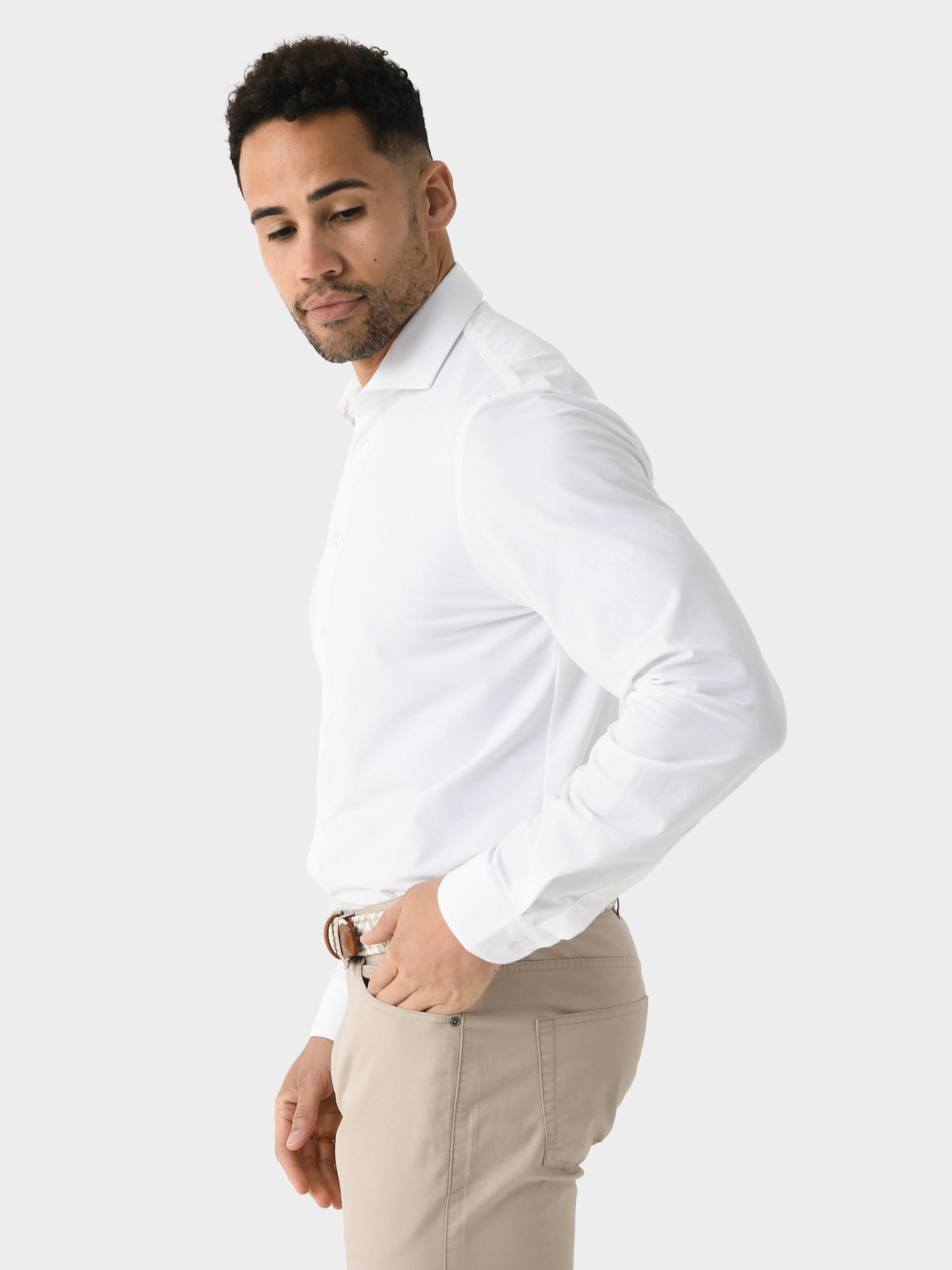 A long-sleeve button-down shirt constructed from soft performance knit jersey fabric.