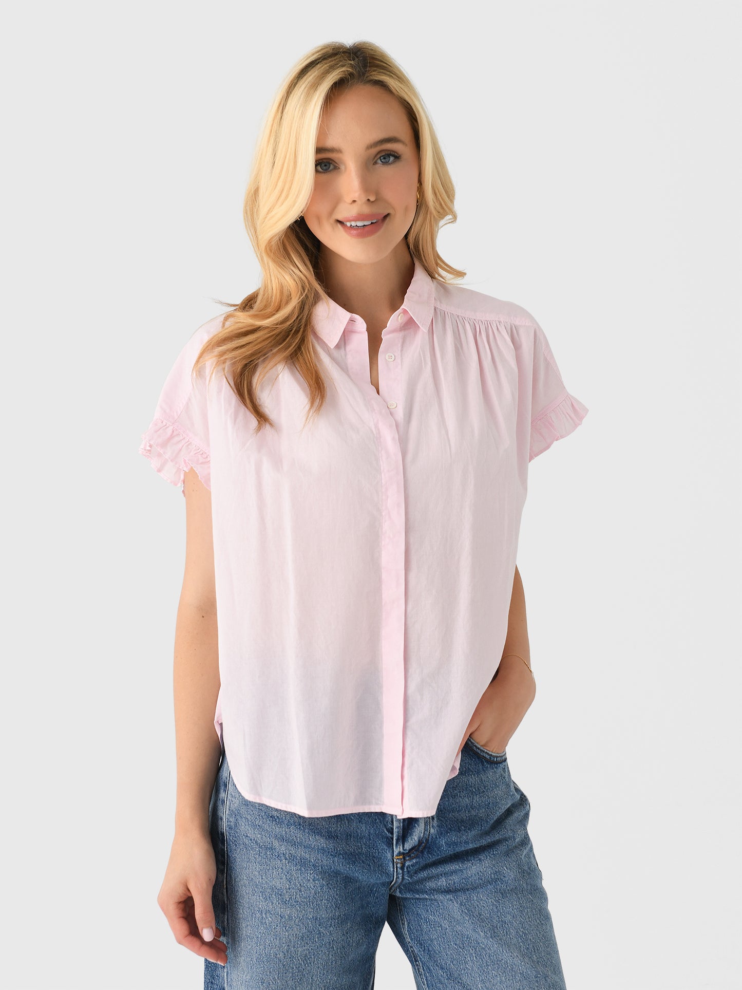 A lightweight woven shirt made from crisp cotton and finished with ruffle-trimmed sleeves and a hidden placket.