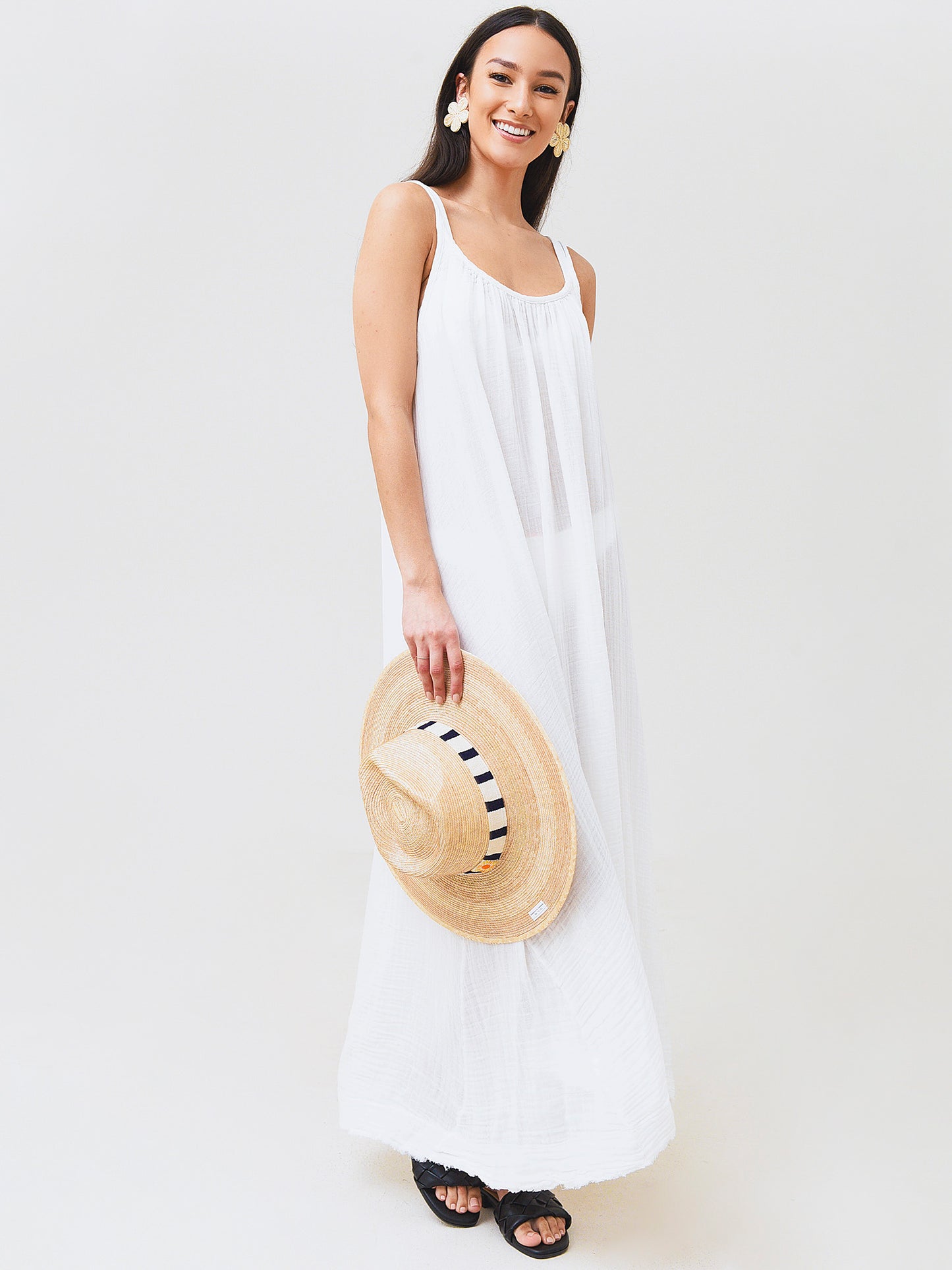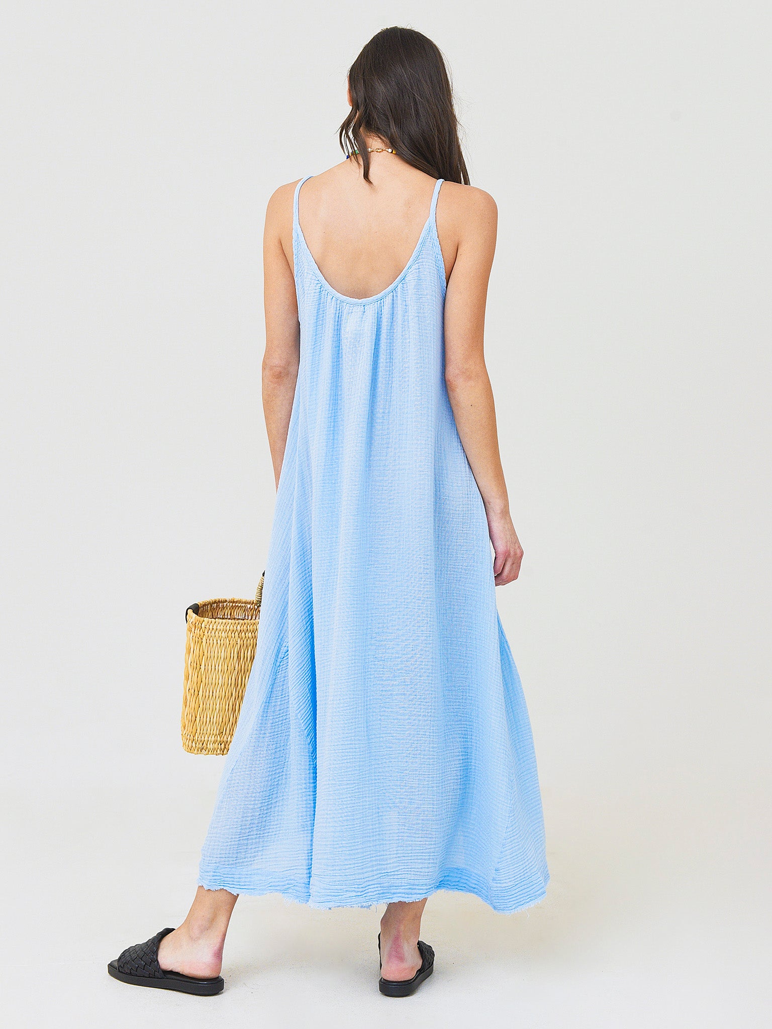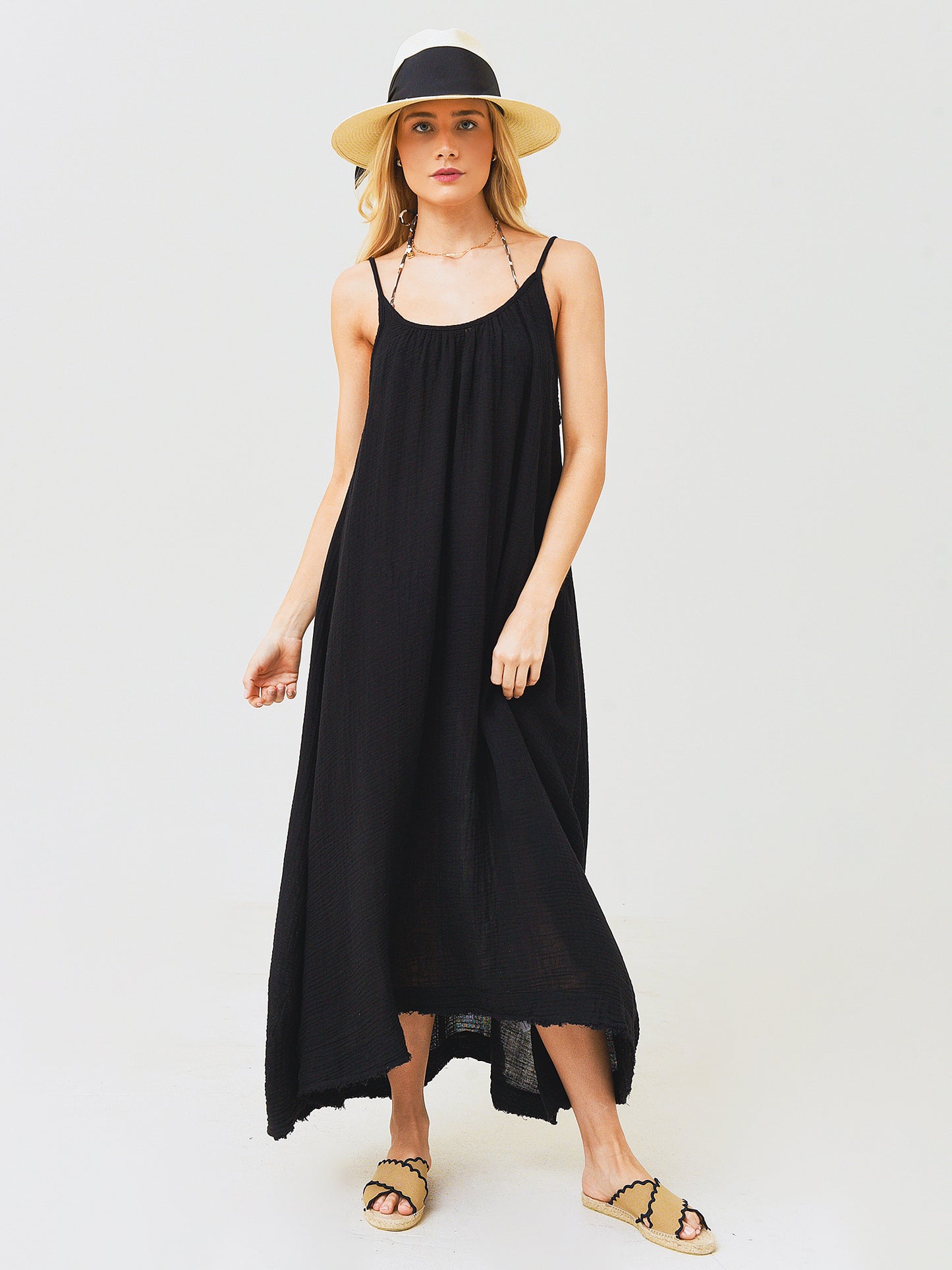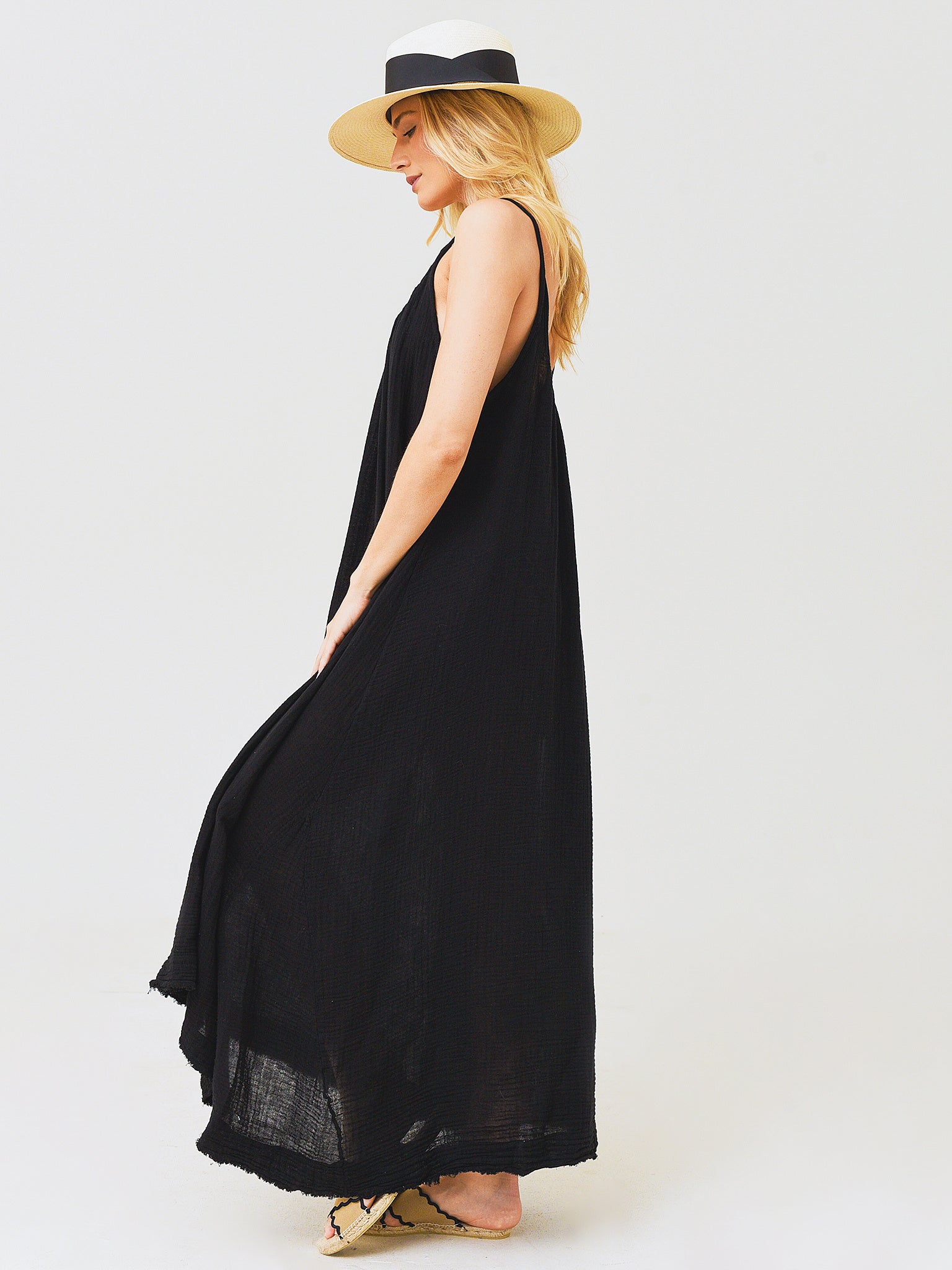 Lightweight maxi cover-up dress in crinkled gauze fabrication.