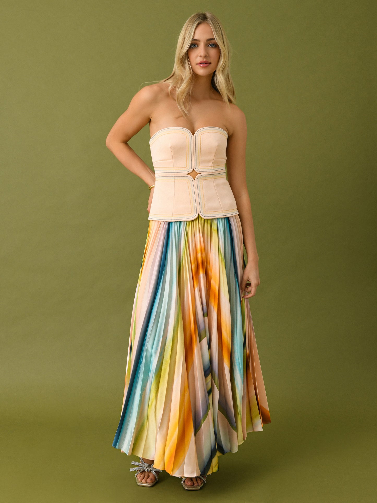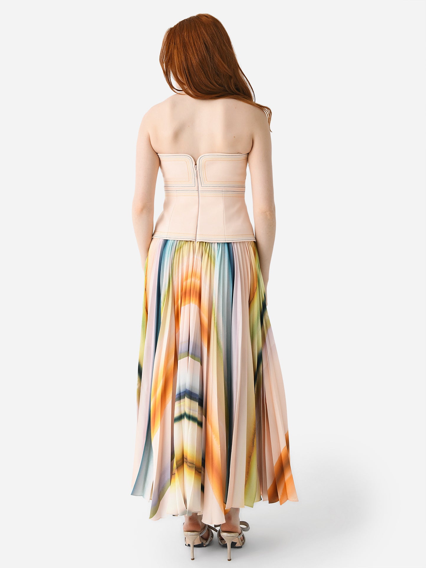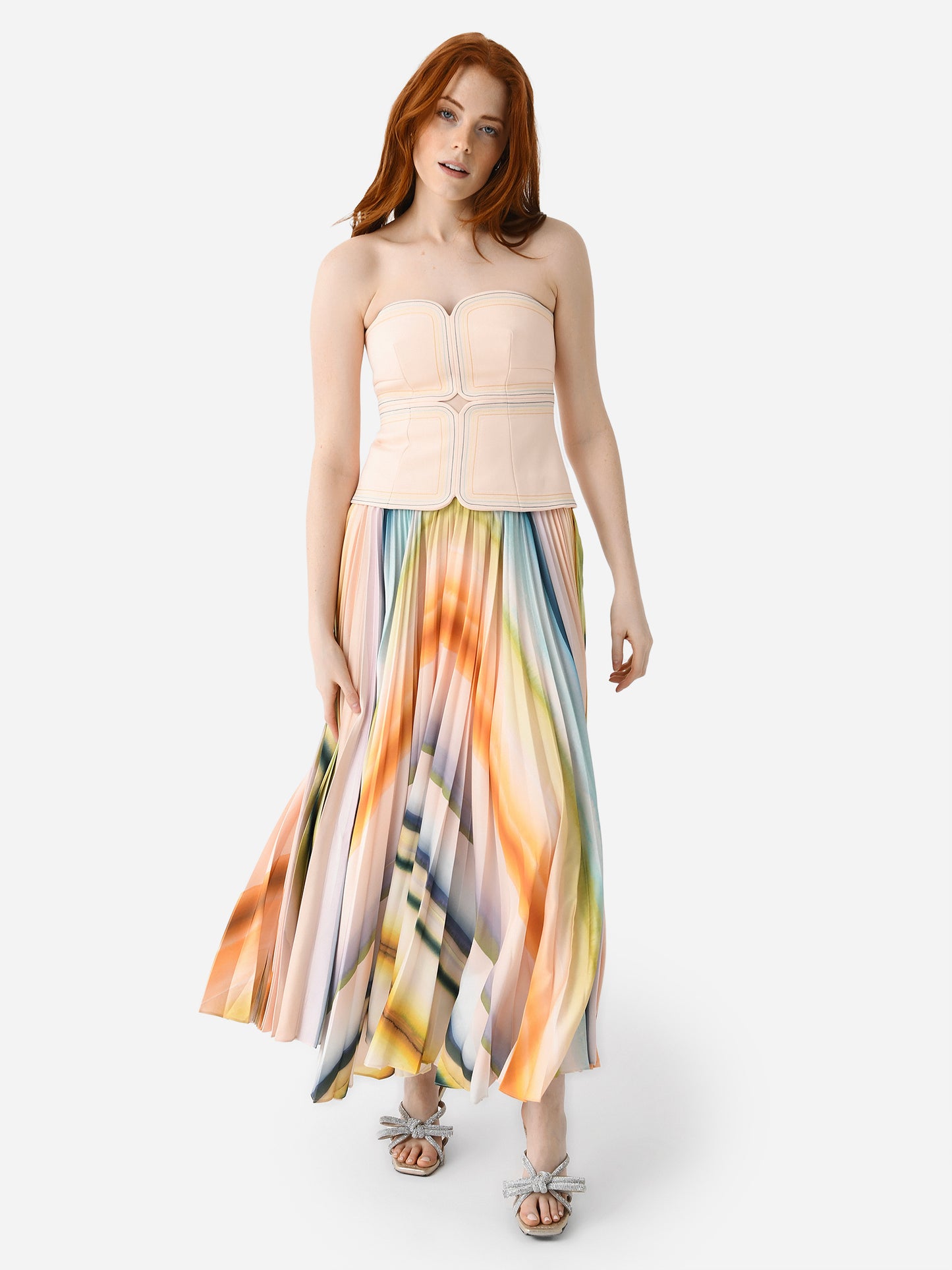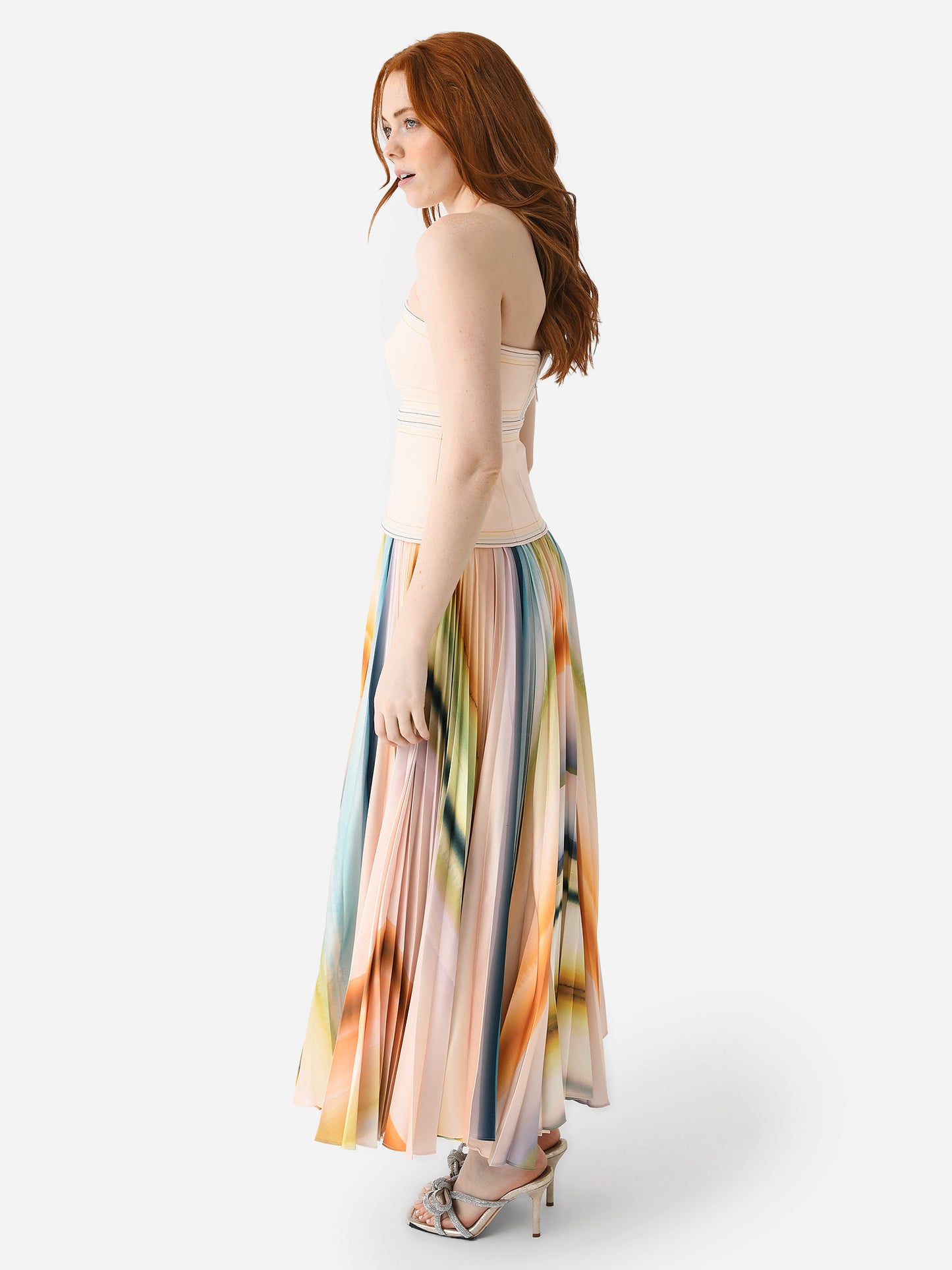 A strapless dress featuring a modern structured bodice and a free-flowing pleated skirt.