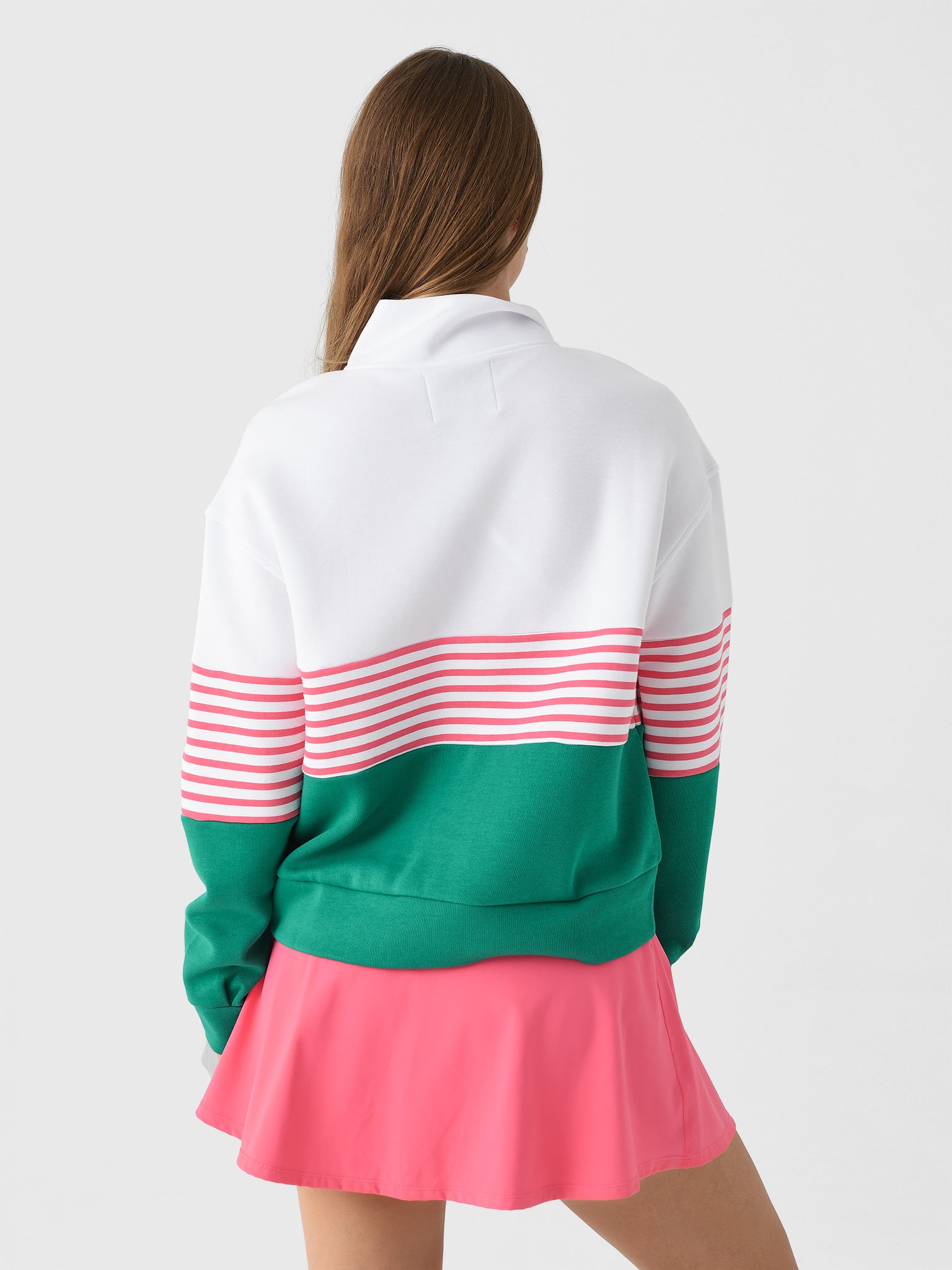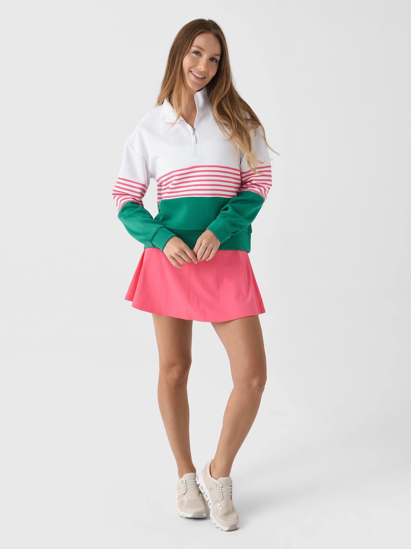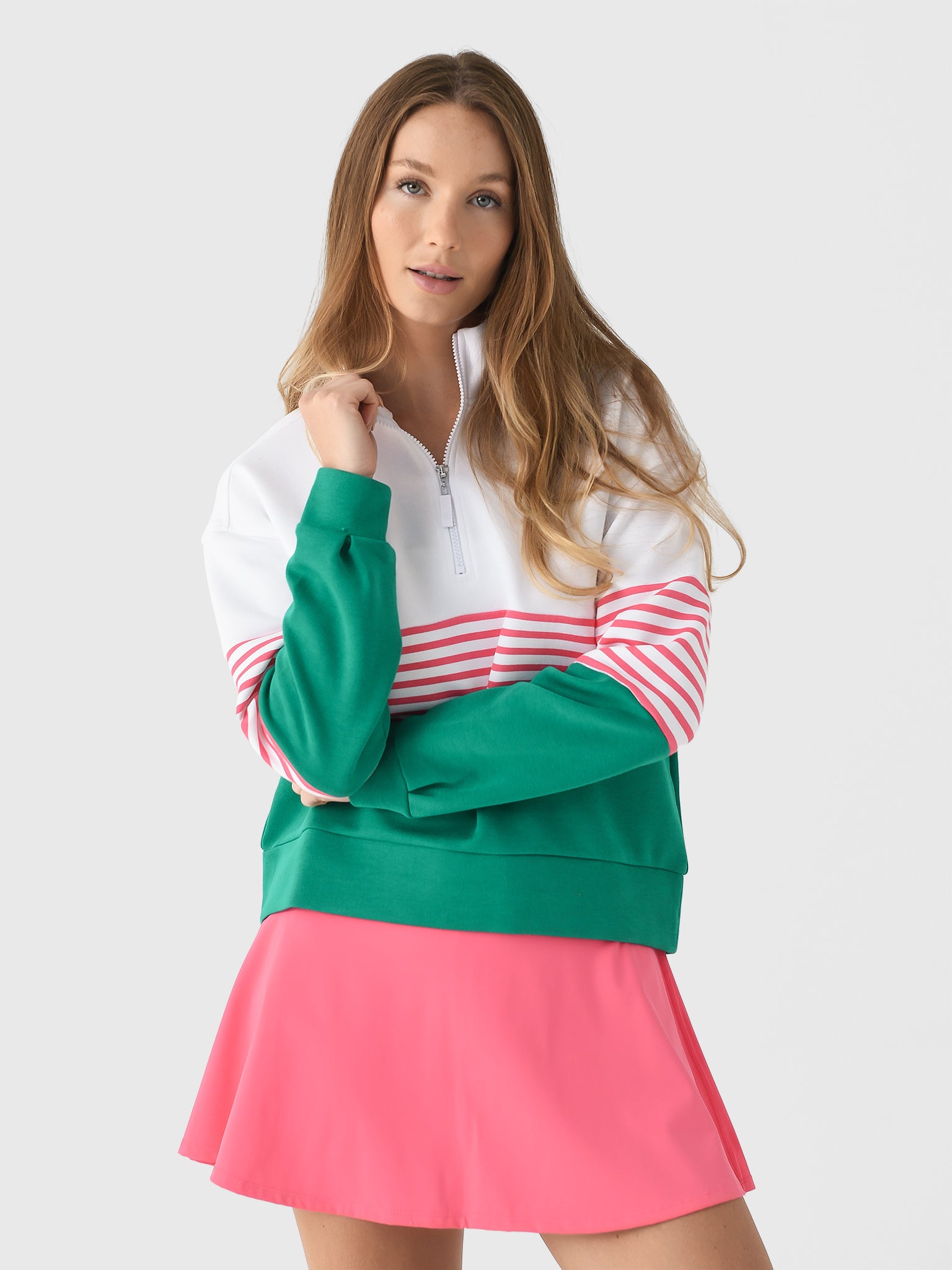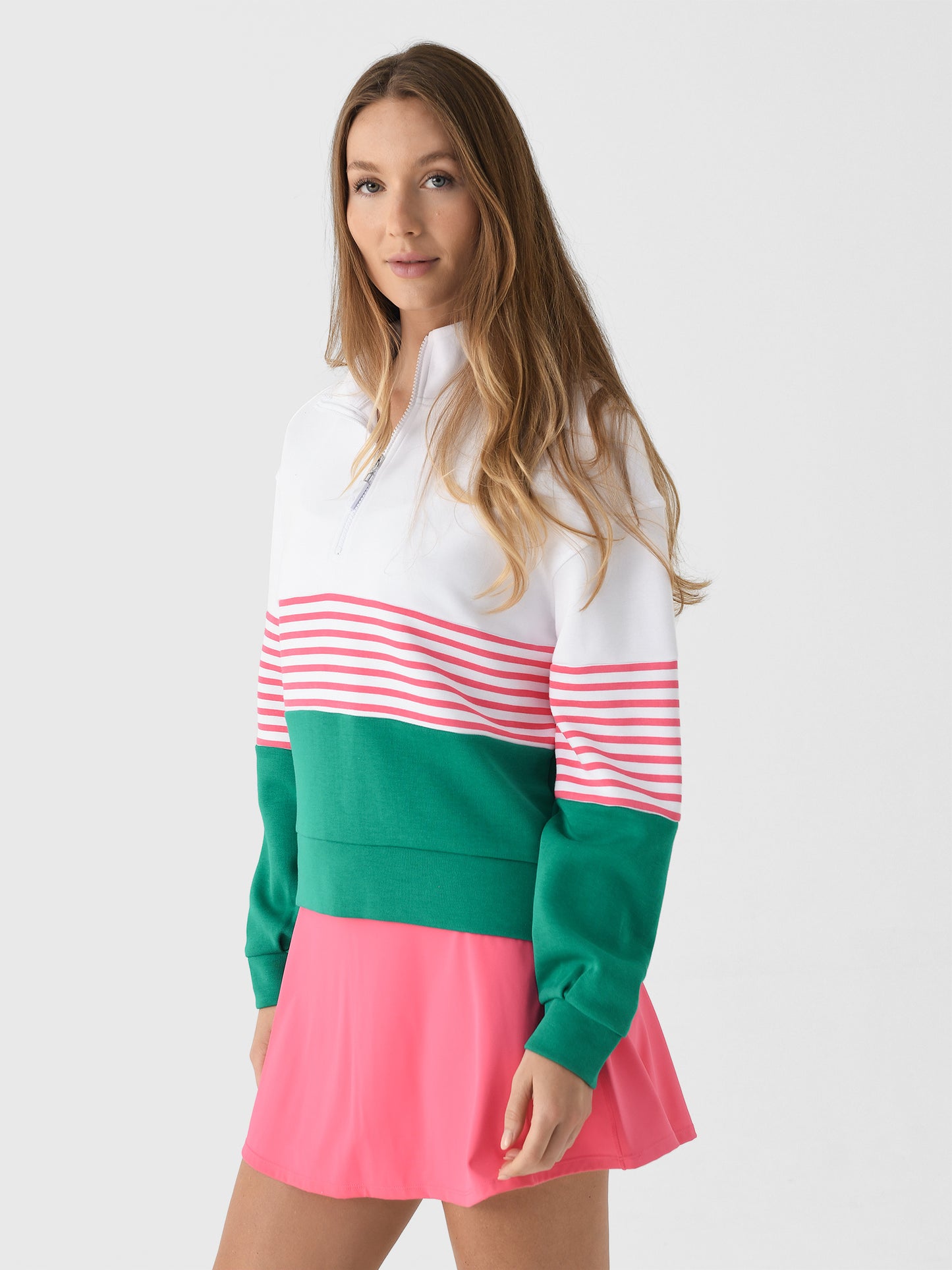 This cozy quarter-zip pullover features a chic color block design made for looking effortlessly polished.