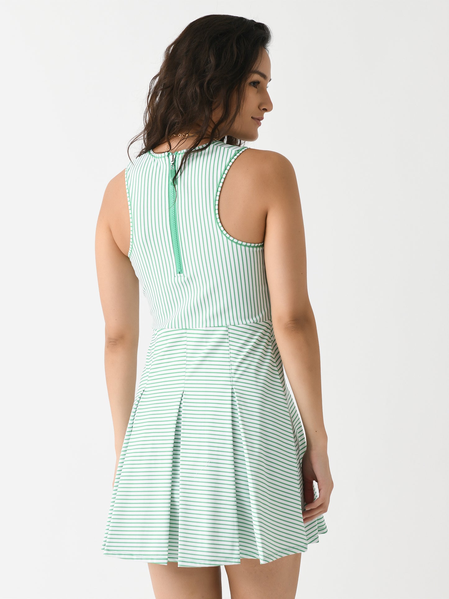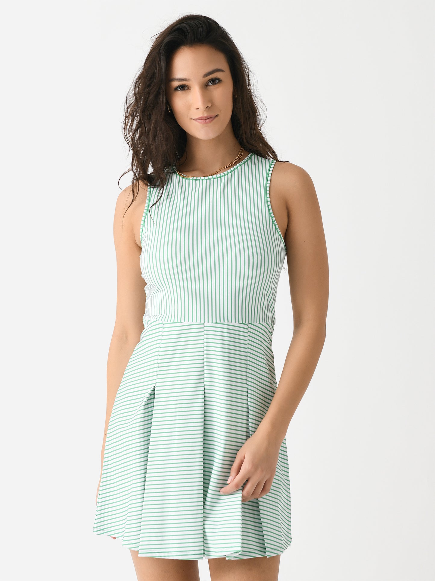 A sporty active dress made from breathable performance fabric with a box-pleat skirt.