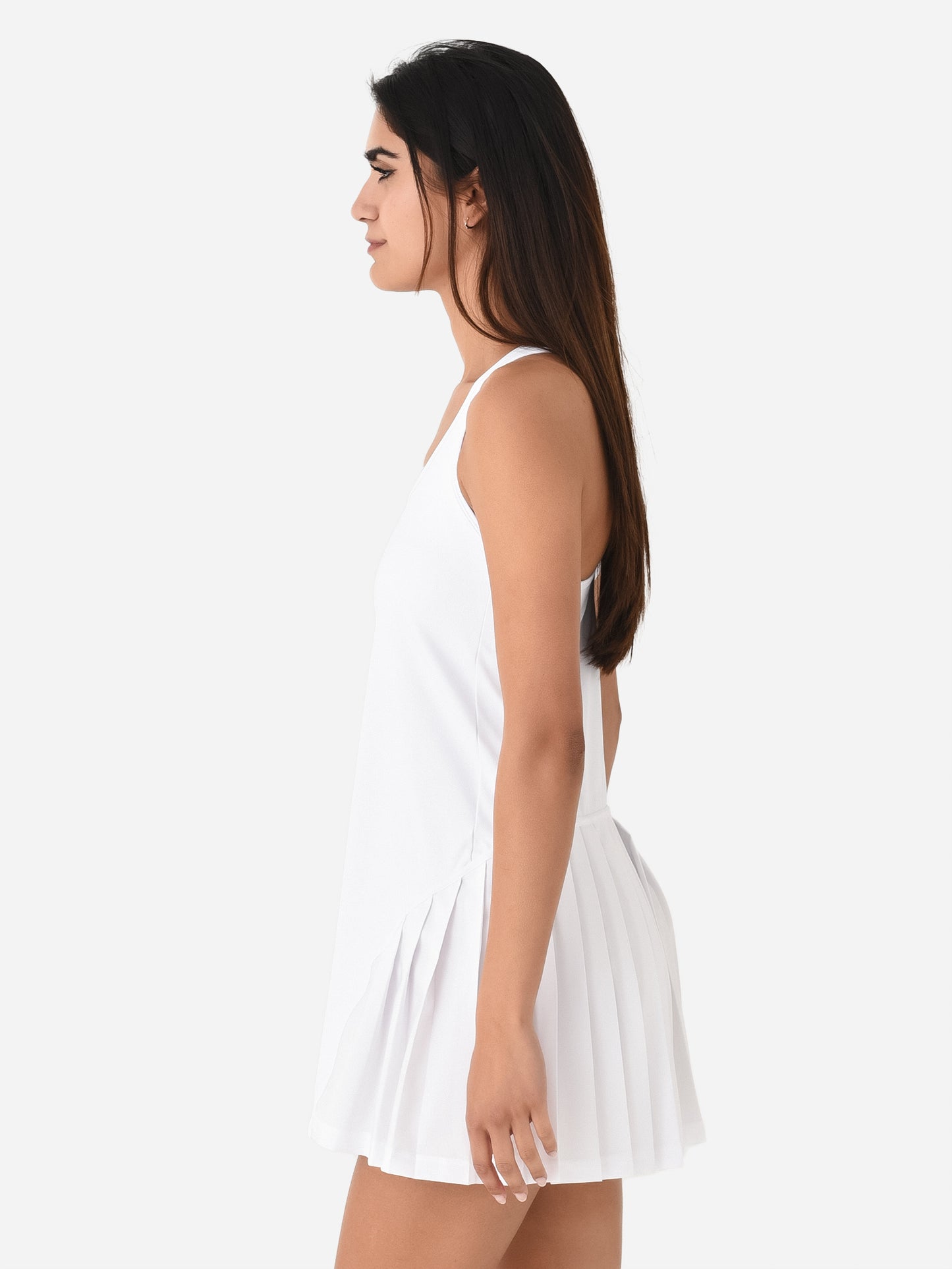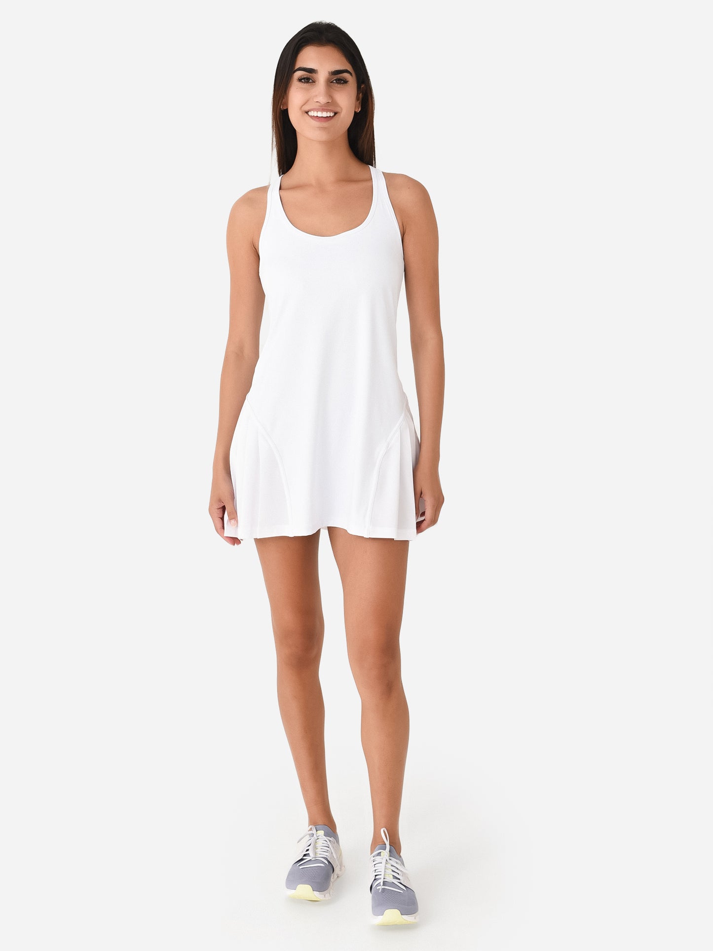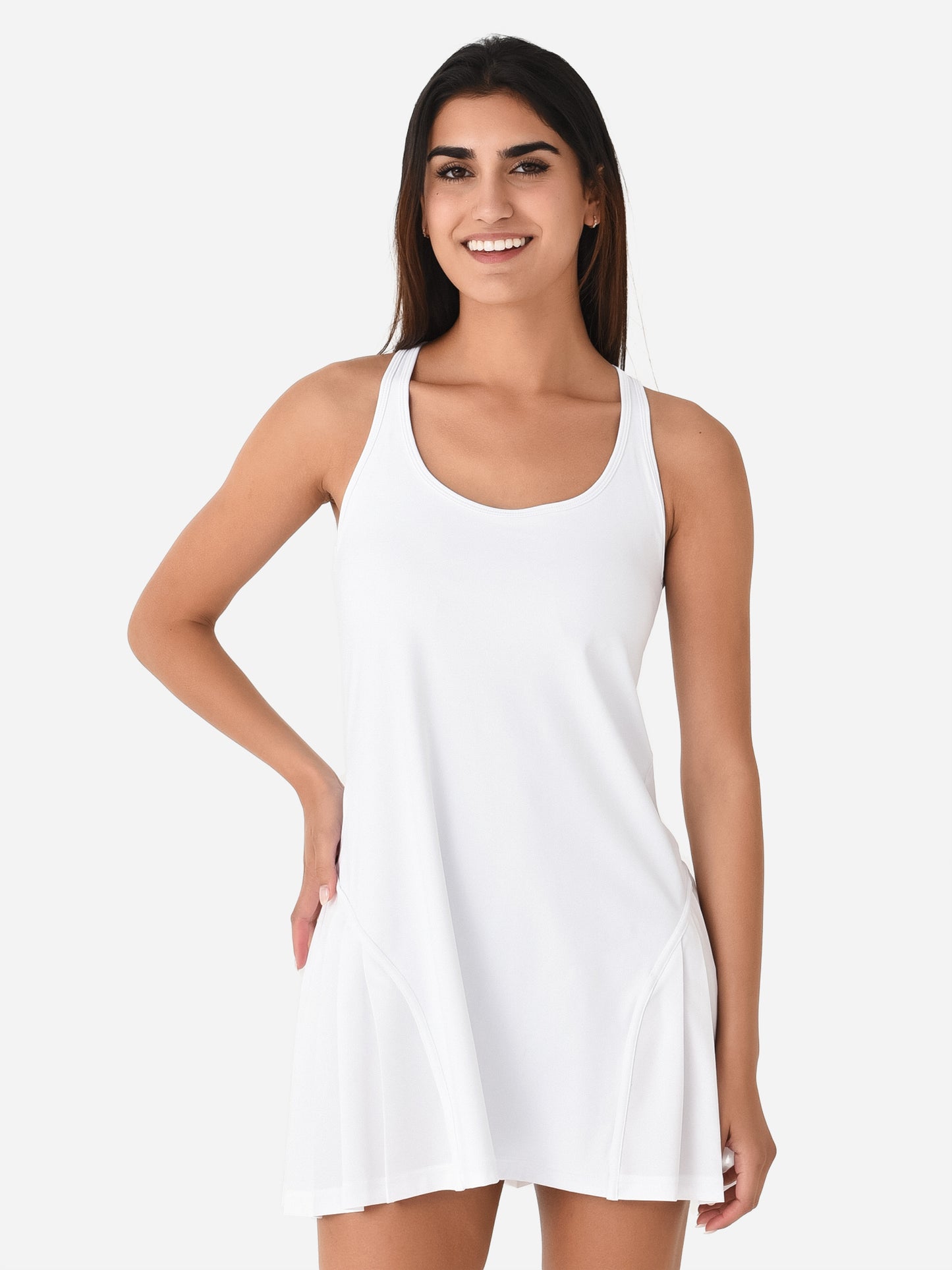Racerback active dress with a built-in bra and pleated skirt.