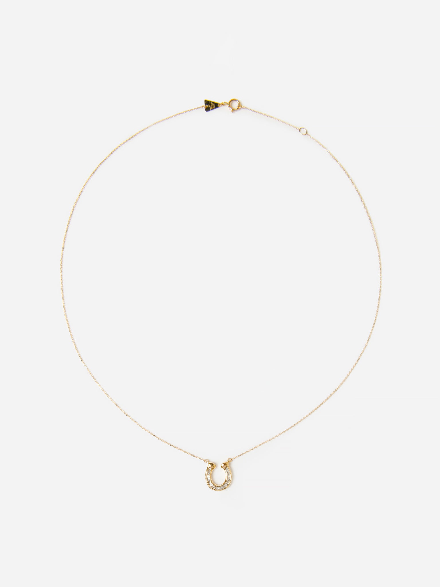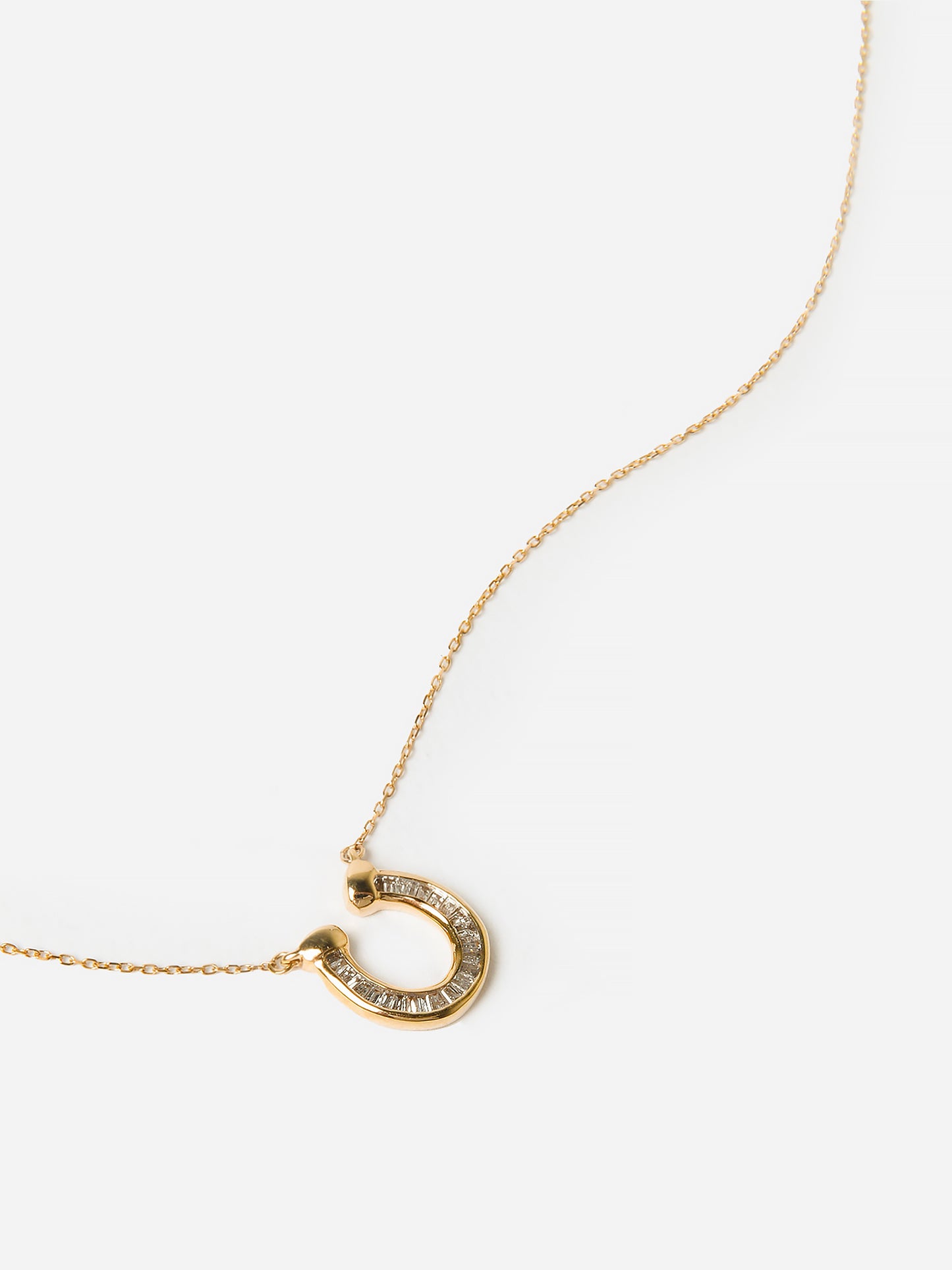 14-karat yellow gold horseshoe pendant necklace with baguette diamonds.