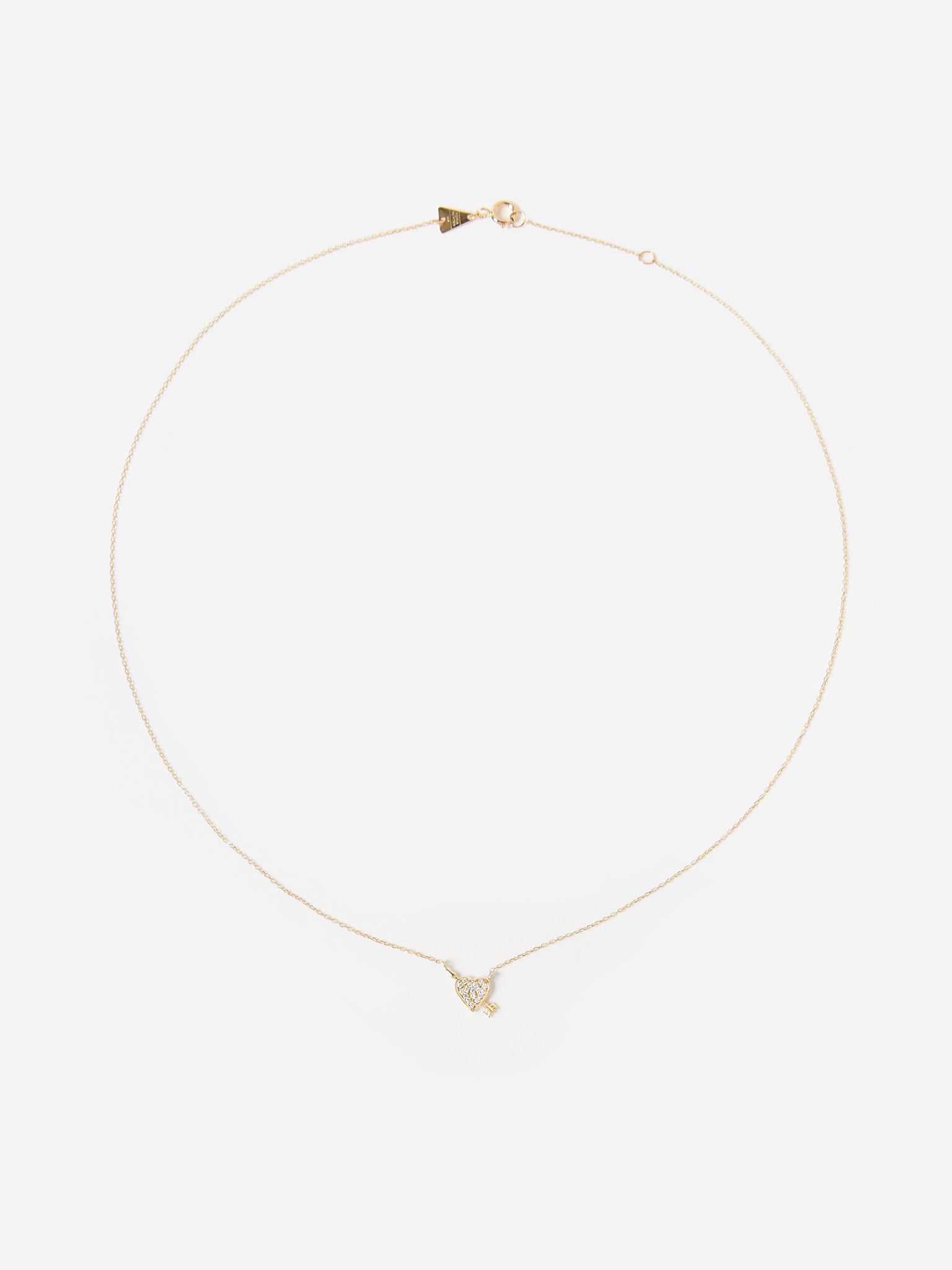 A 14-karat yellow gold necklace featuring a tiny heart and arrow pendant with hand-set pavé diamonds.