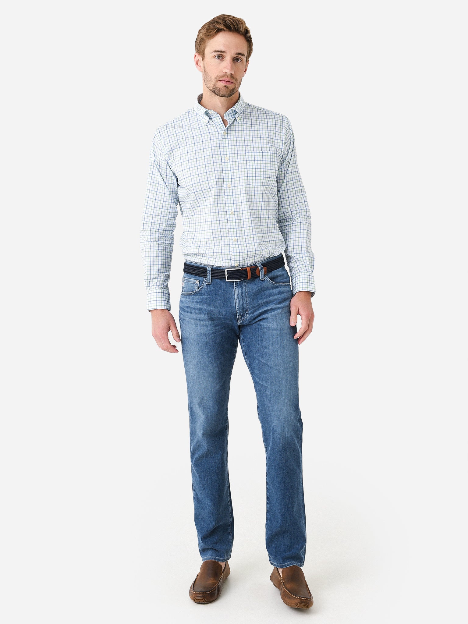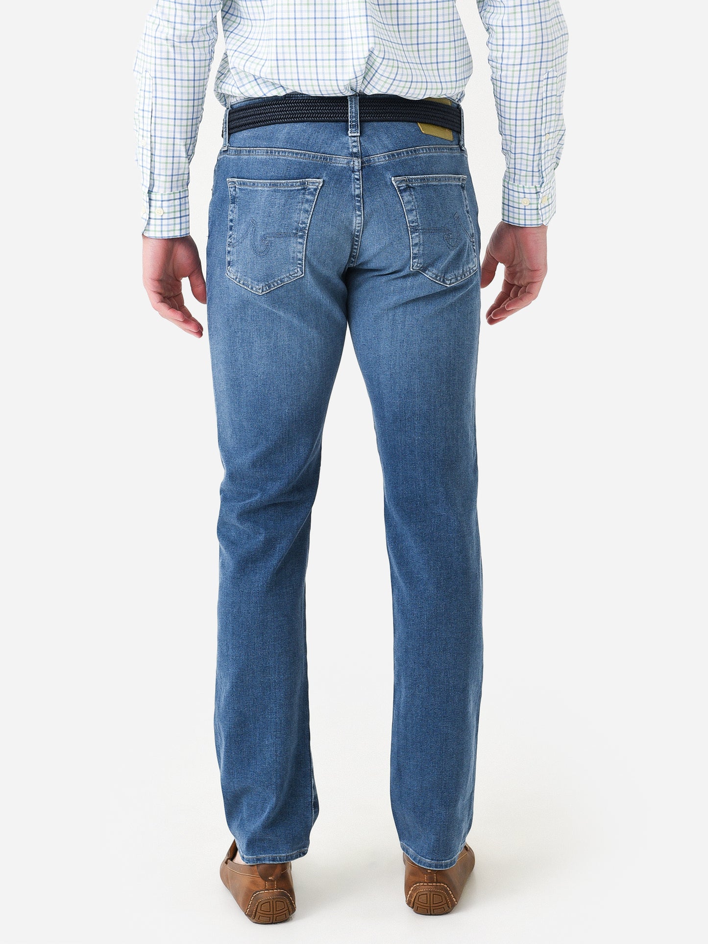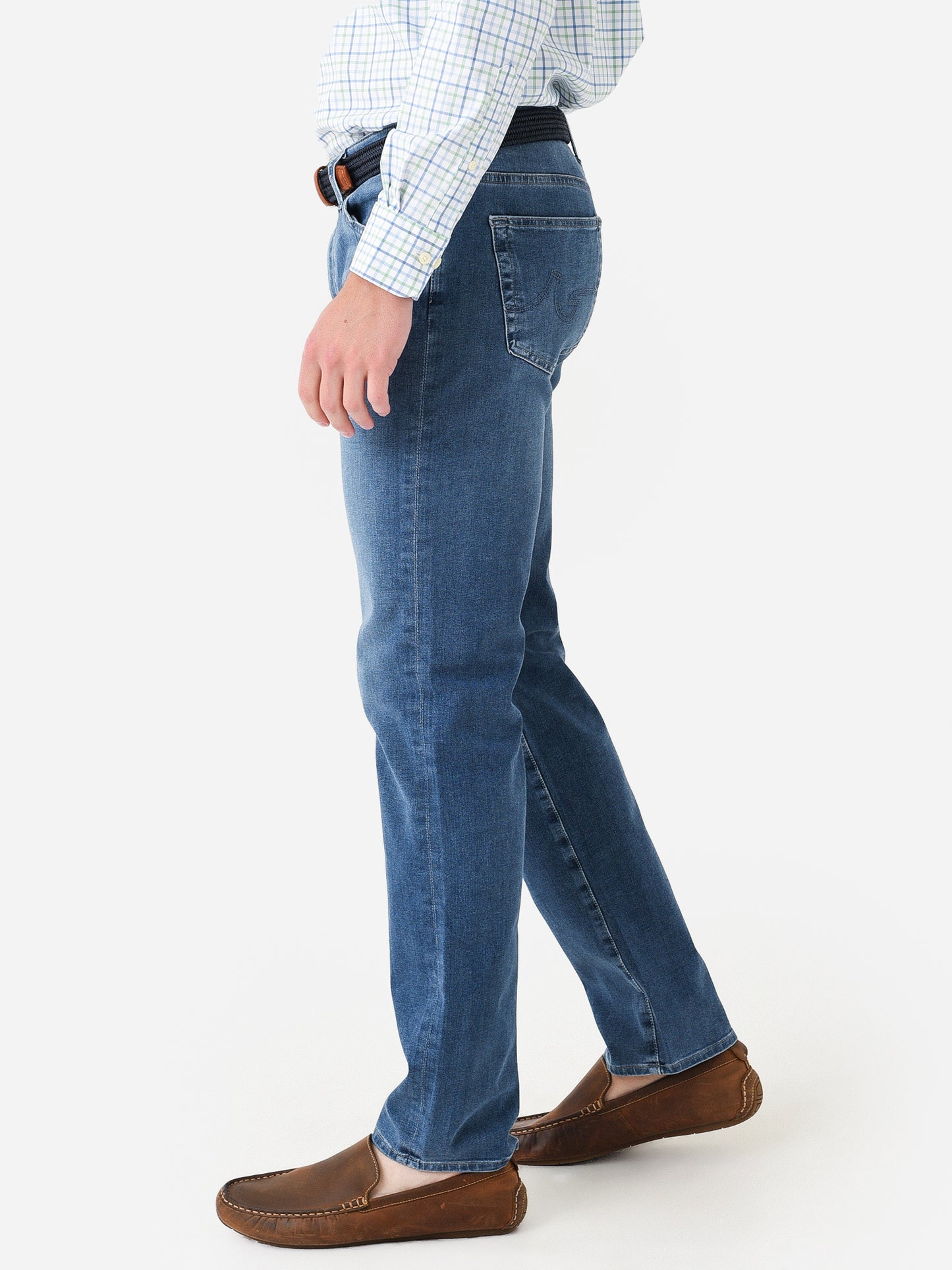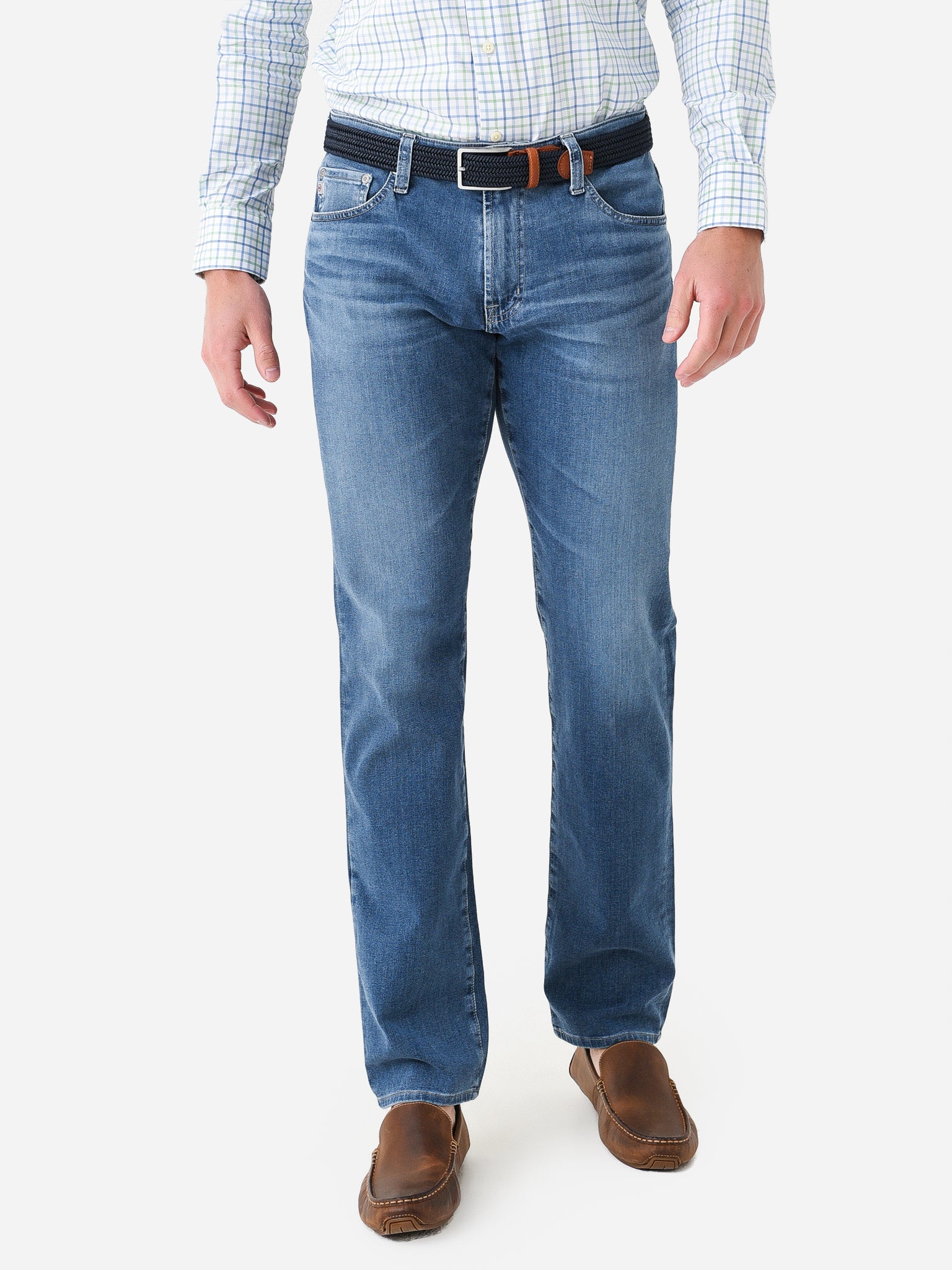 Tailored straight-leg jean made from comfortable stretch denim fabric.