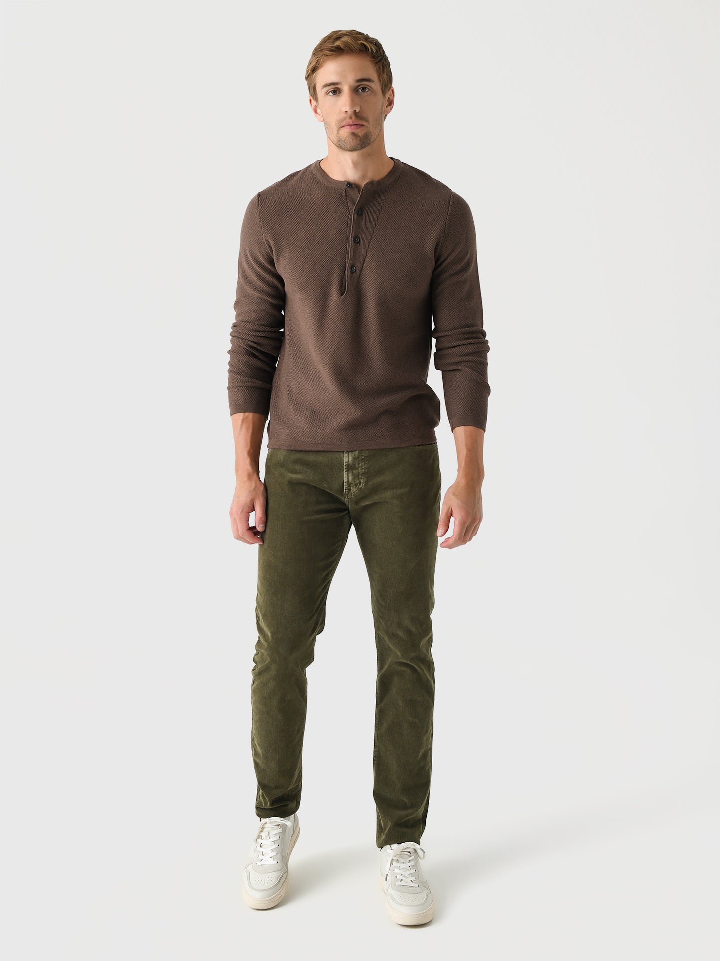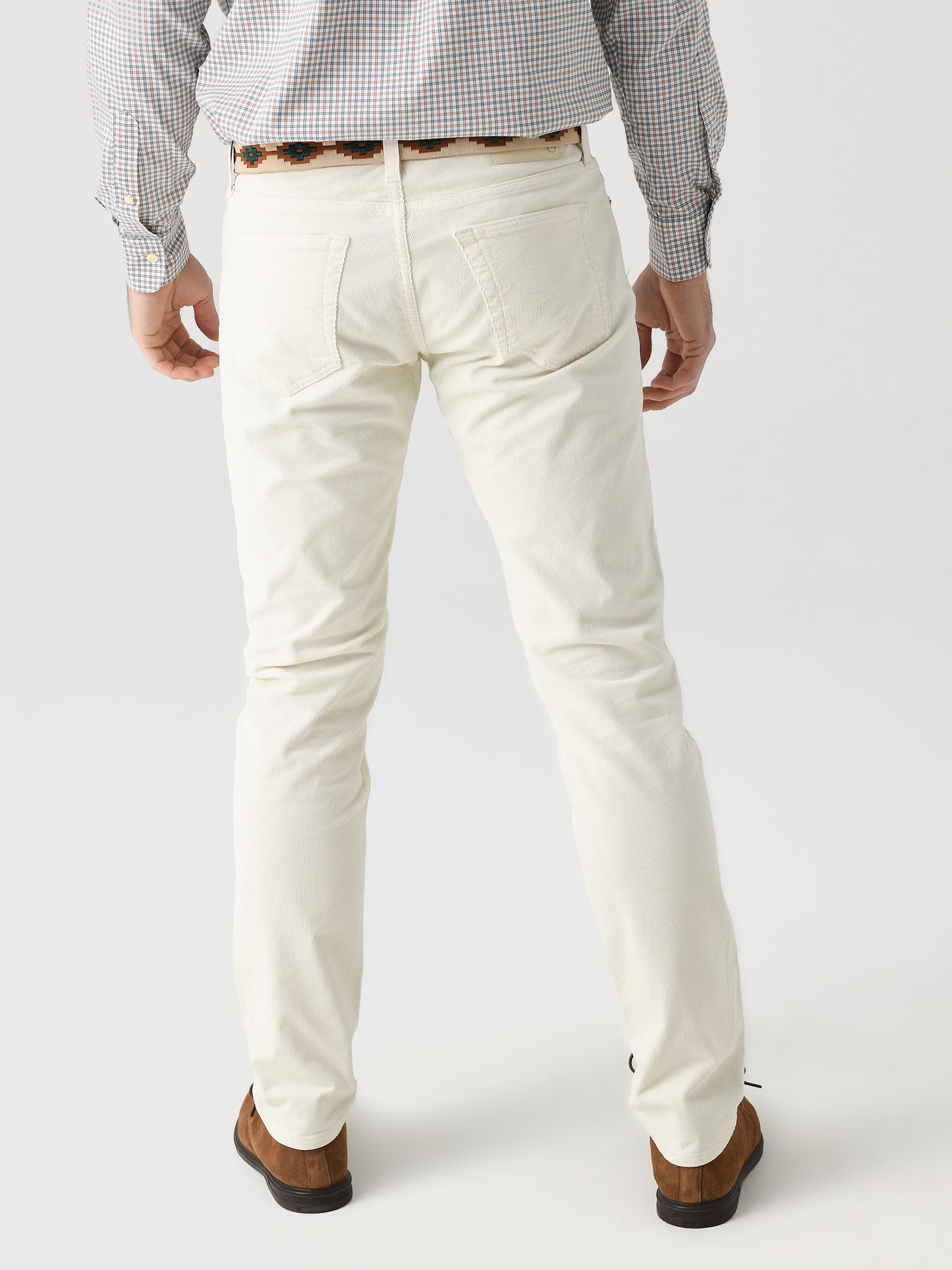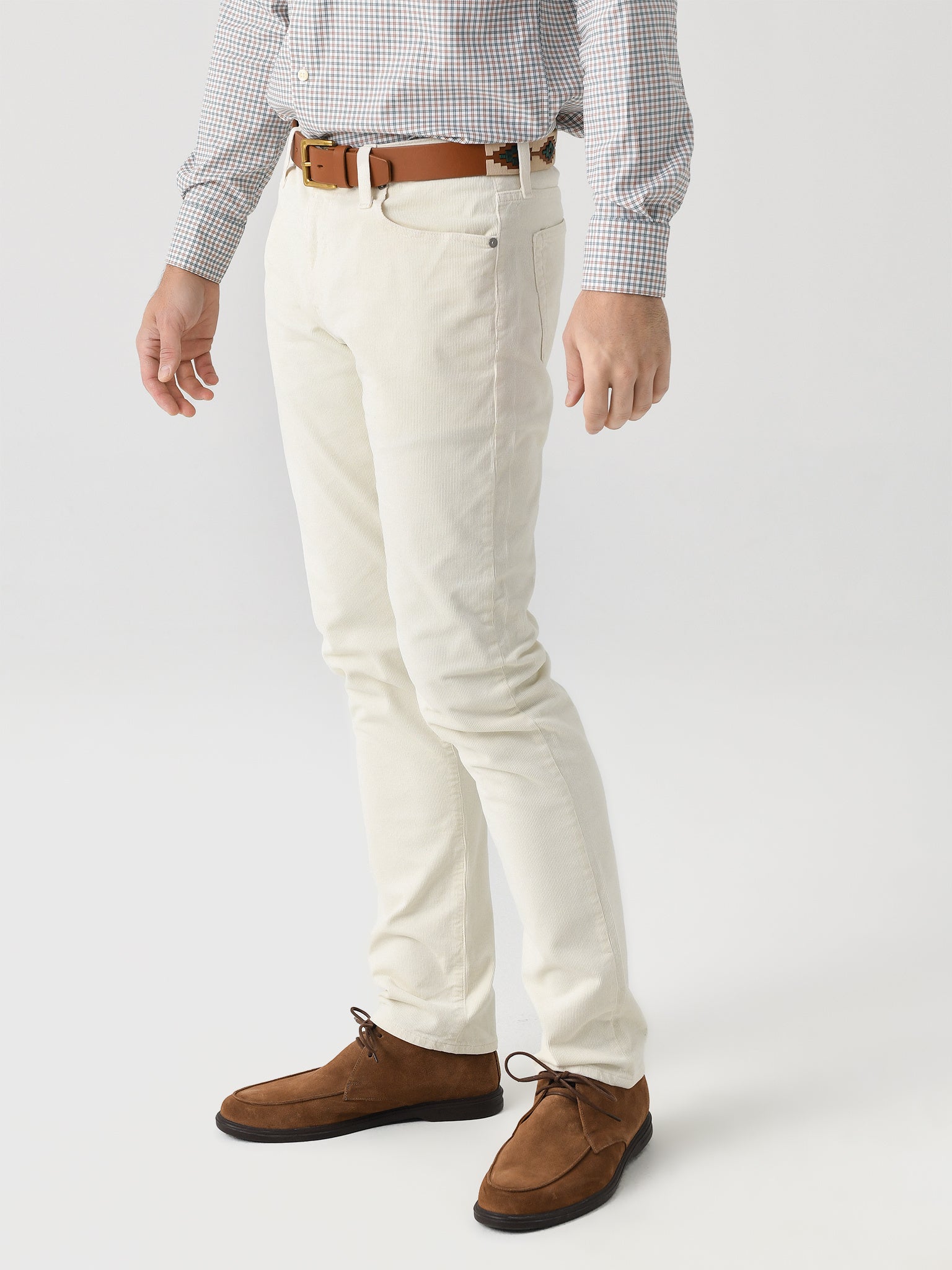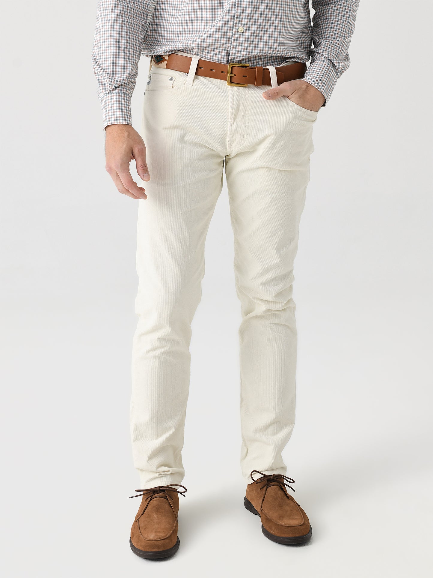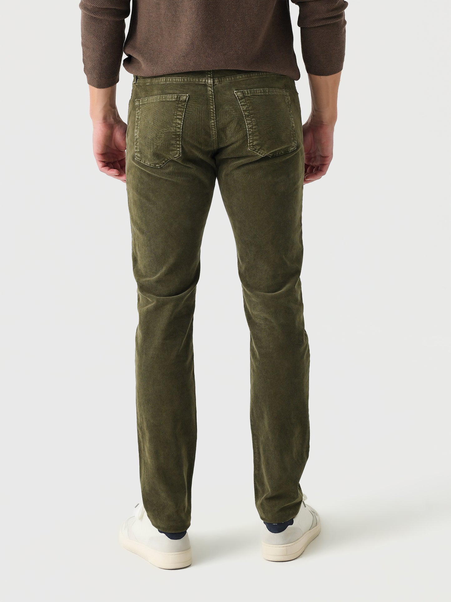 Tapered slim jean made from soft corduroy with shape-recovery technology.
