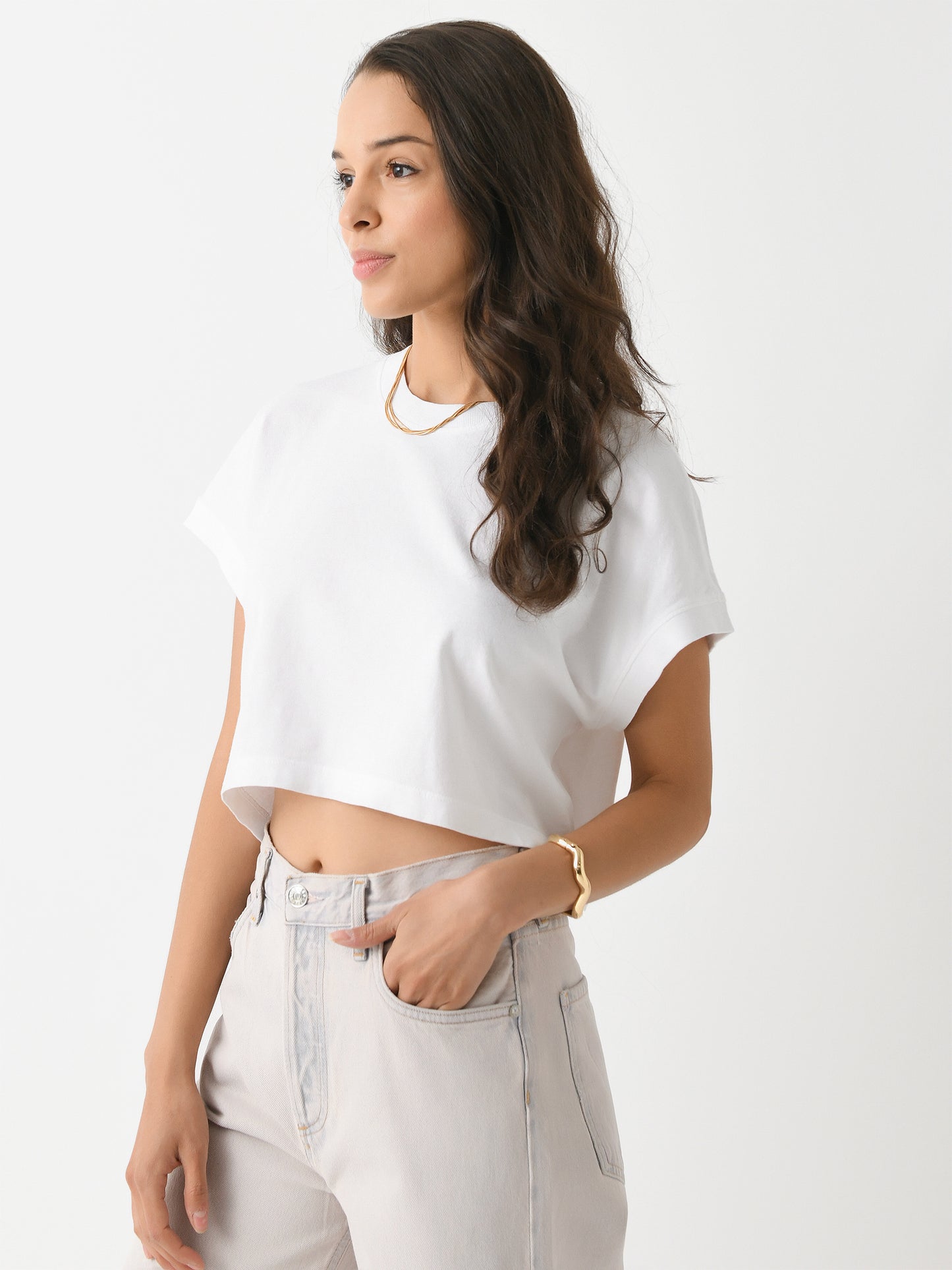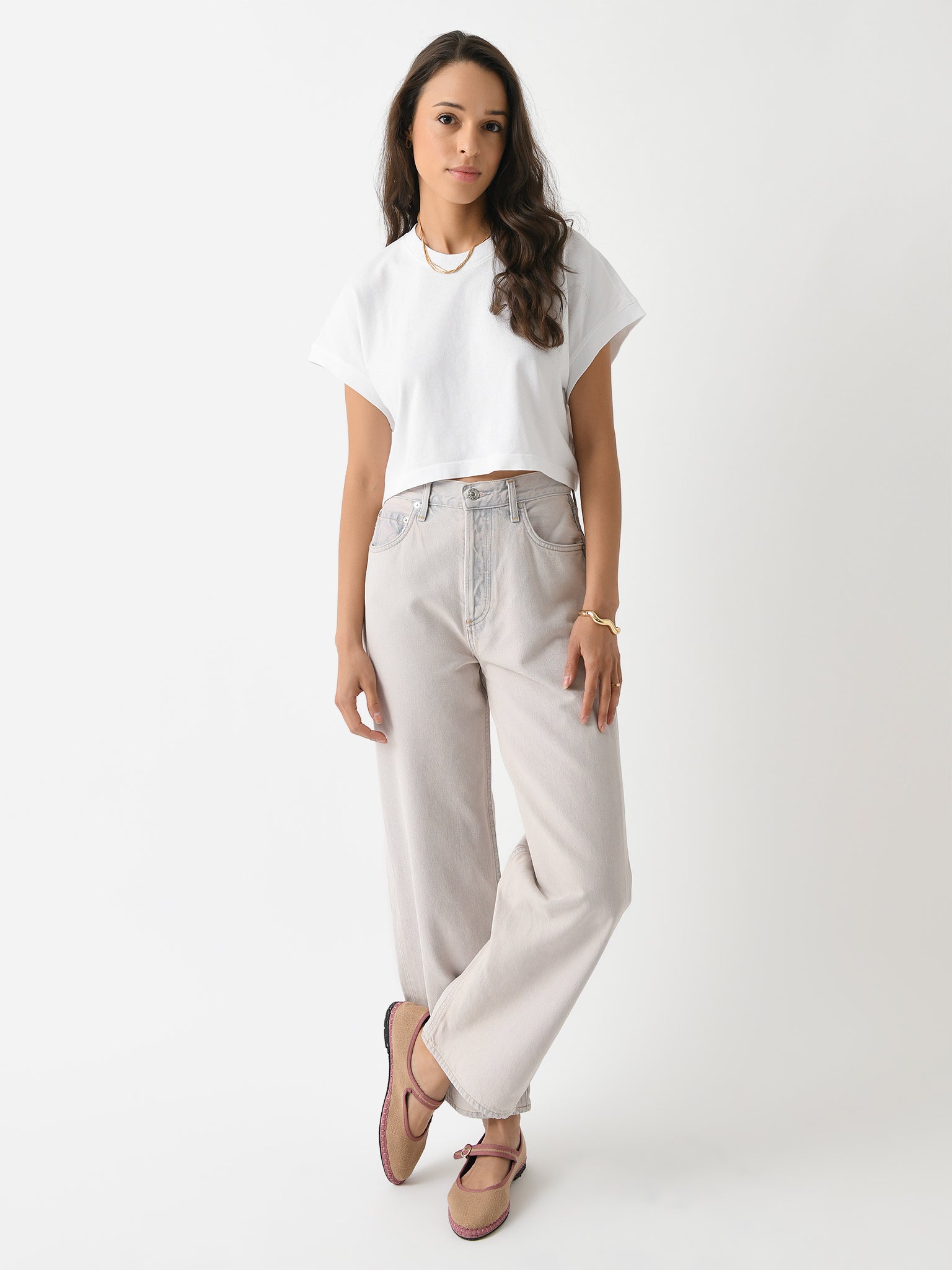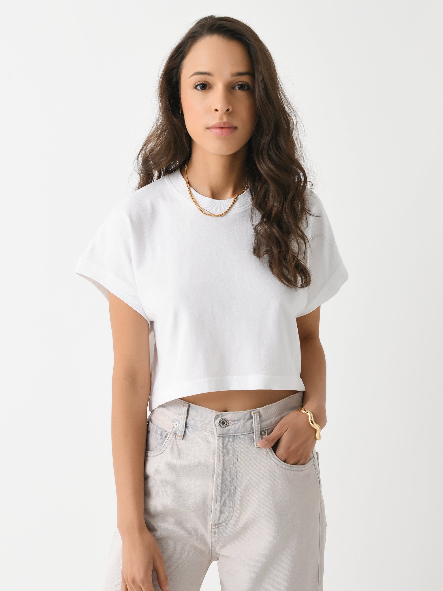 A versatile organic cotton tee with a slightly cropped hem that perfectly compliments high-waisted denim.