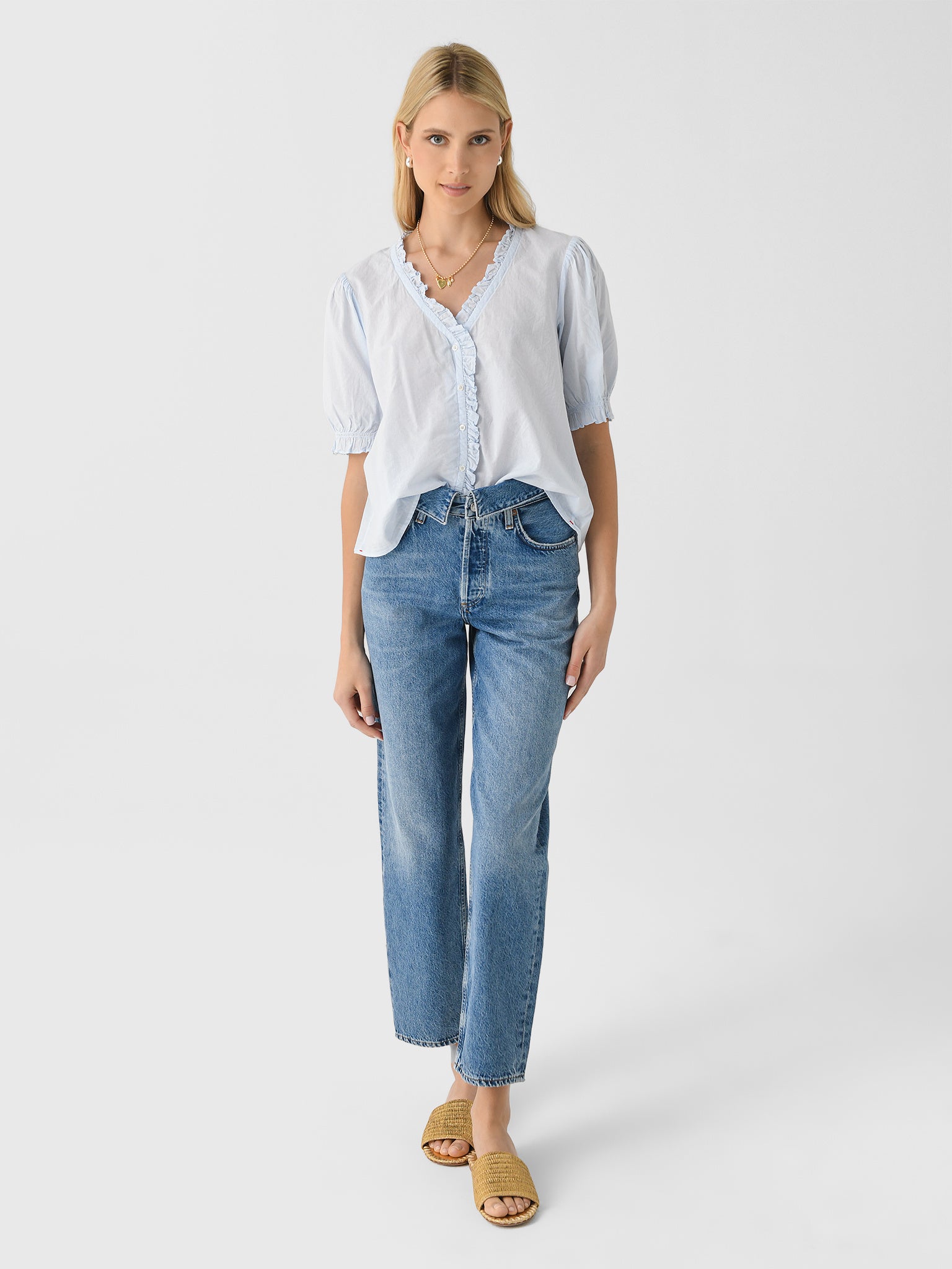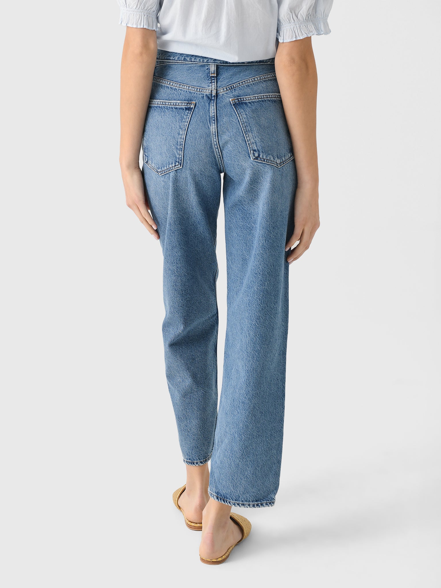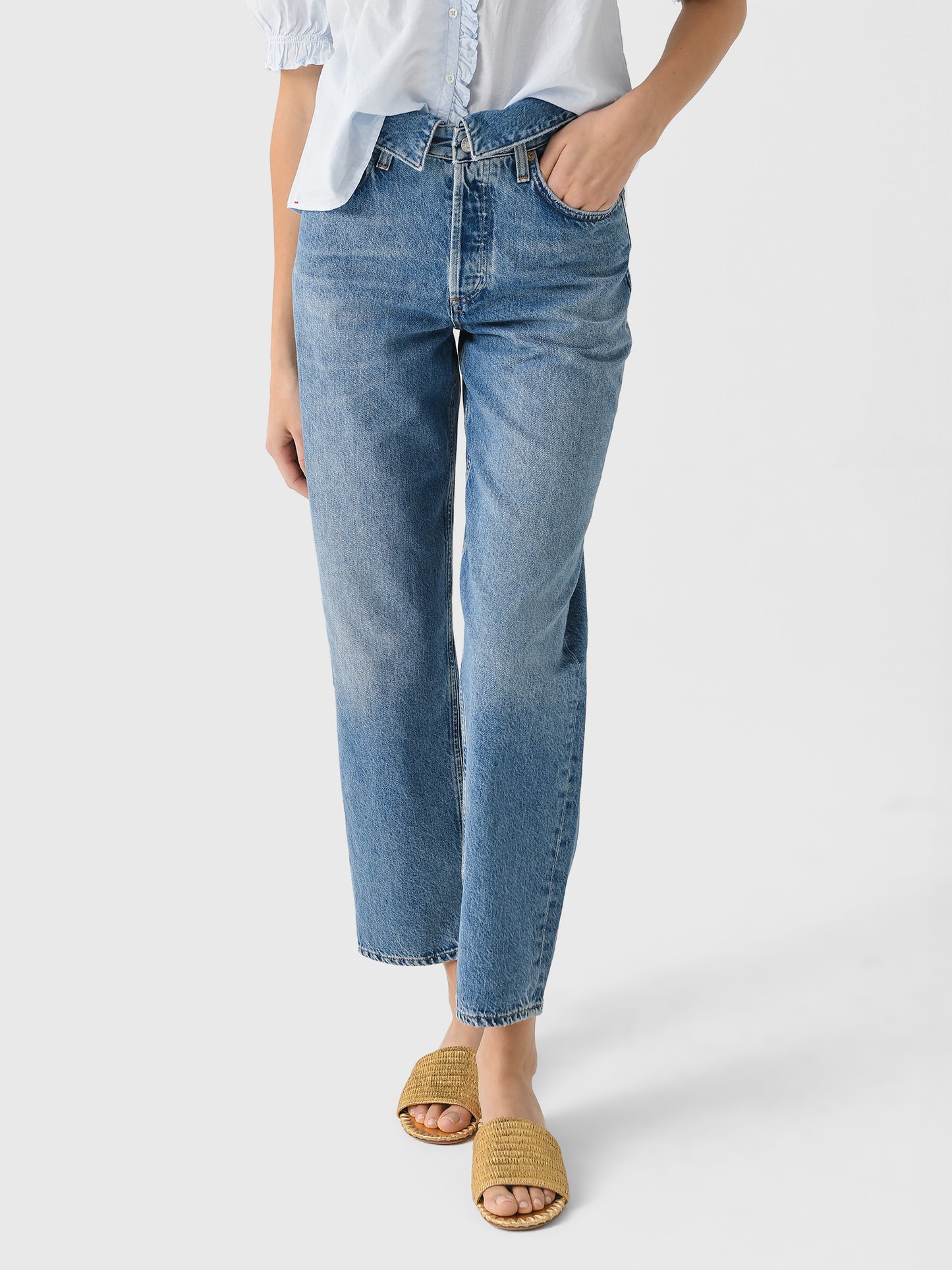 The Echo Jean features a unique folded waistband detail at the high-rise, creating a flattering and modern silhouette. With a roomy fit through the leg, it gently tapers to a flattering ankle-length inseam, offering a tailored and contemporary look.