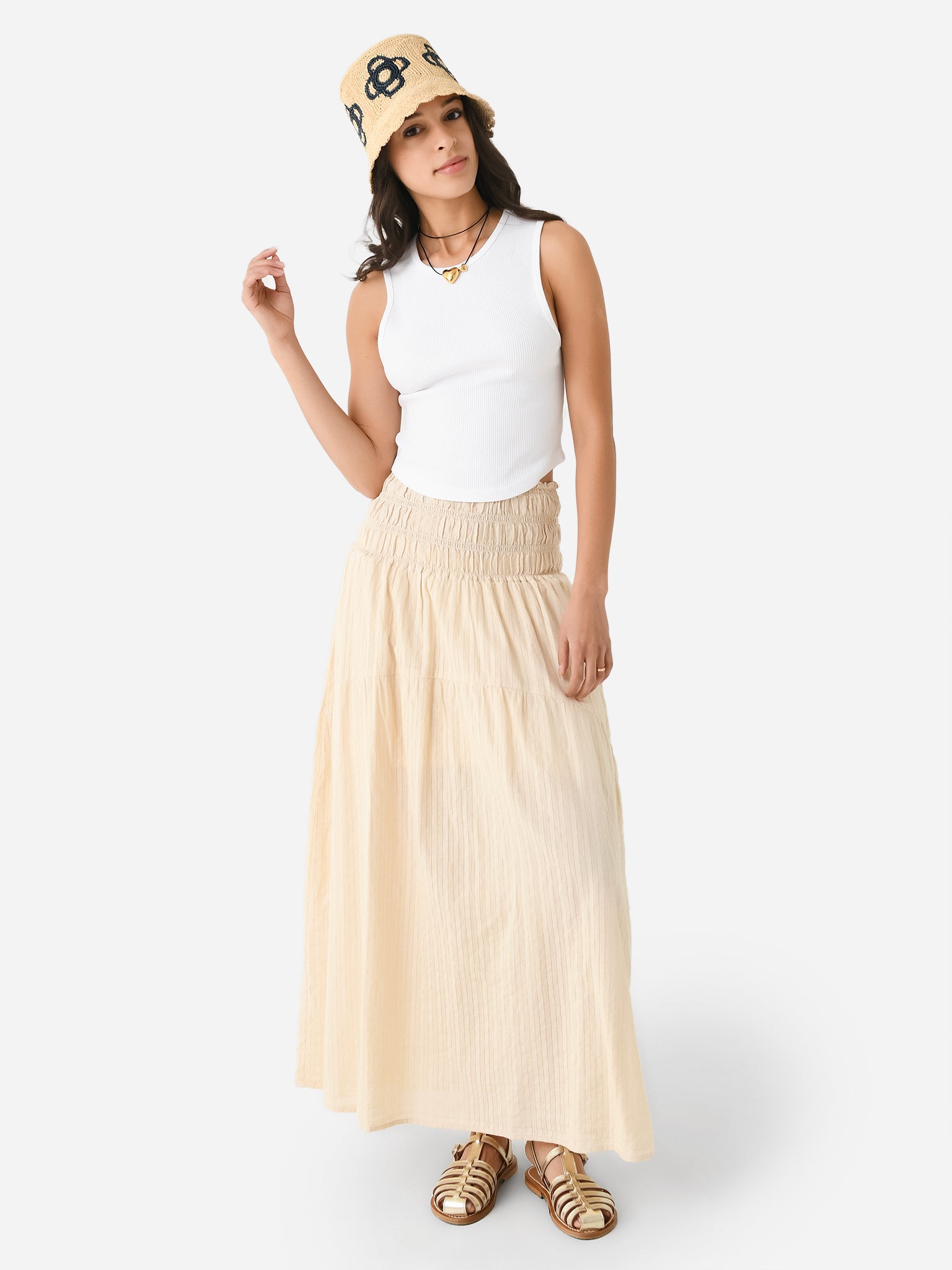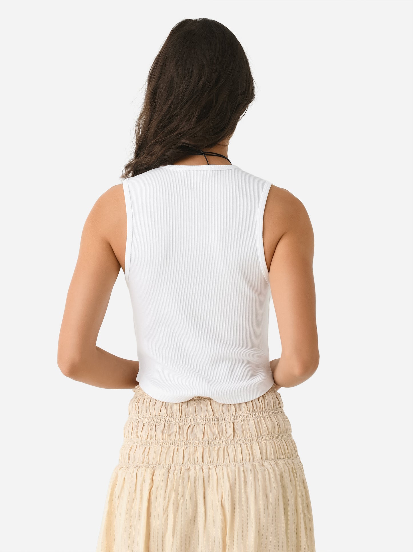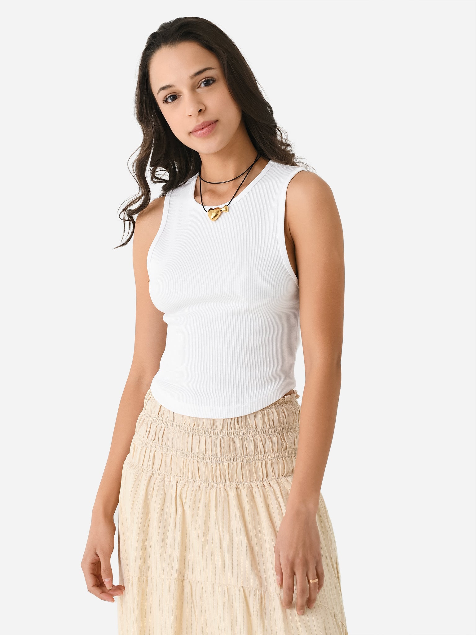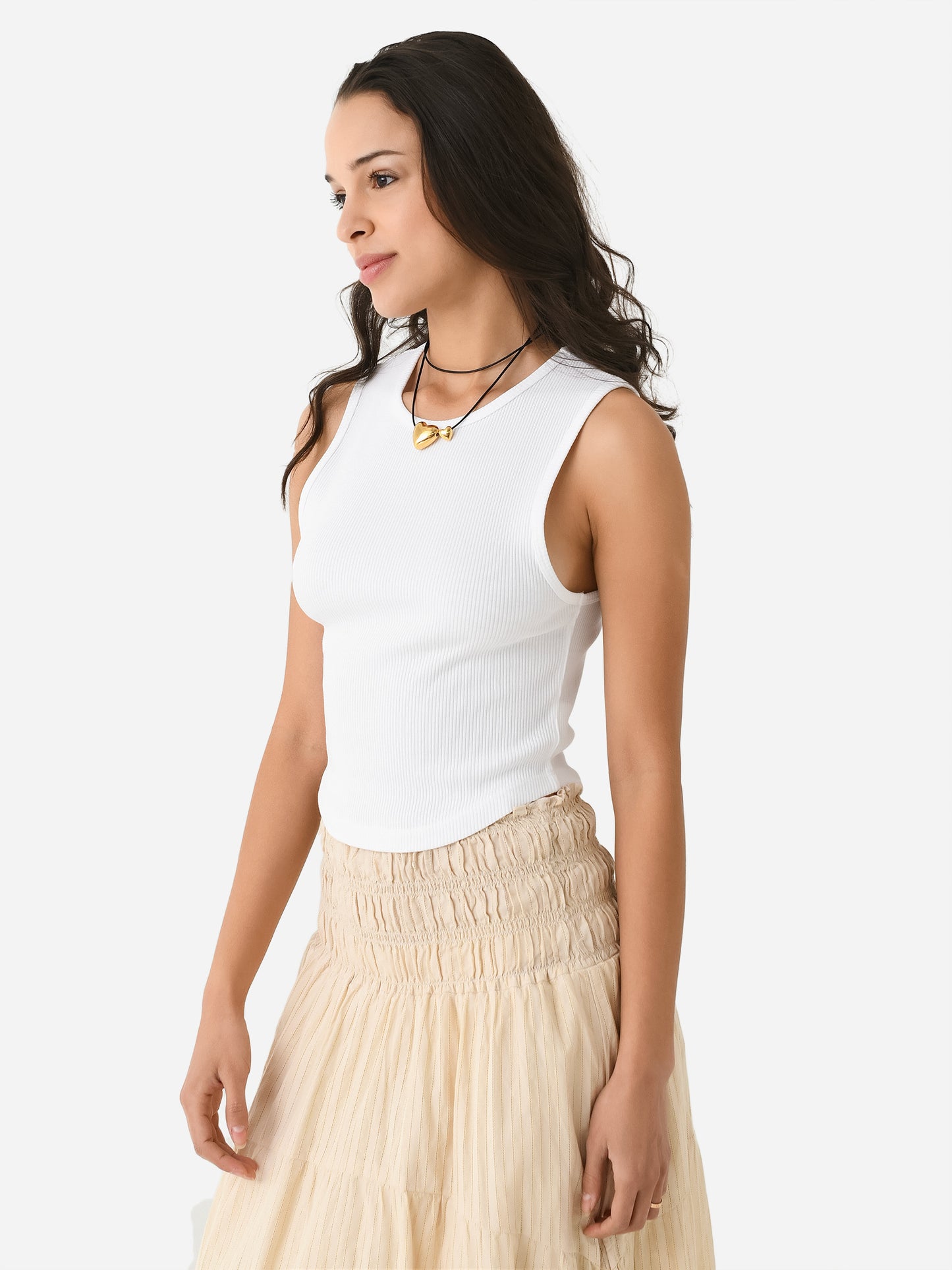 A form-fitting tank top crafted from ribbed fabric with an angled cropped hem.