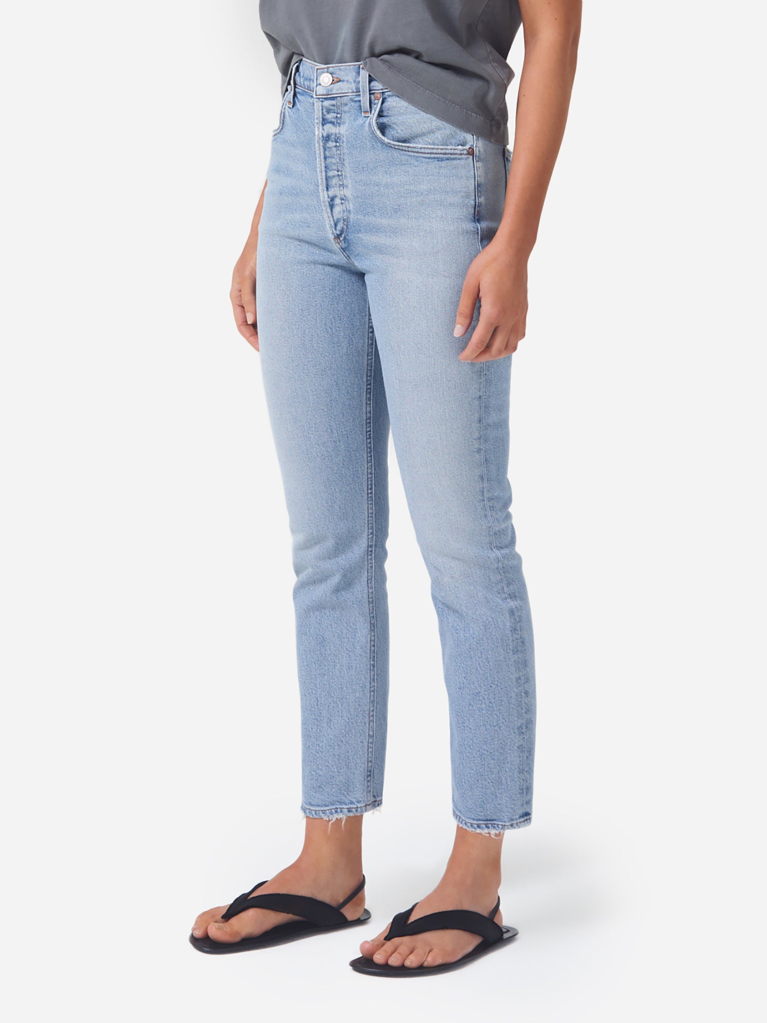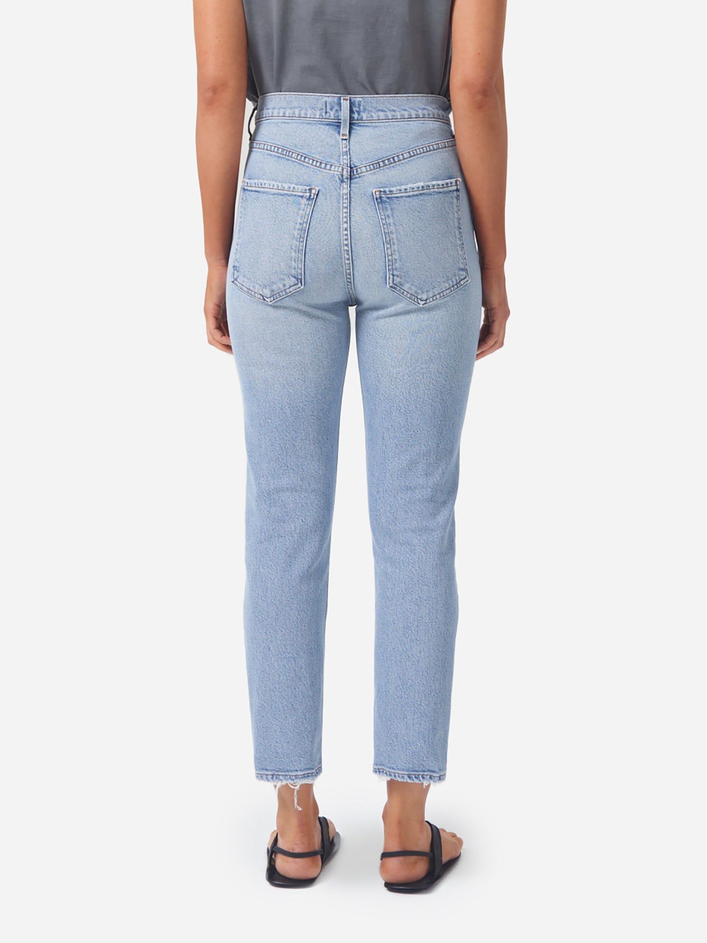 Flattering high-waisted straight jean with a subtly cropped silhouette.