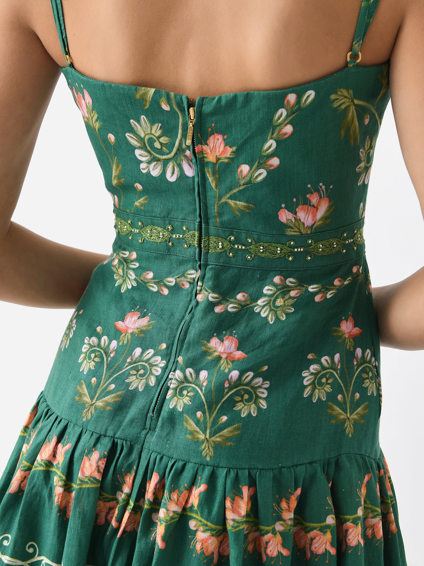 A lightweight linen dress featuring a drop-waist design and a custom intricate floral print.