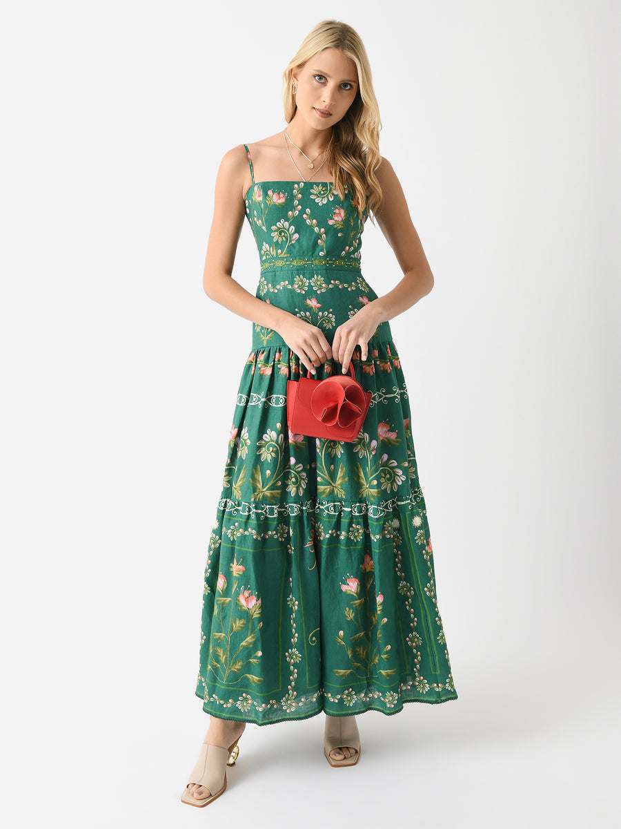 A lightweight linen dress featuring a drop-waist design and a custom intricate floral print.