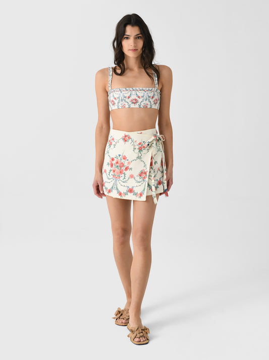 This high-waisted bikini bottom features a ruched trim waistband and a playful floral print.
