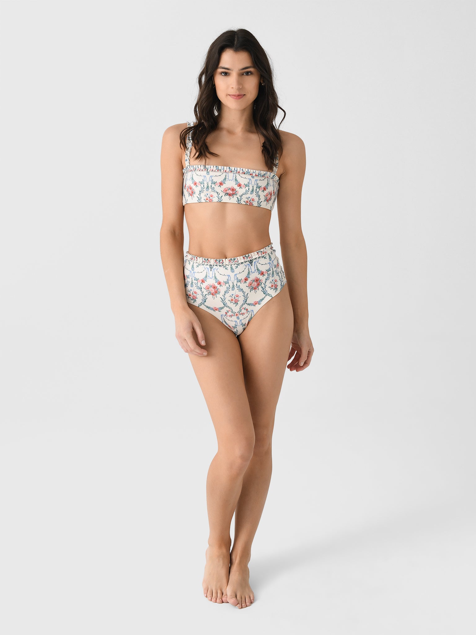 This bandeau-inspired bikini top features ruched straps and a bright floral print.