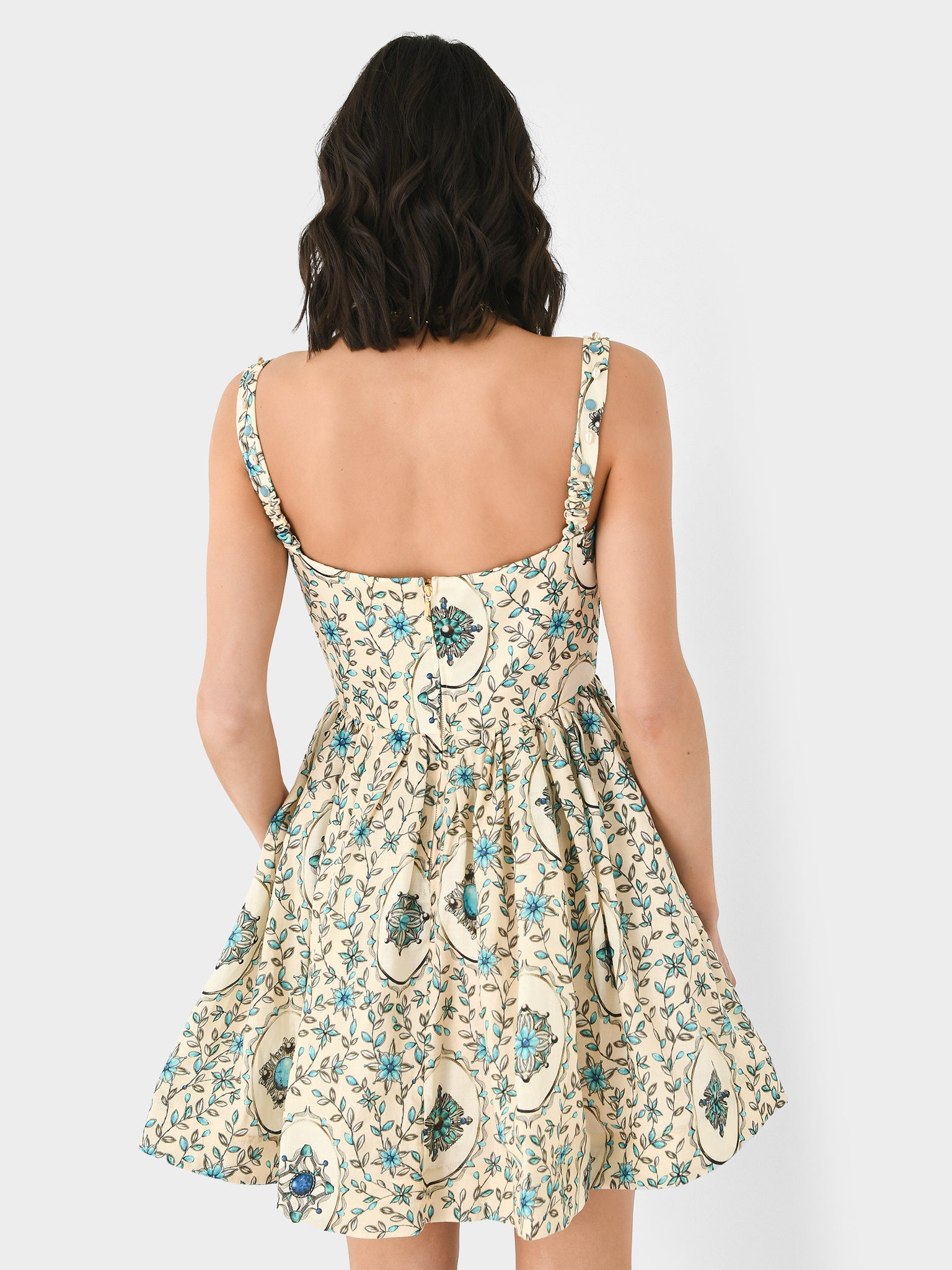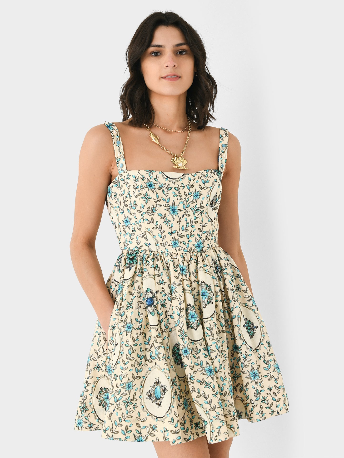 A beautiful mini dress made from lightweight linen fabric with a custom jewel-toned print and embellished straps.