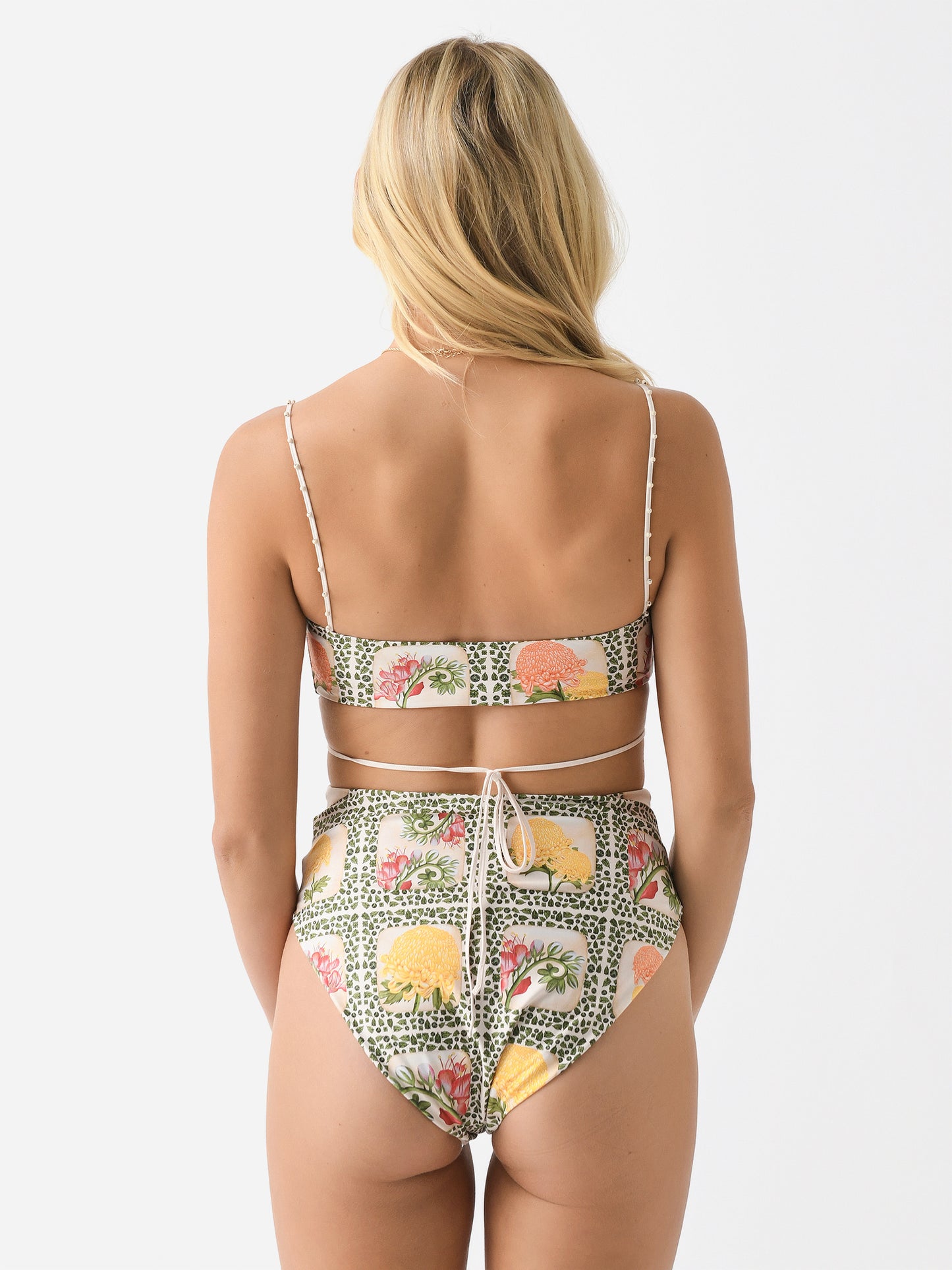 A floral-printed one-piece swimsuit with cutout details and a back tie closure.