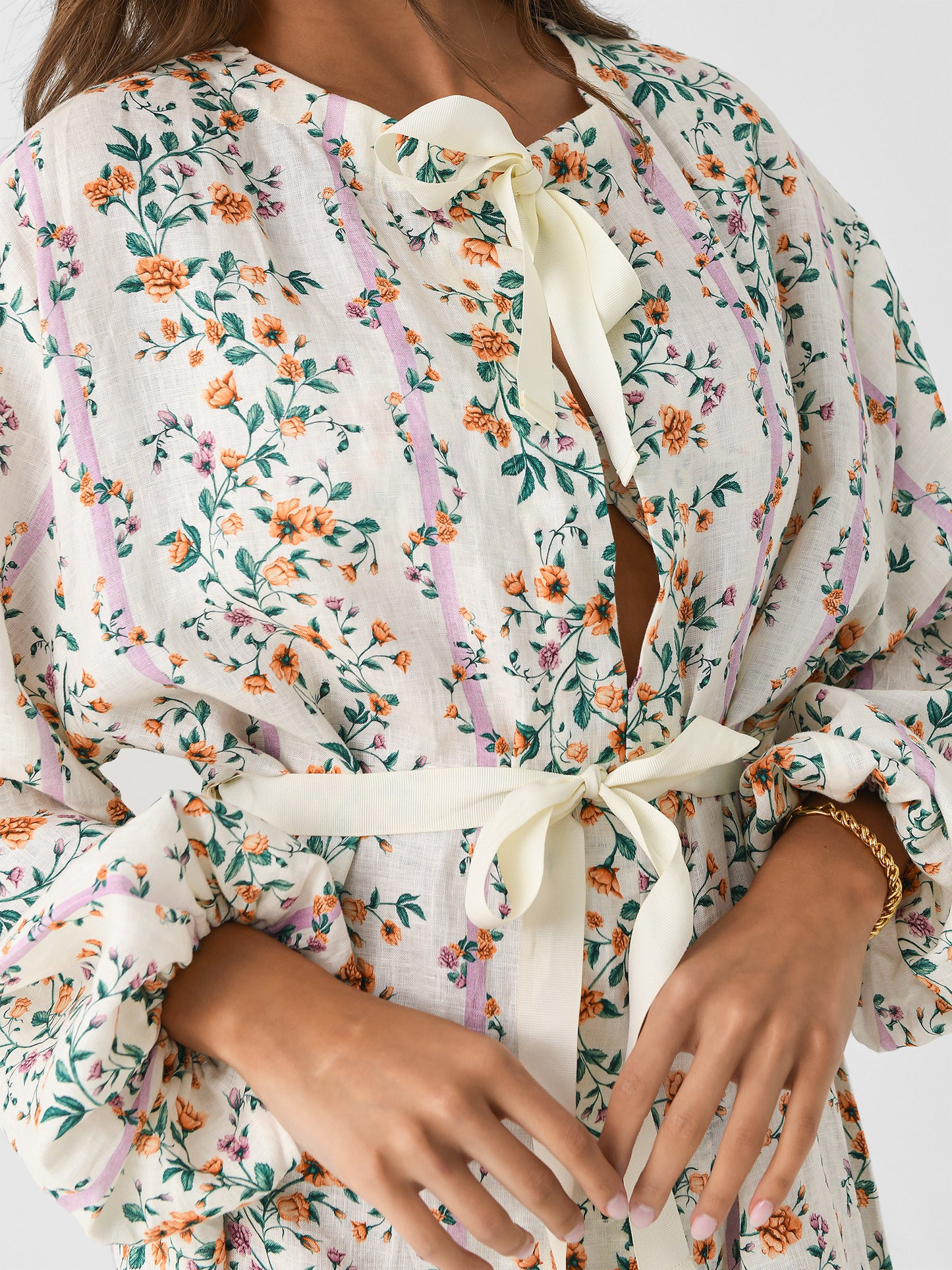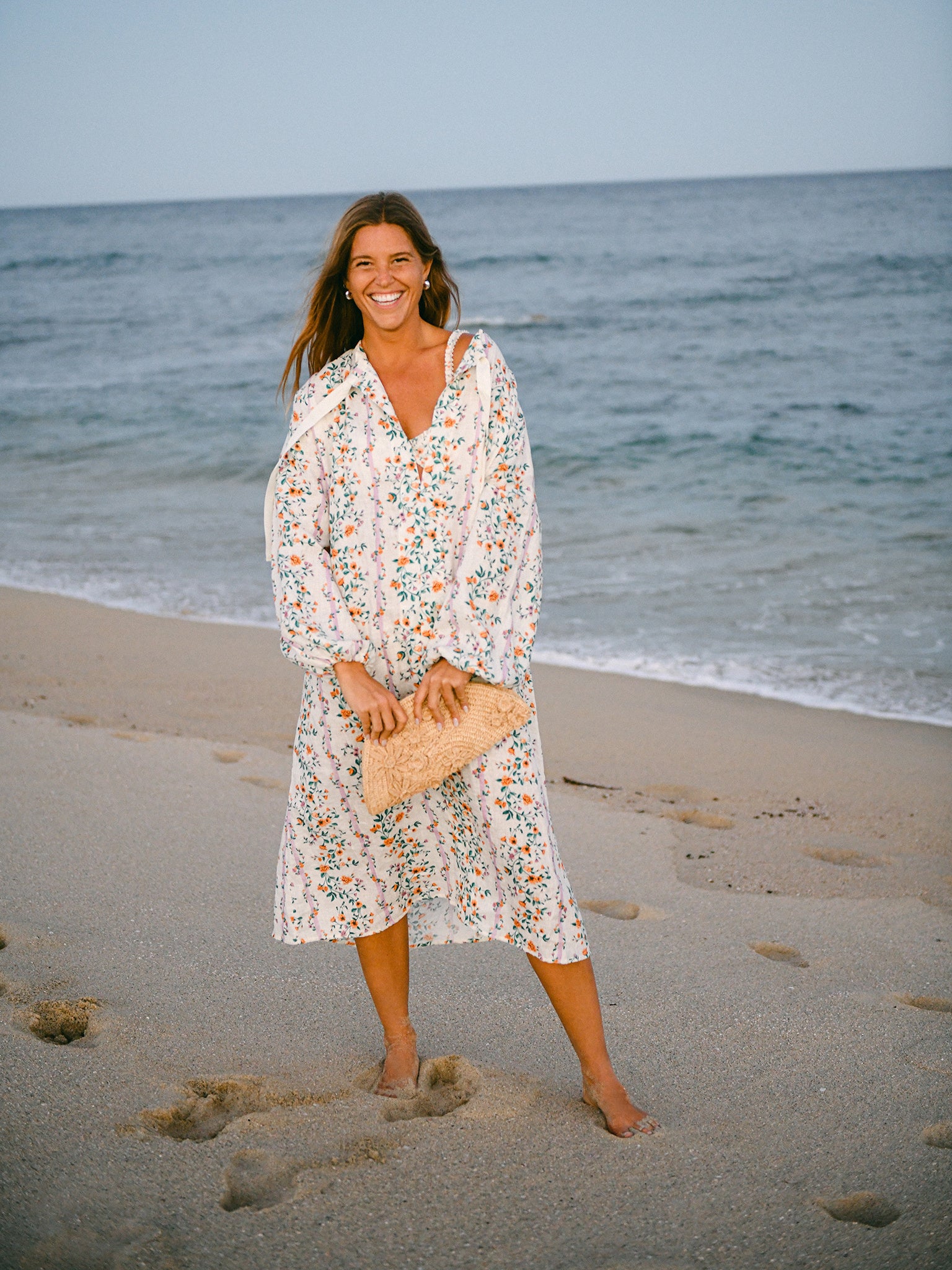 This effortlessly chic dress features blouson sleeves, a flattering straight cut, and a pink and orange ditsy floral print.