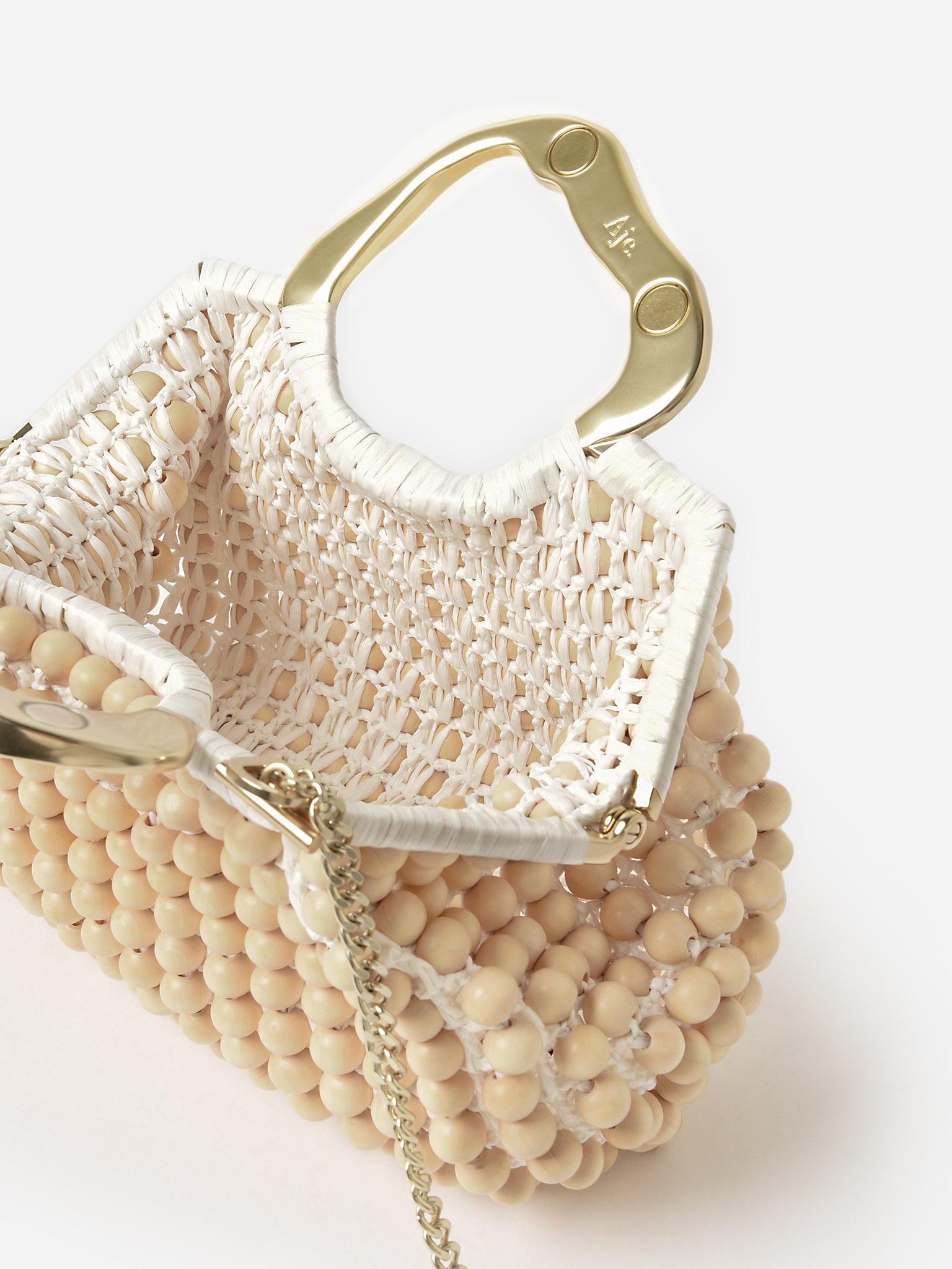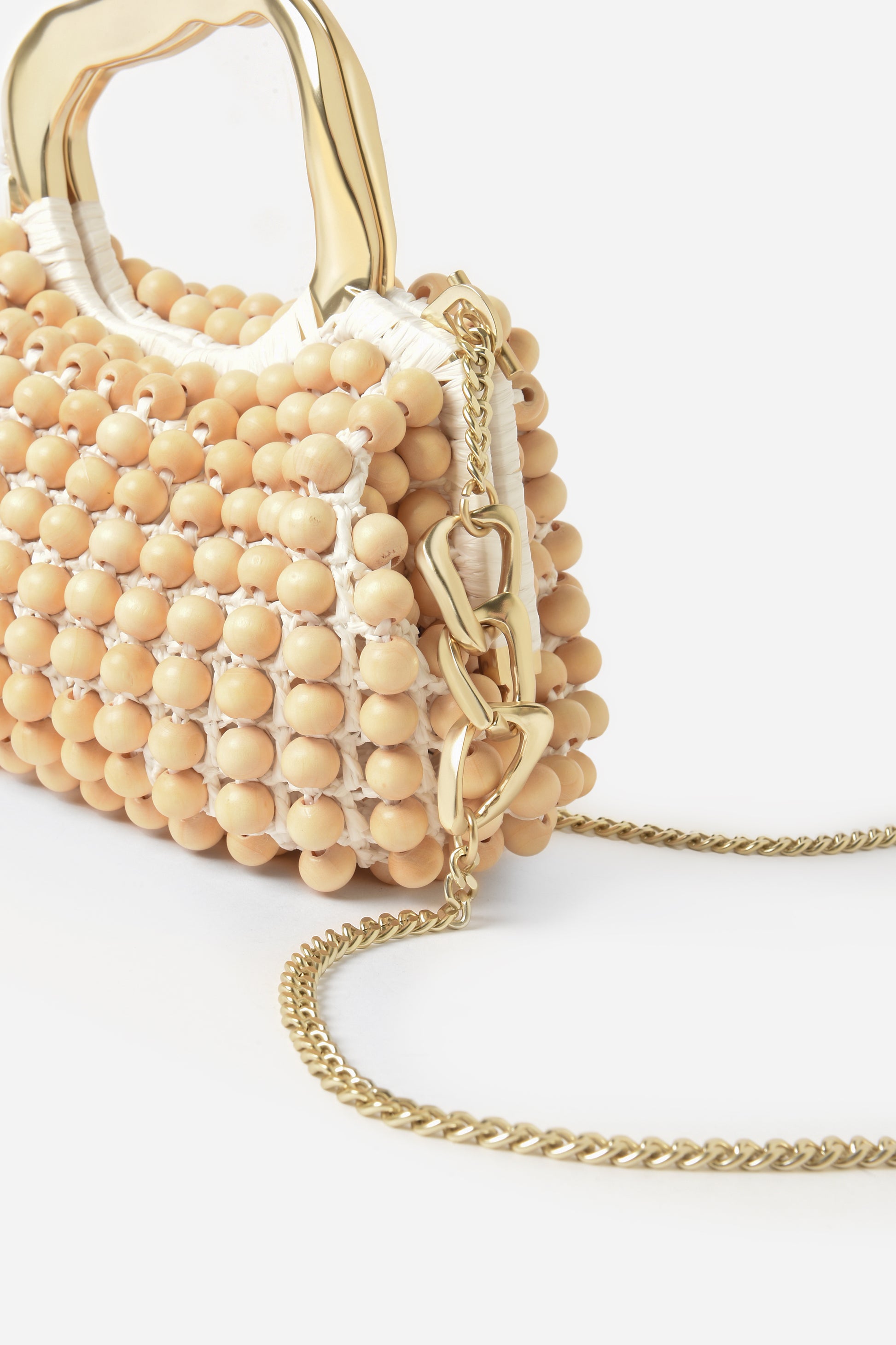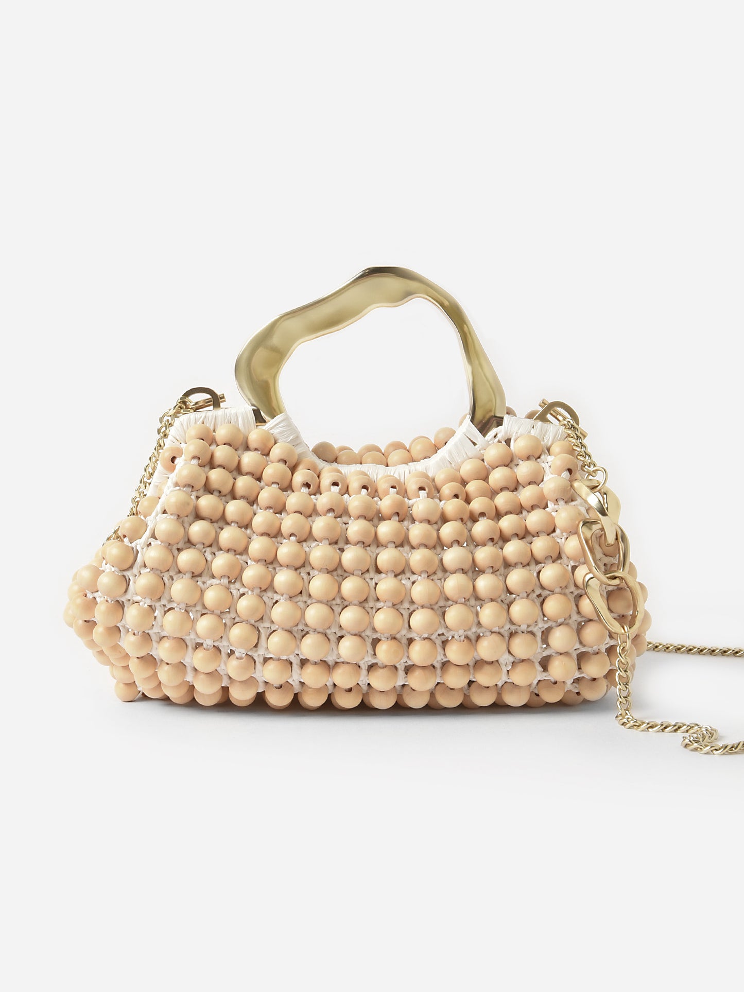A crochet clutch with organic-shaped metal handles, a removable chain, and wooden beads throughout.