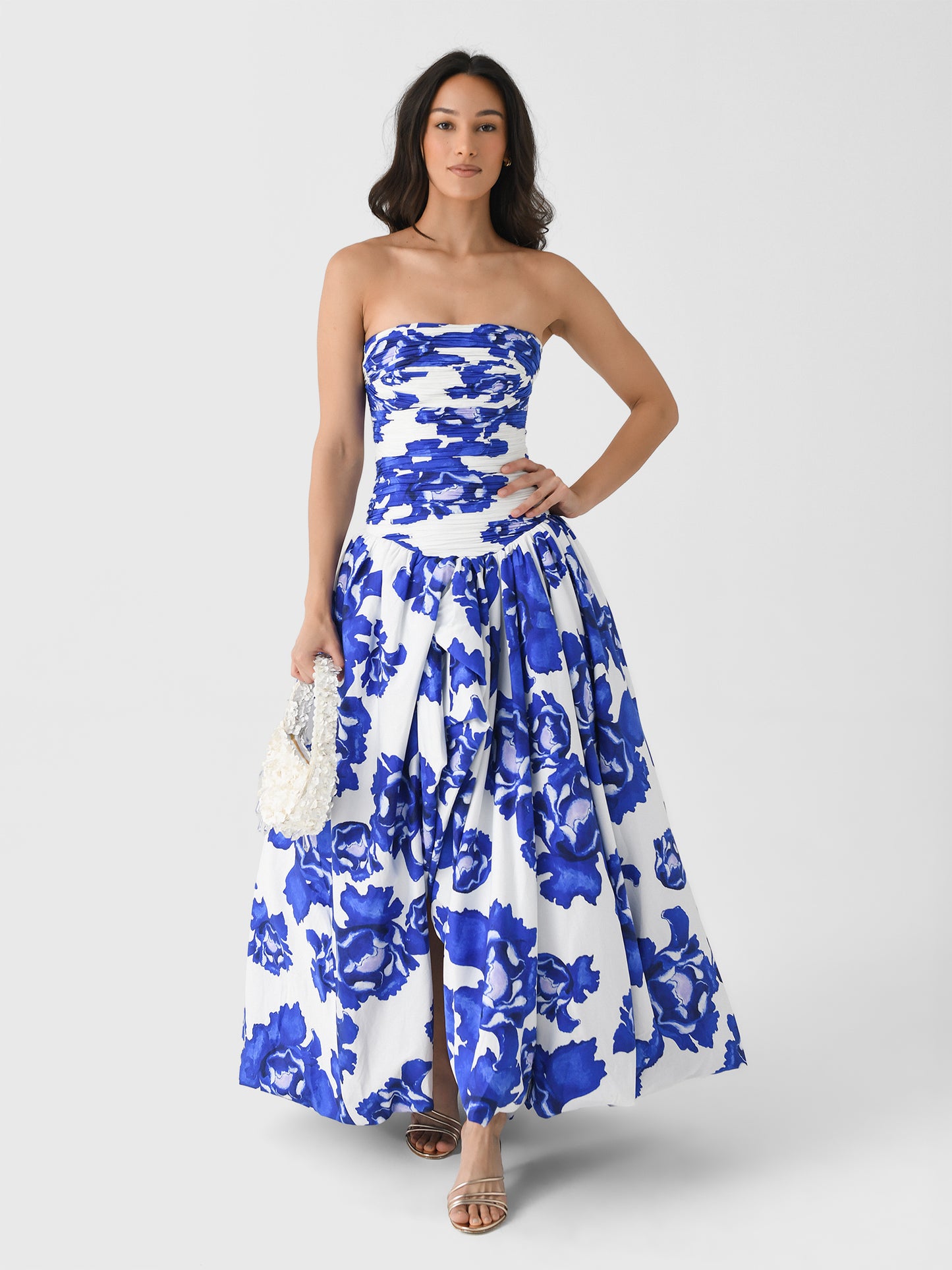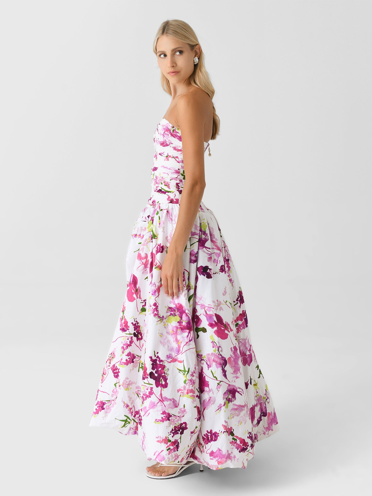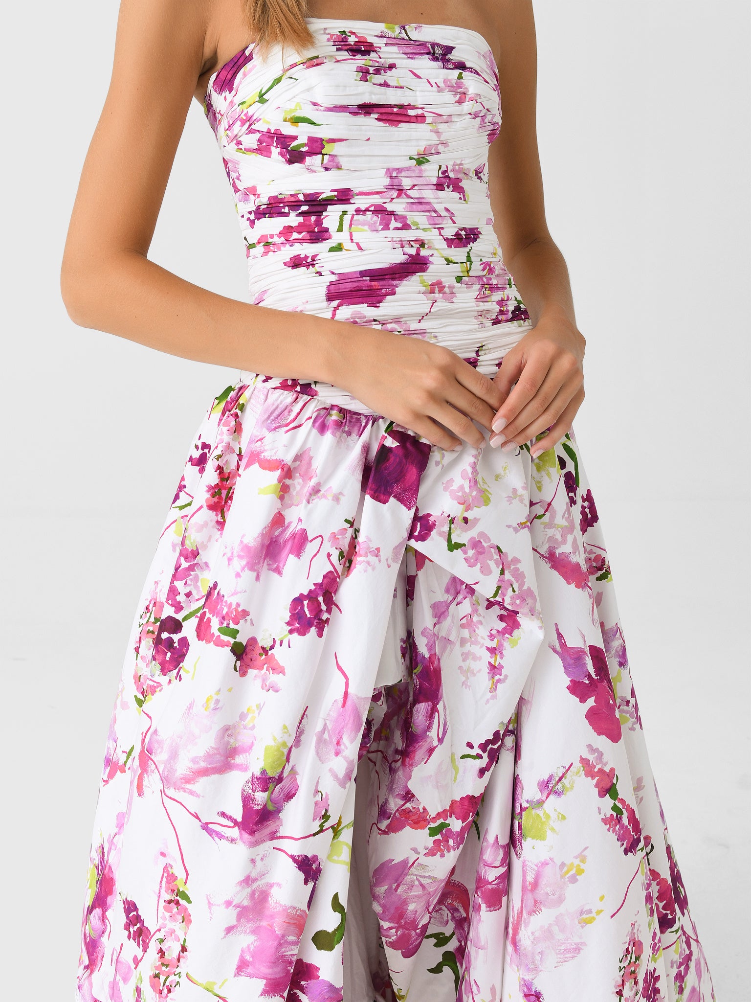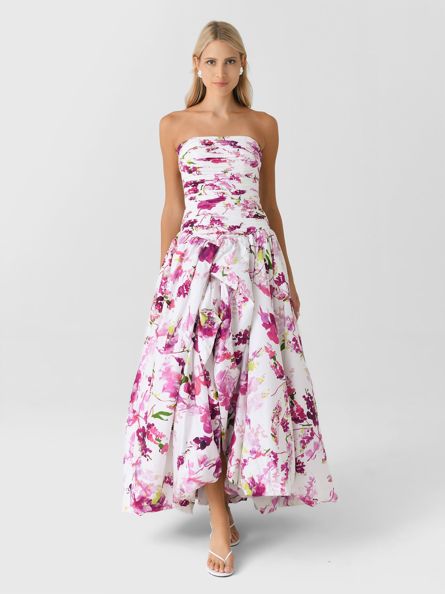 This strapless gown features a bright floral print, a ruched bodice, and an asymmetrical draped bubble hem.