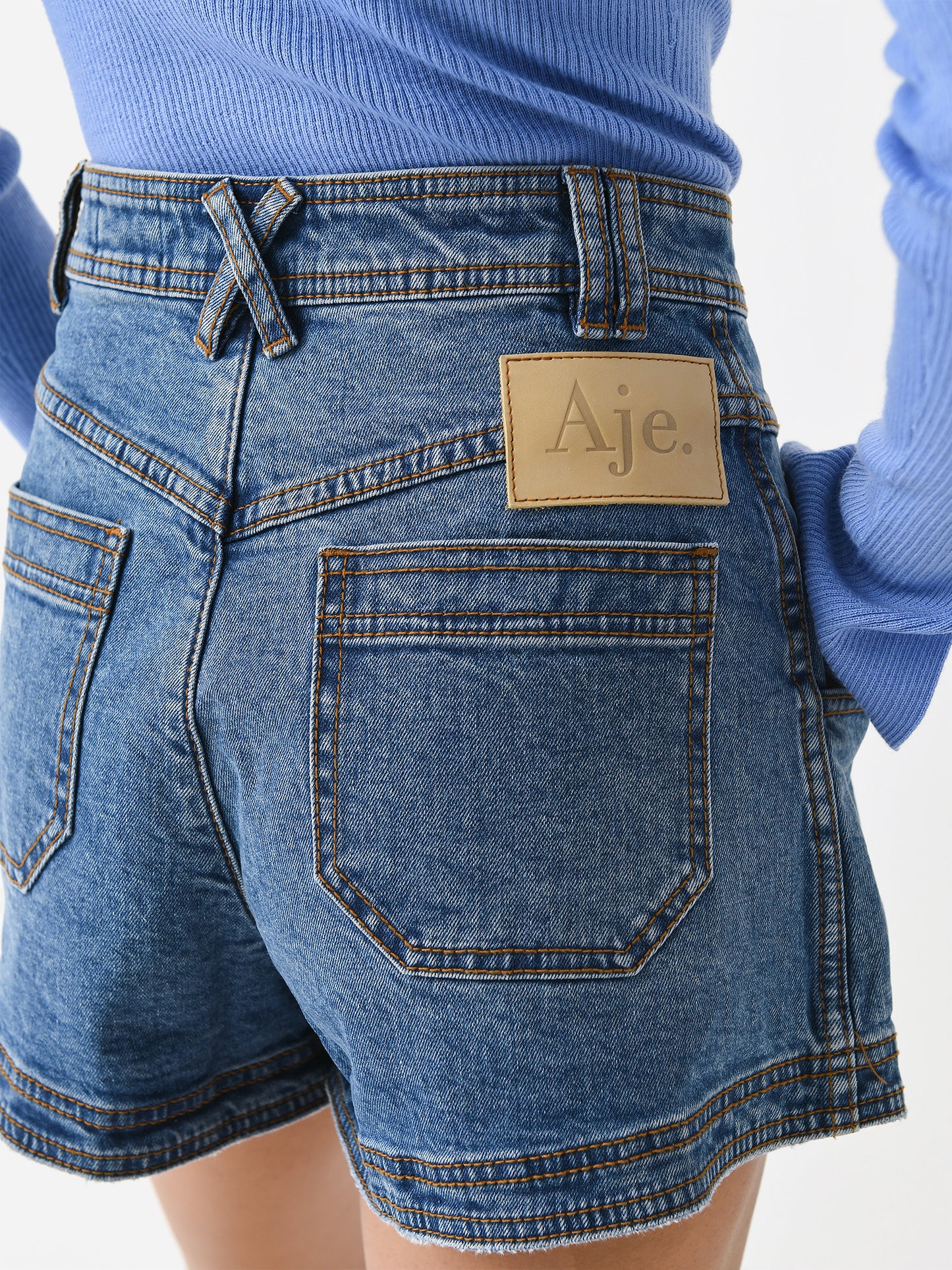 A high-waisted short made from stretch denim fabric with a subtly distressed hem and topstitching details throughout.