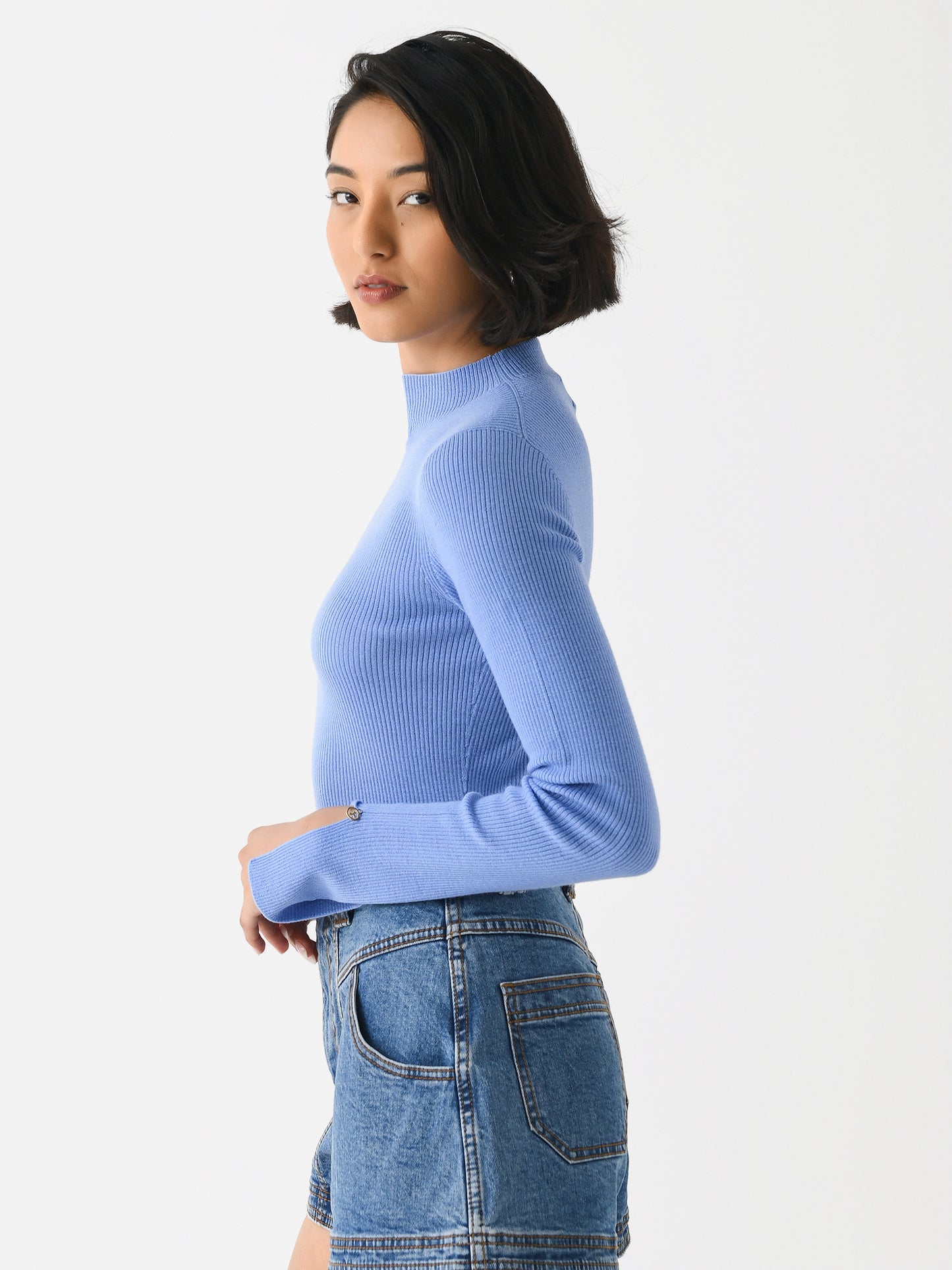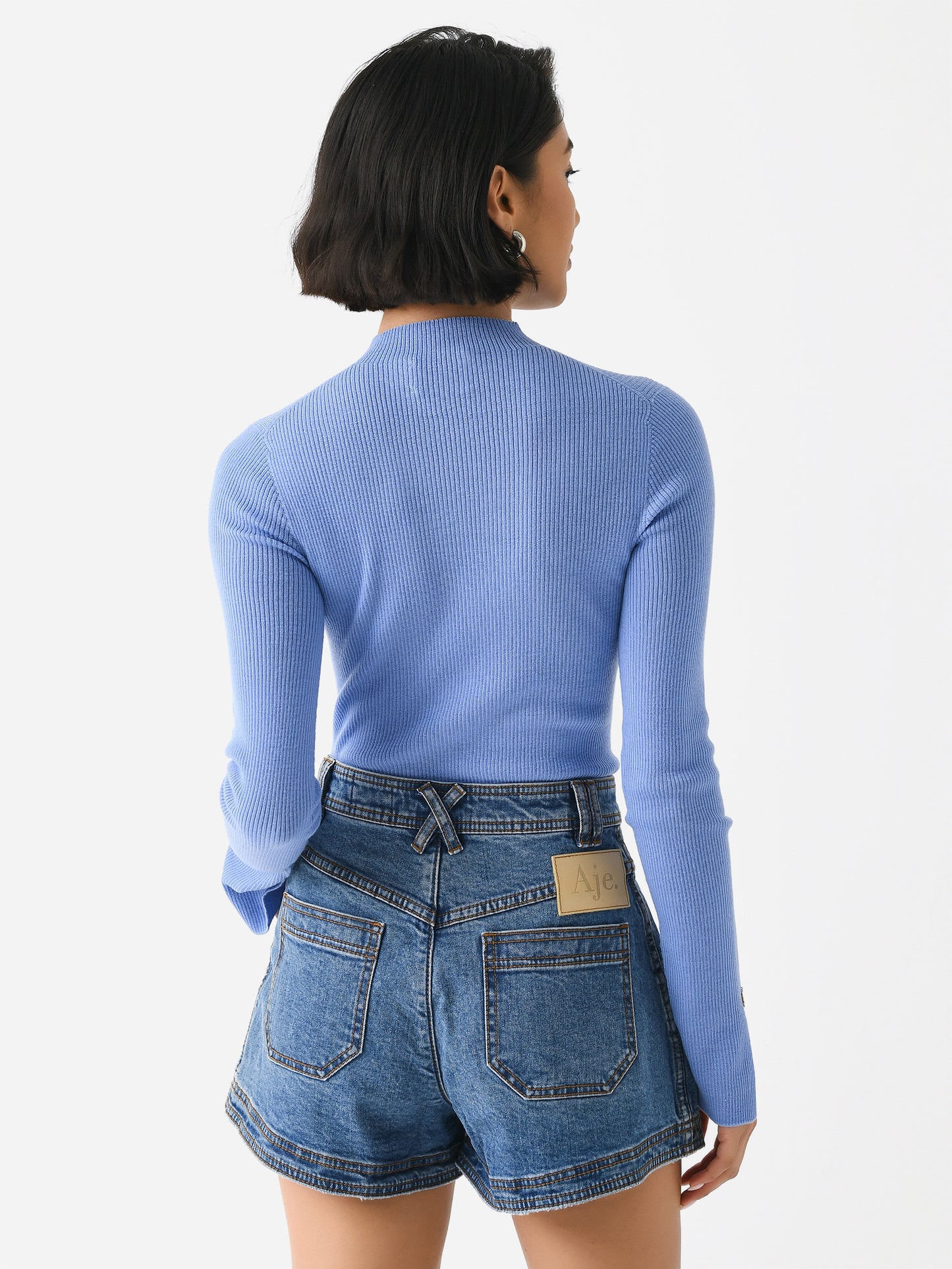 A form-fitting mock-neck top made from ribbed knit wool with unique split cuffs.