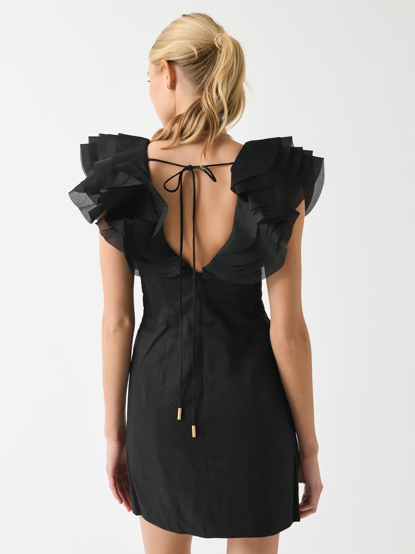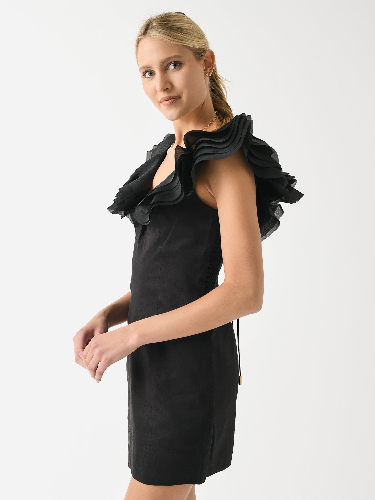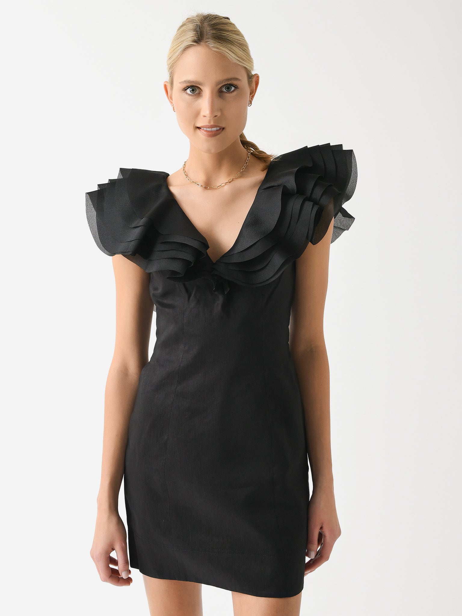 A semi-fitted mini dress with layered shoulder frills and flattering princess seams.