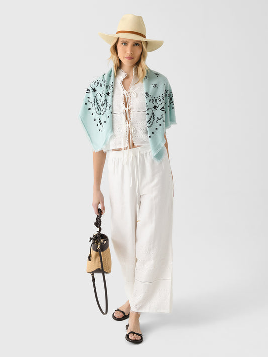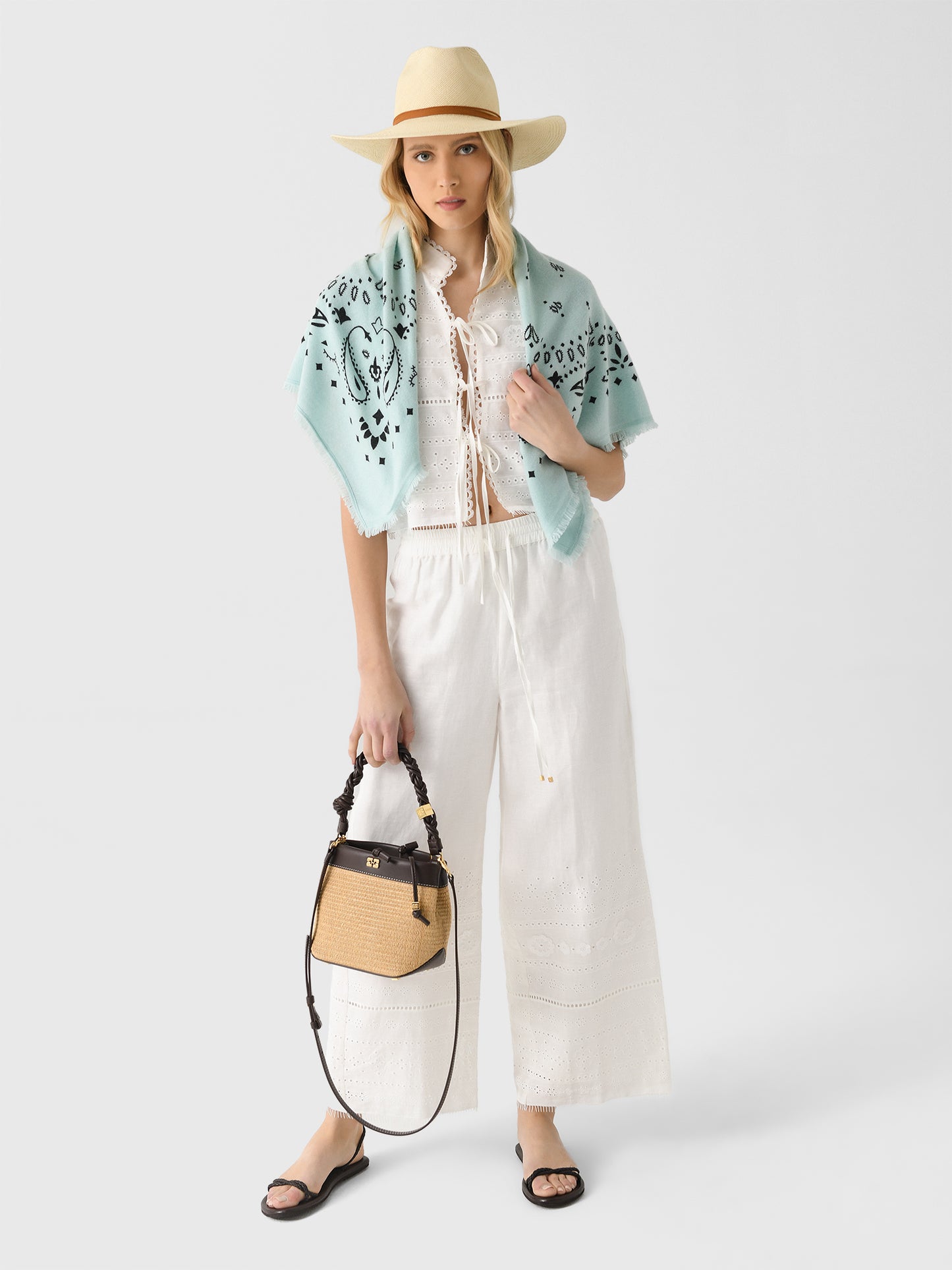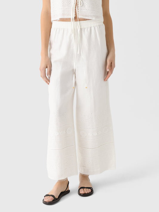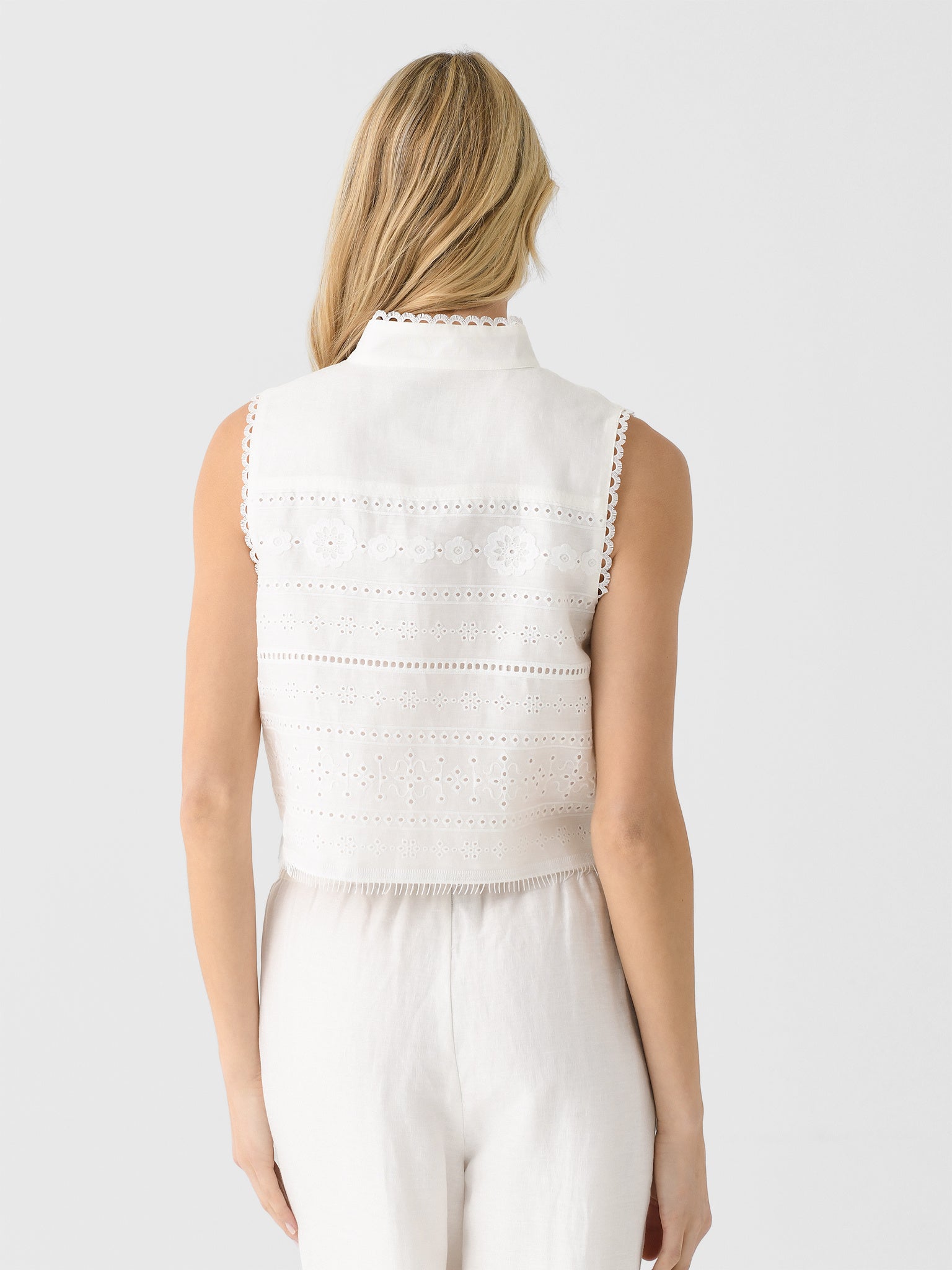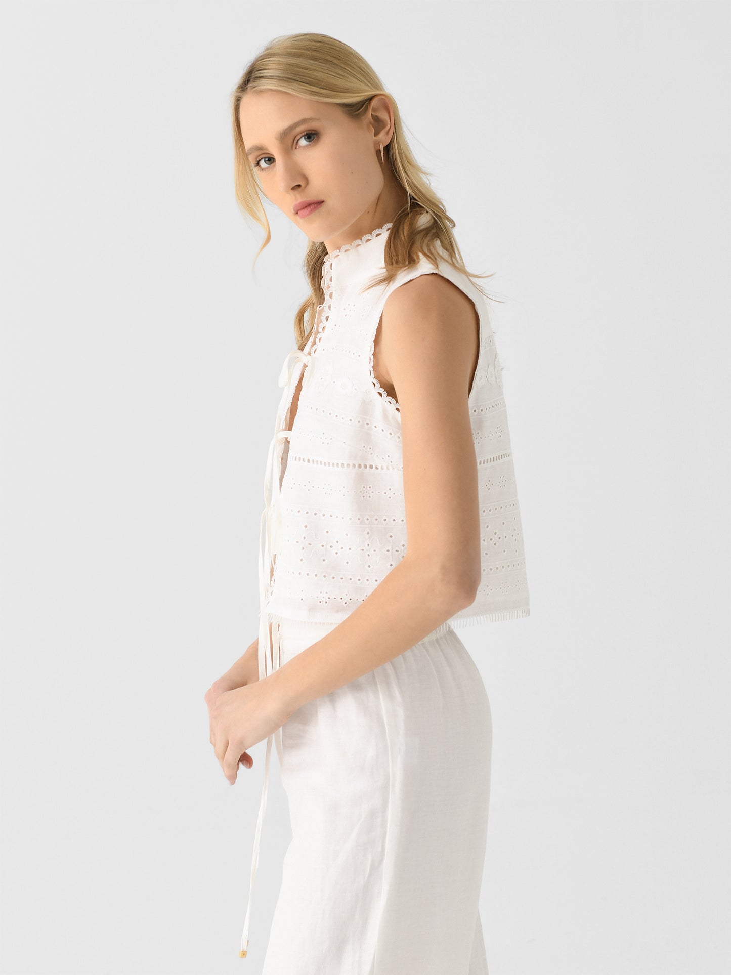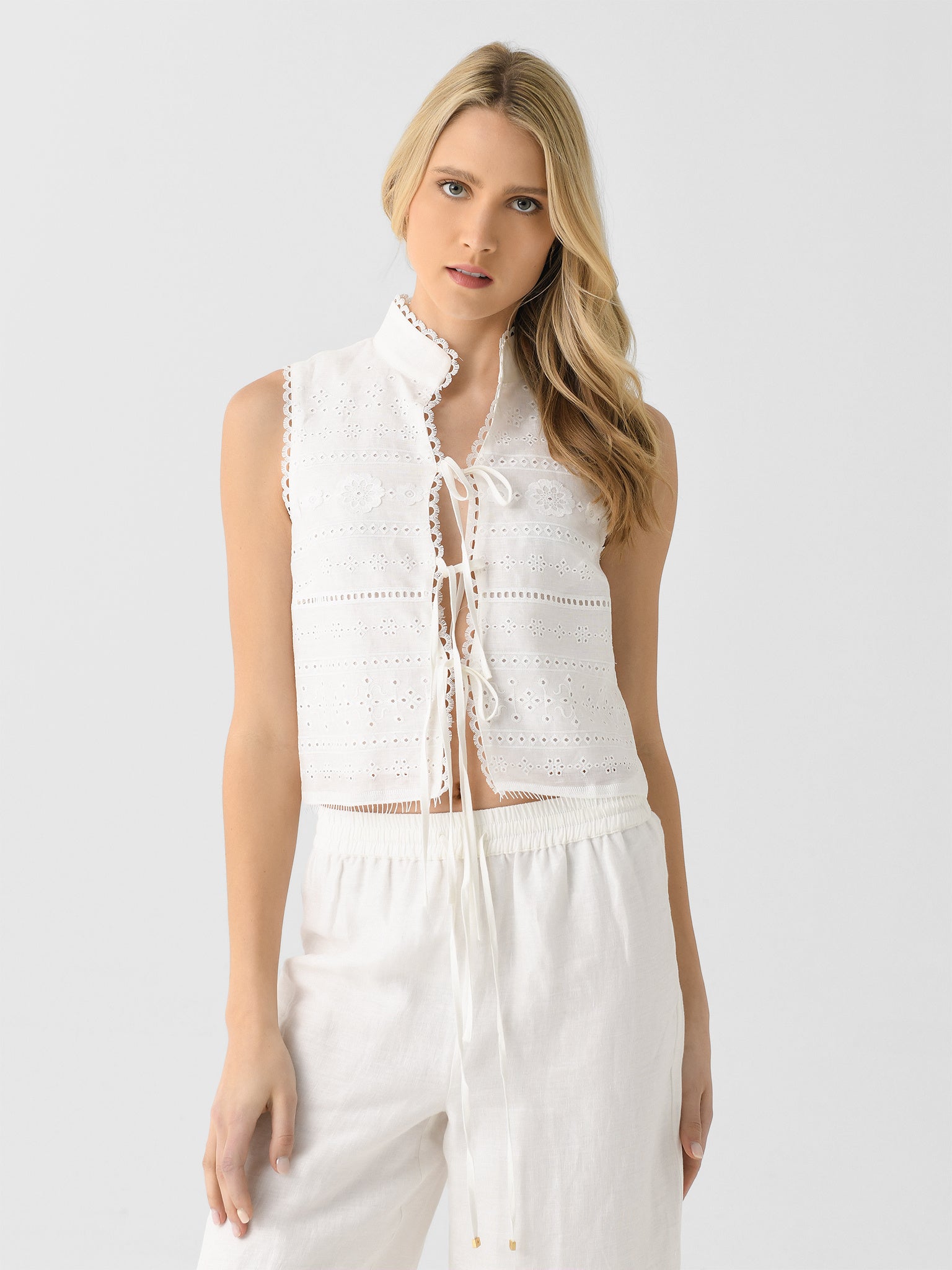 This slightly cropped top is made from lightweight linen and features an eyelet embroidered design with scalloped trims and front self-ties.
