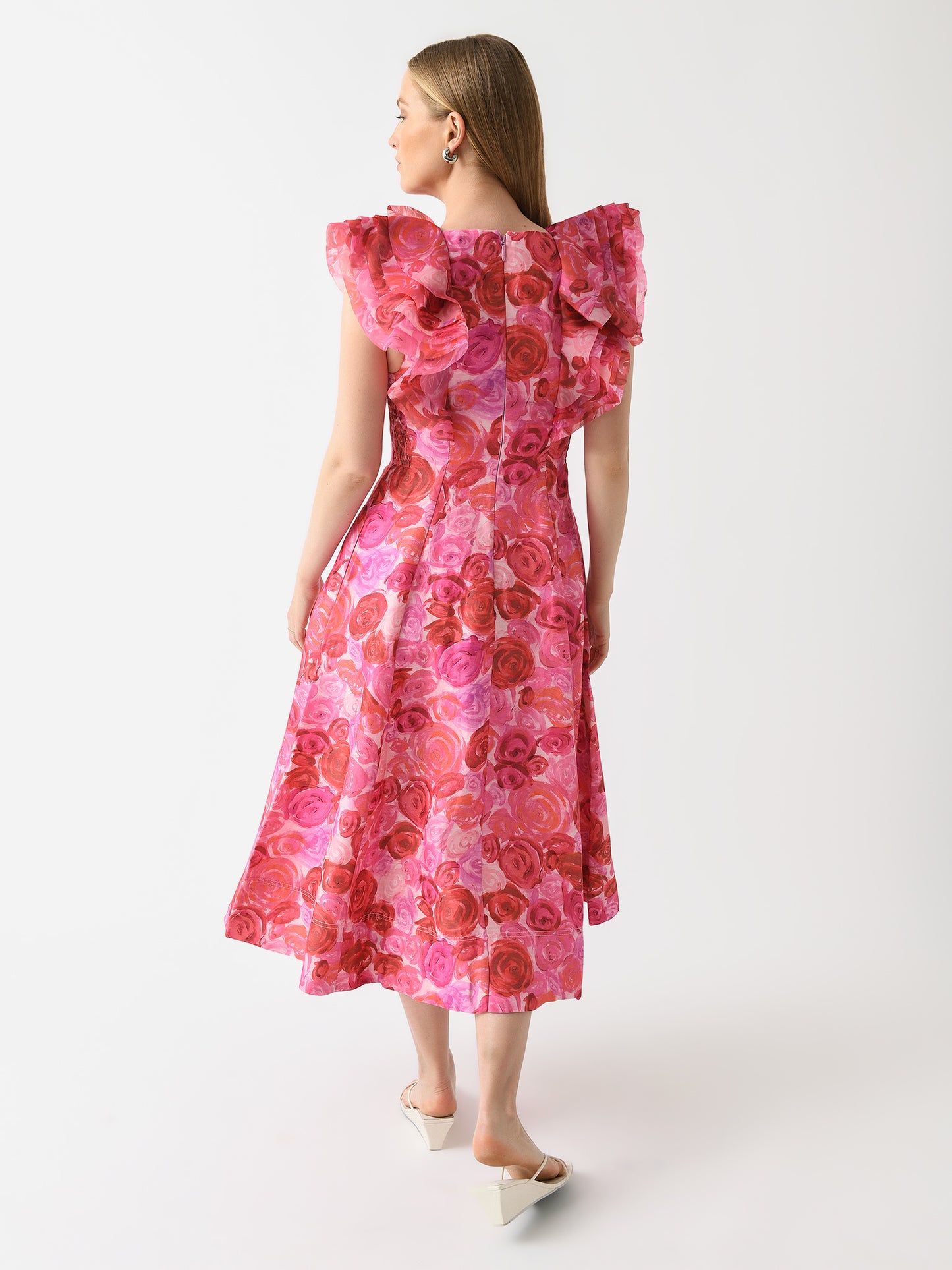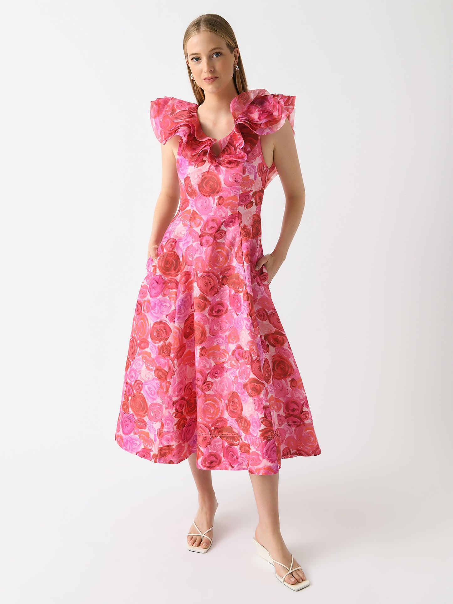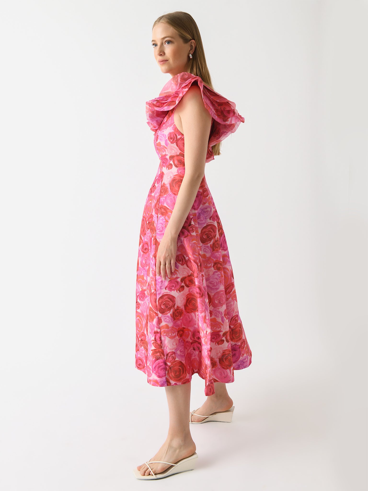 A romantic, mid-length dress with layered shoulder frills and flattering princess seams.