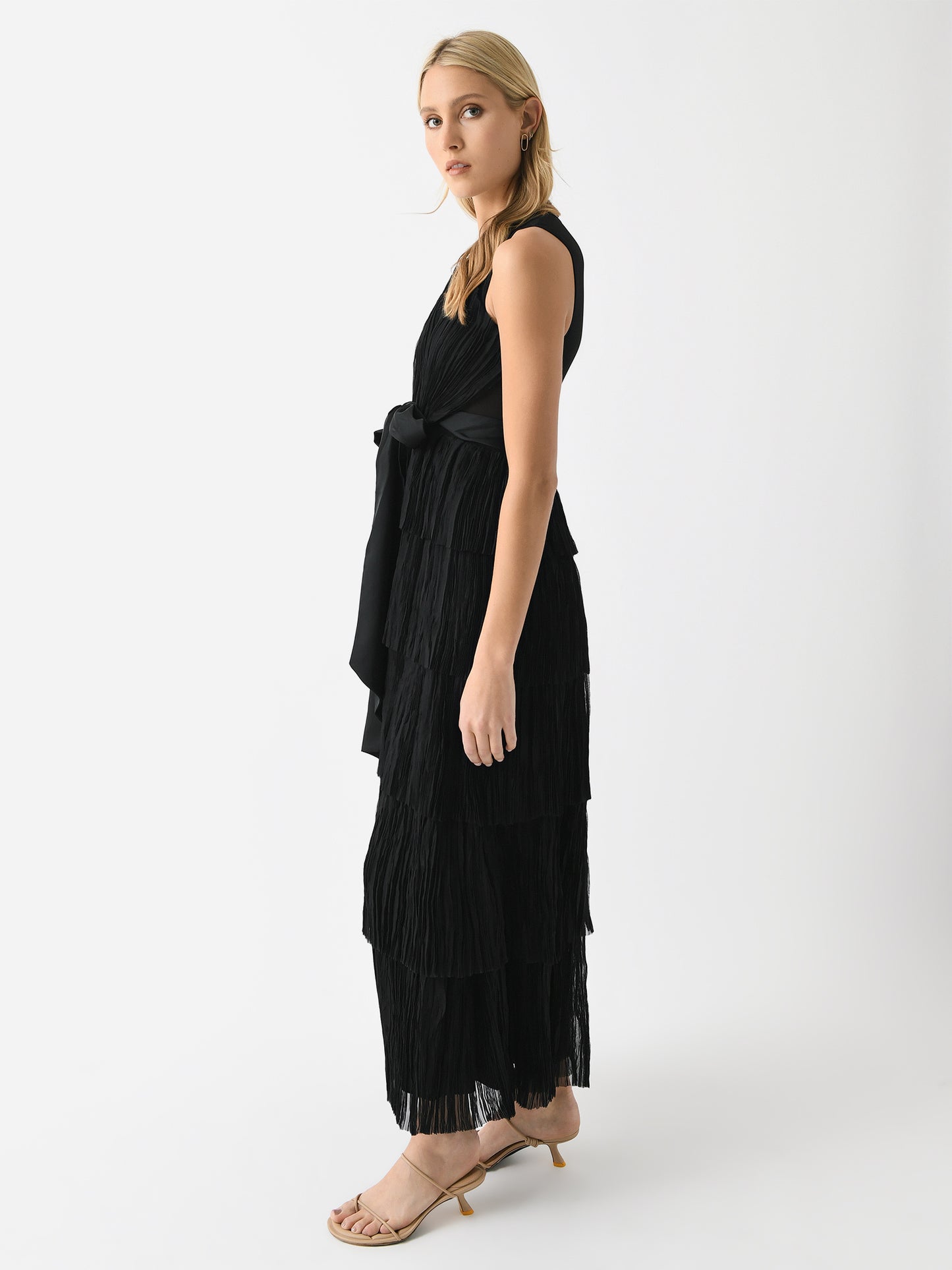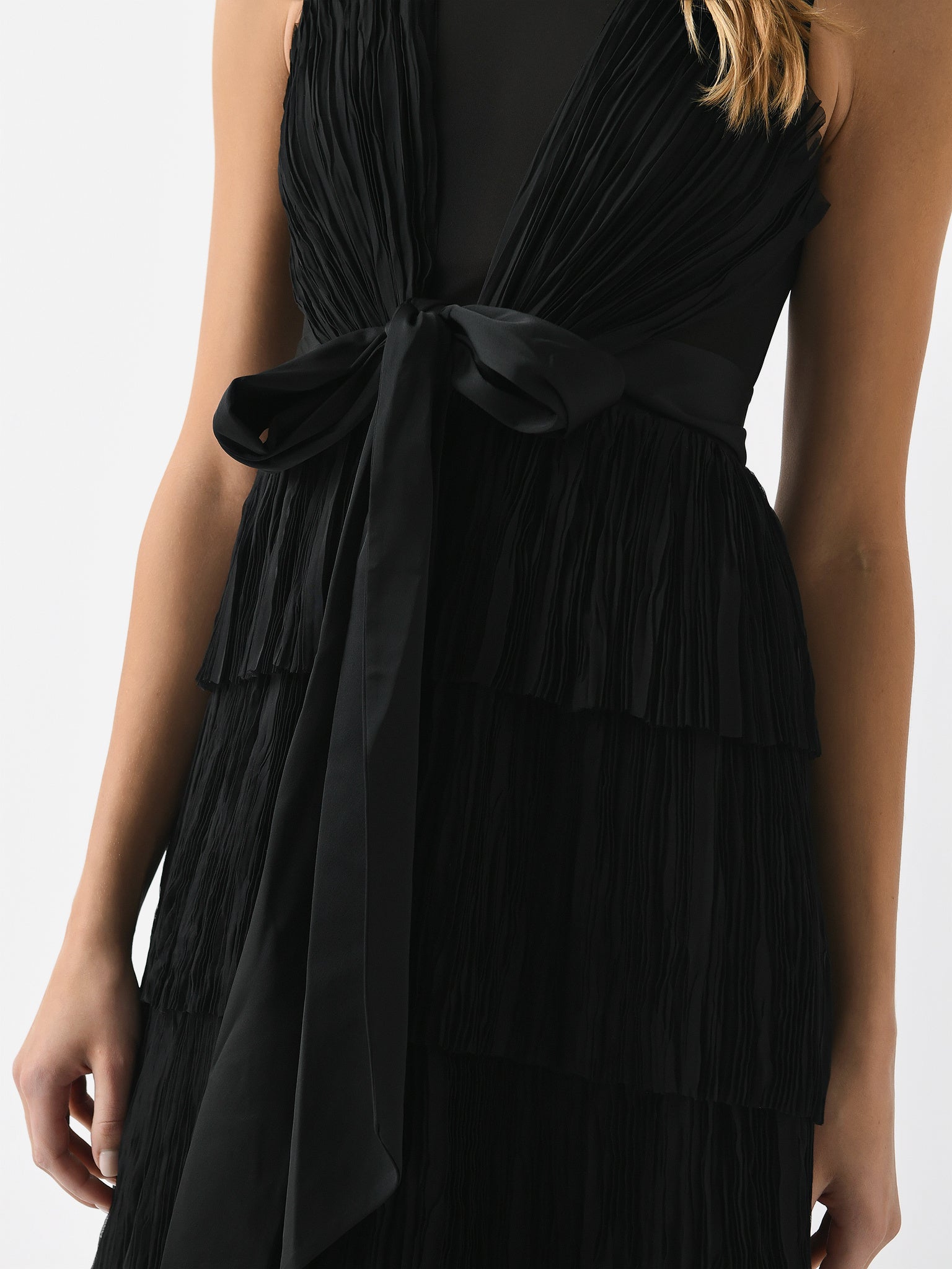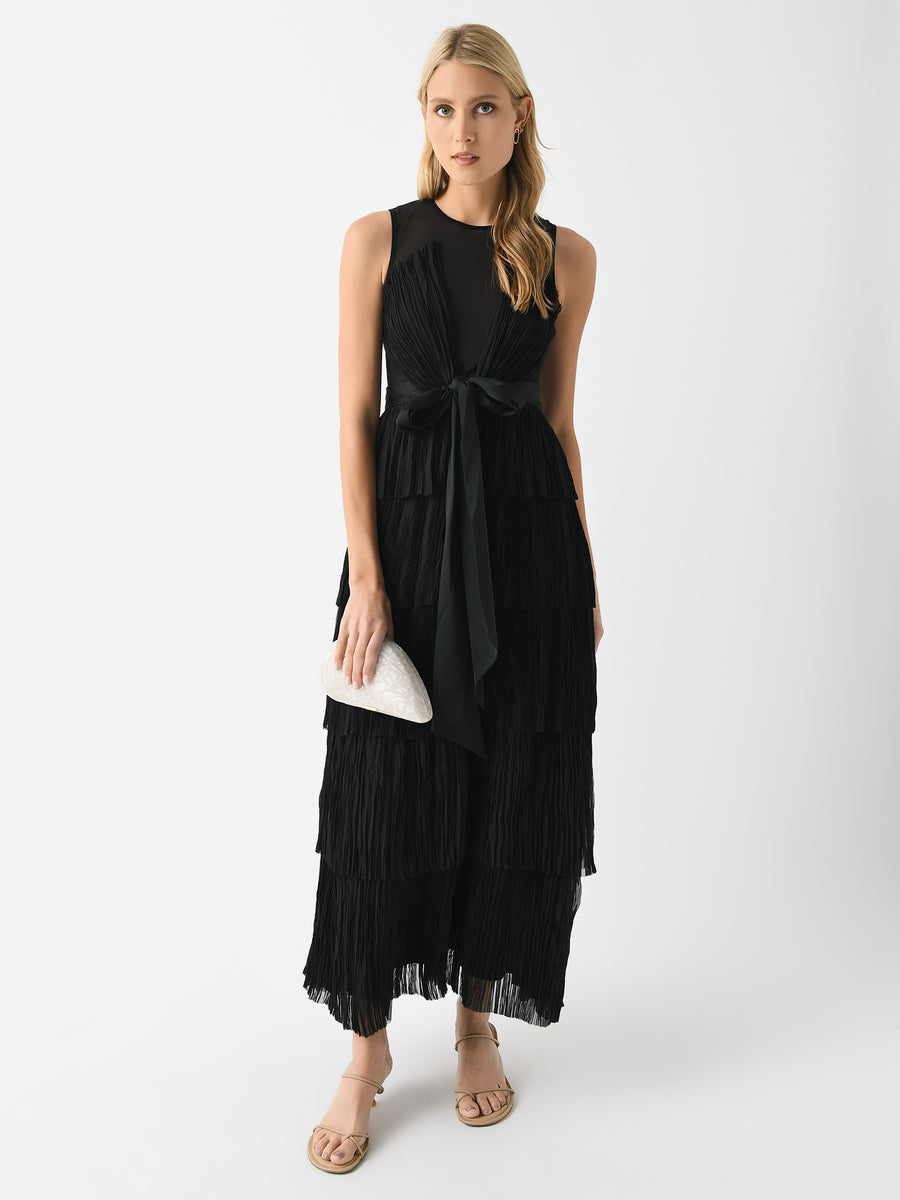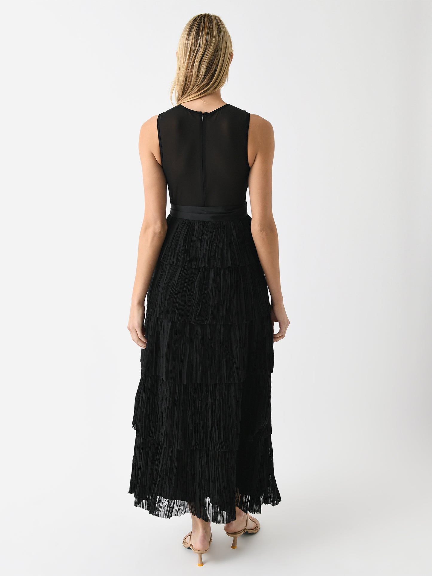 A maxi-length dress with a mesh bodice and pleated chiffon paneling with a voluminous skirt.