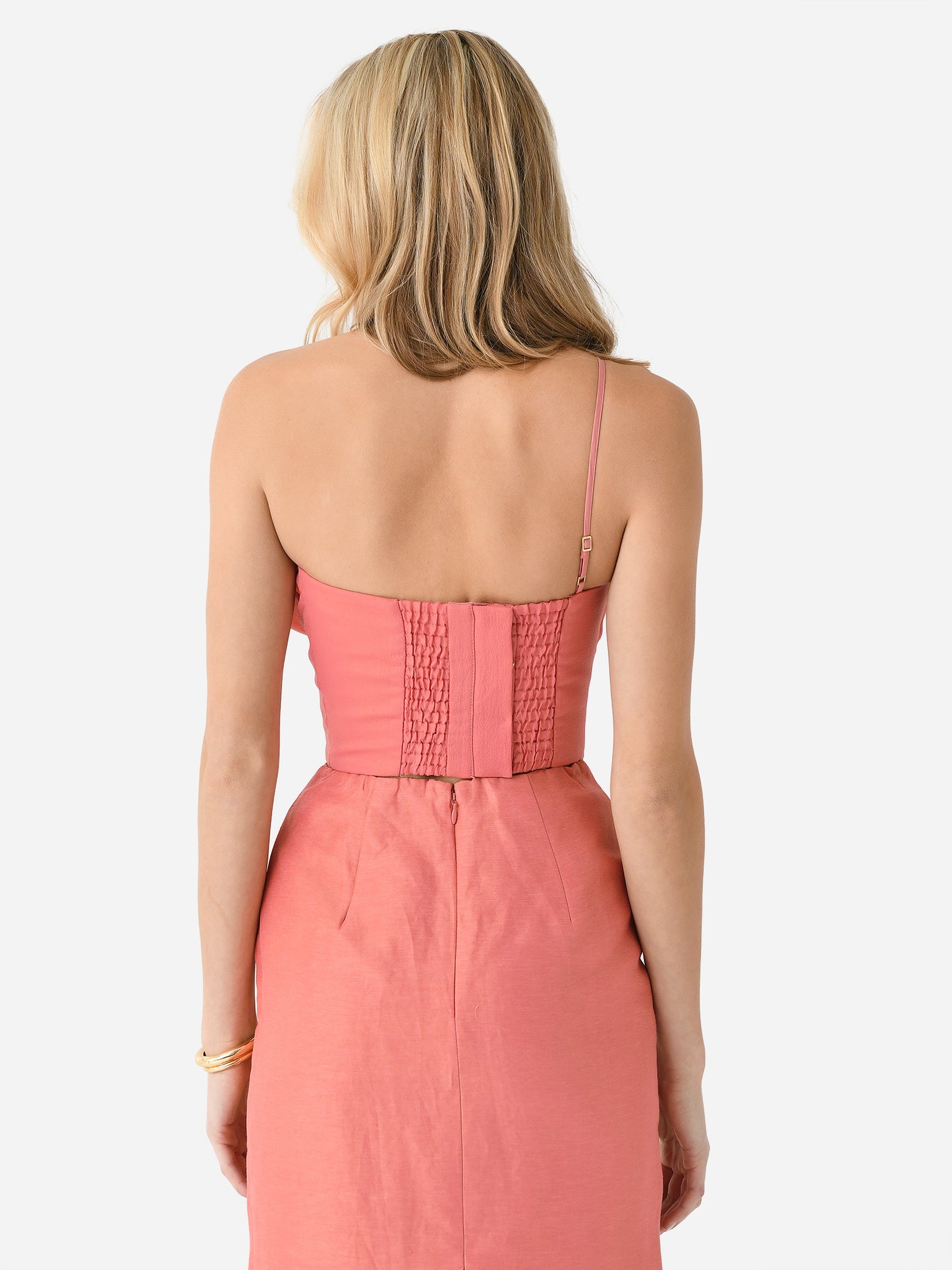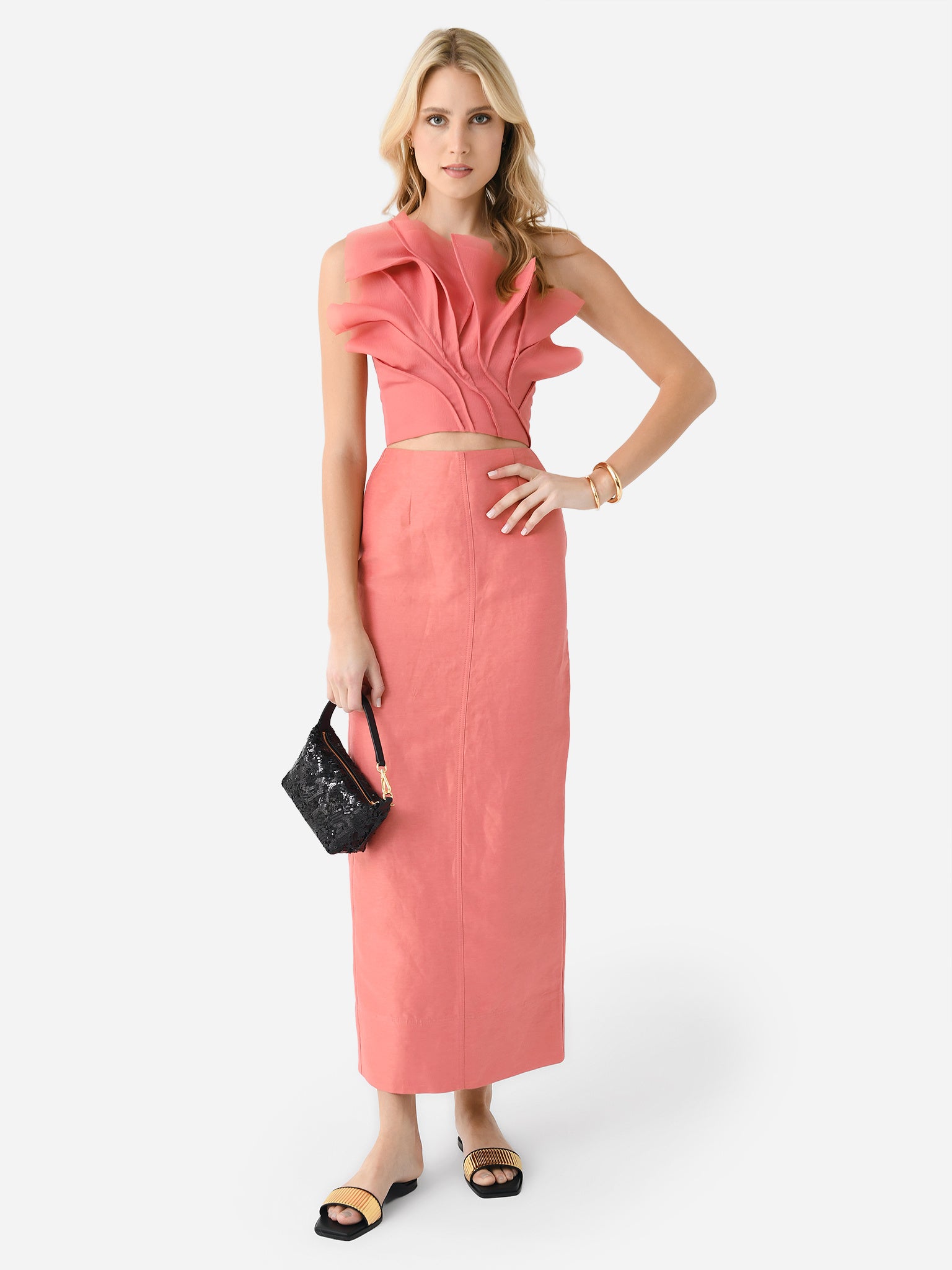 A slightly cropped top with a single shoulder strap and a large raw-edge organza overlay.