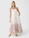 This maxi dress showcases a beautiful floral print that transitions from vibrant hues to a soft, off-white background. The ruched bodice and thin straps add delicate details to this romantic design.
