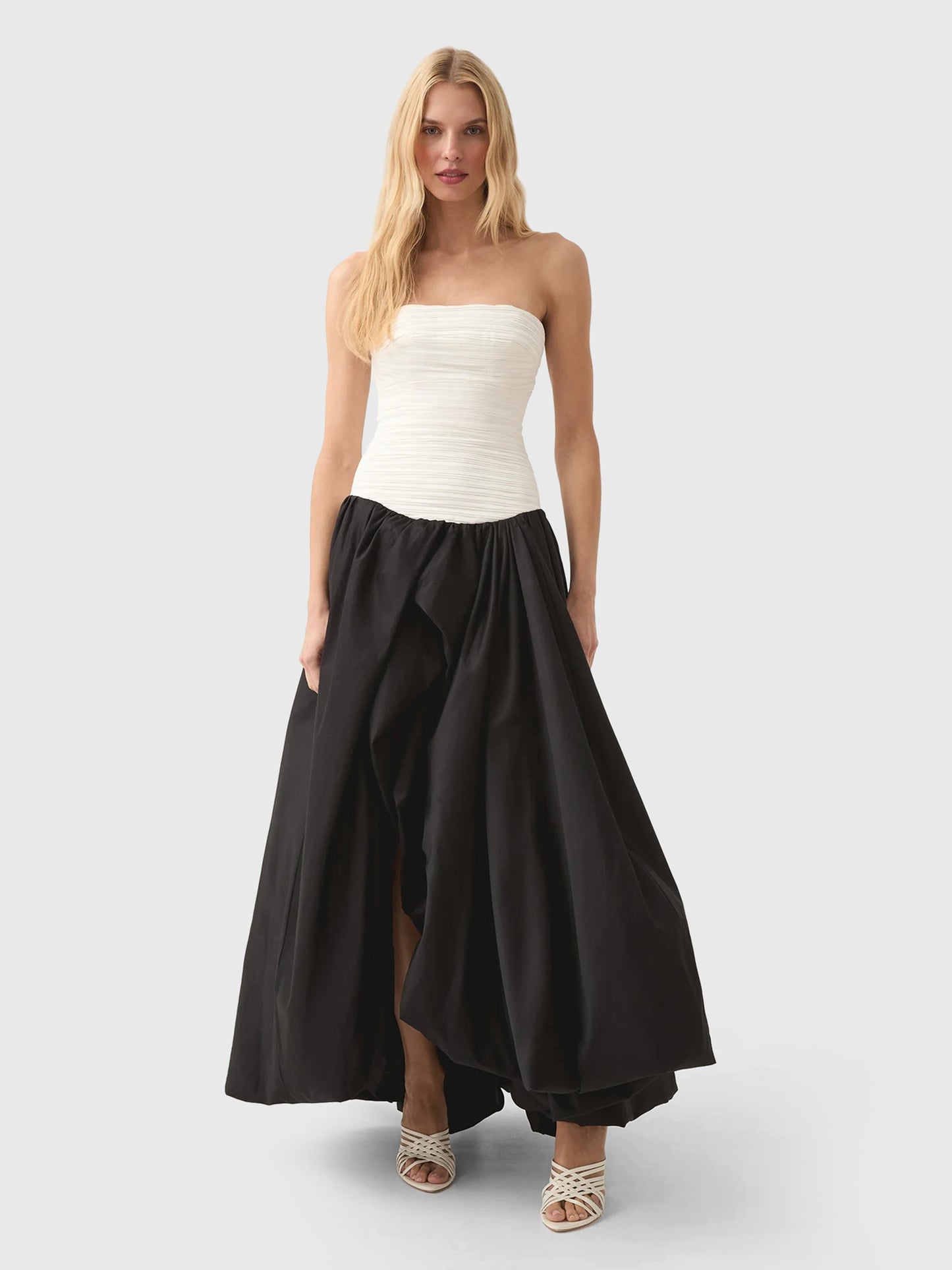 This strapless gown features a fitted bodice defined by ruching and a full-draped skirt with an asymmetrical hem.