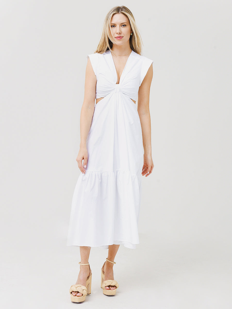 Midi-length dress with a cutout detail and structured cap sleeves.