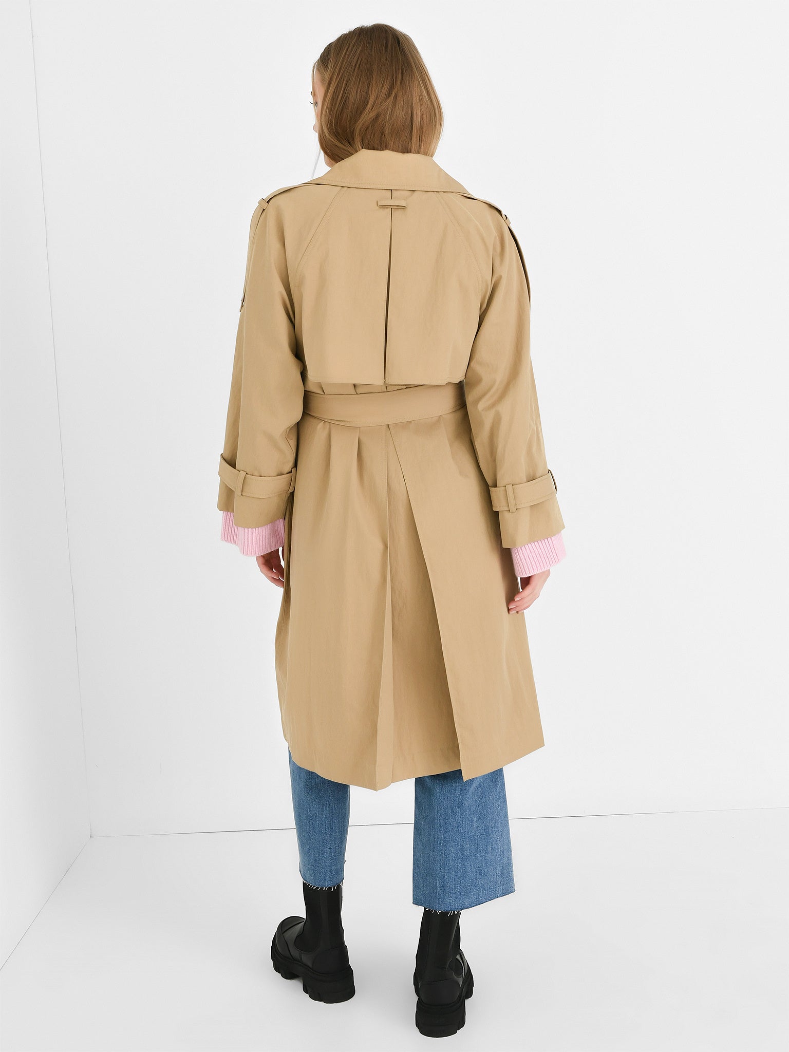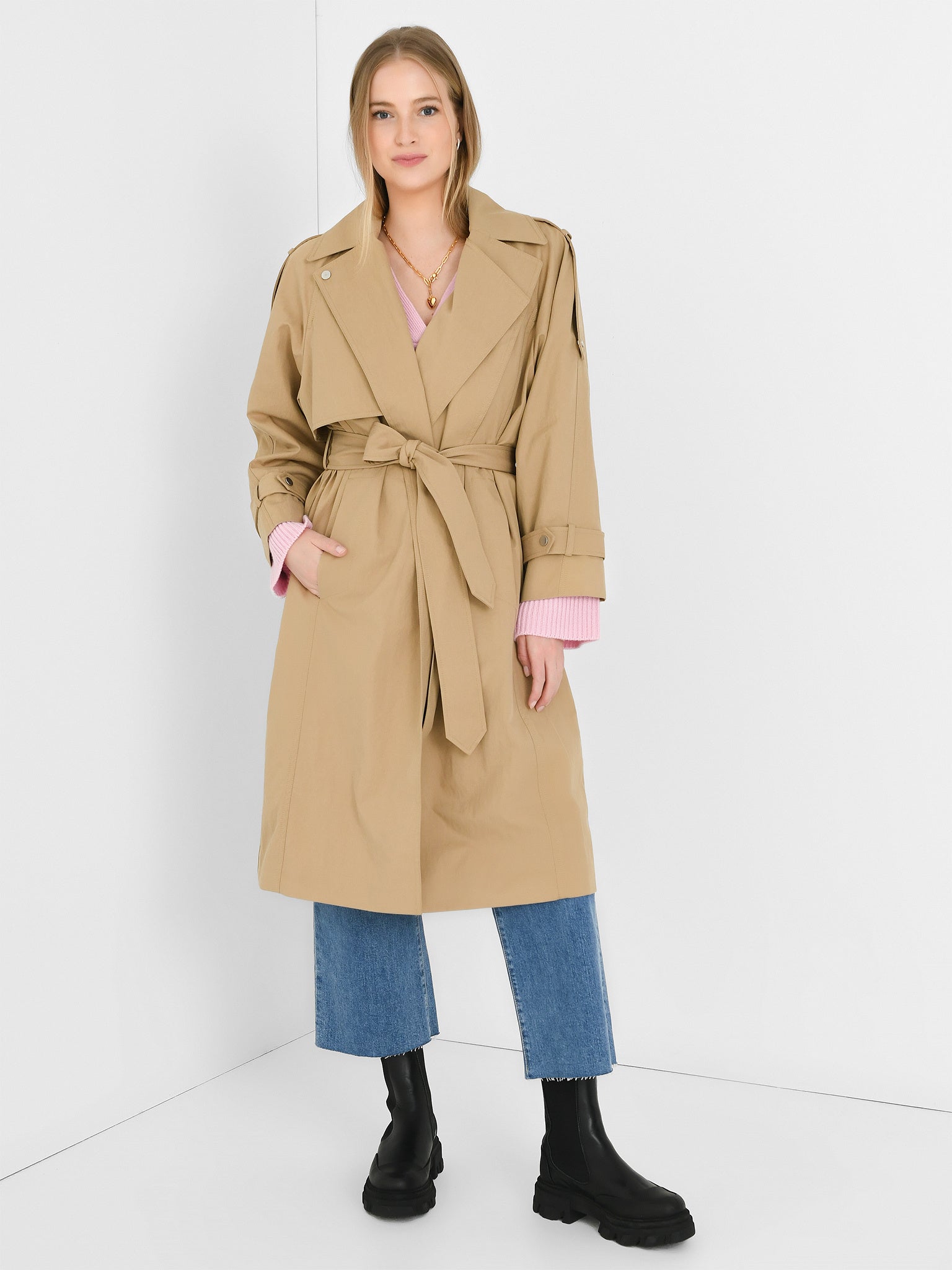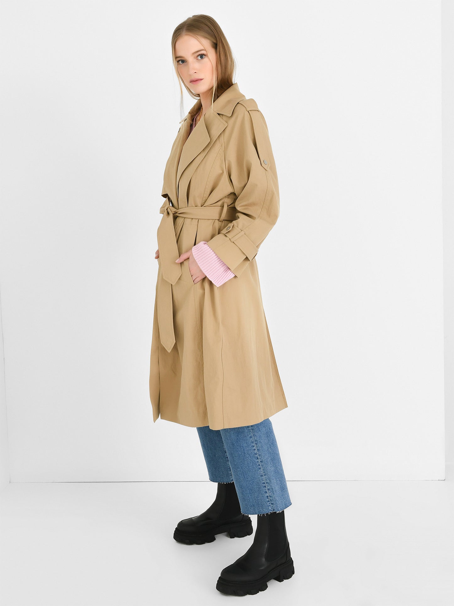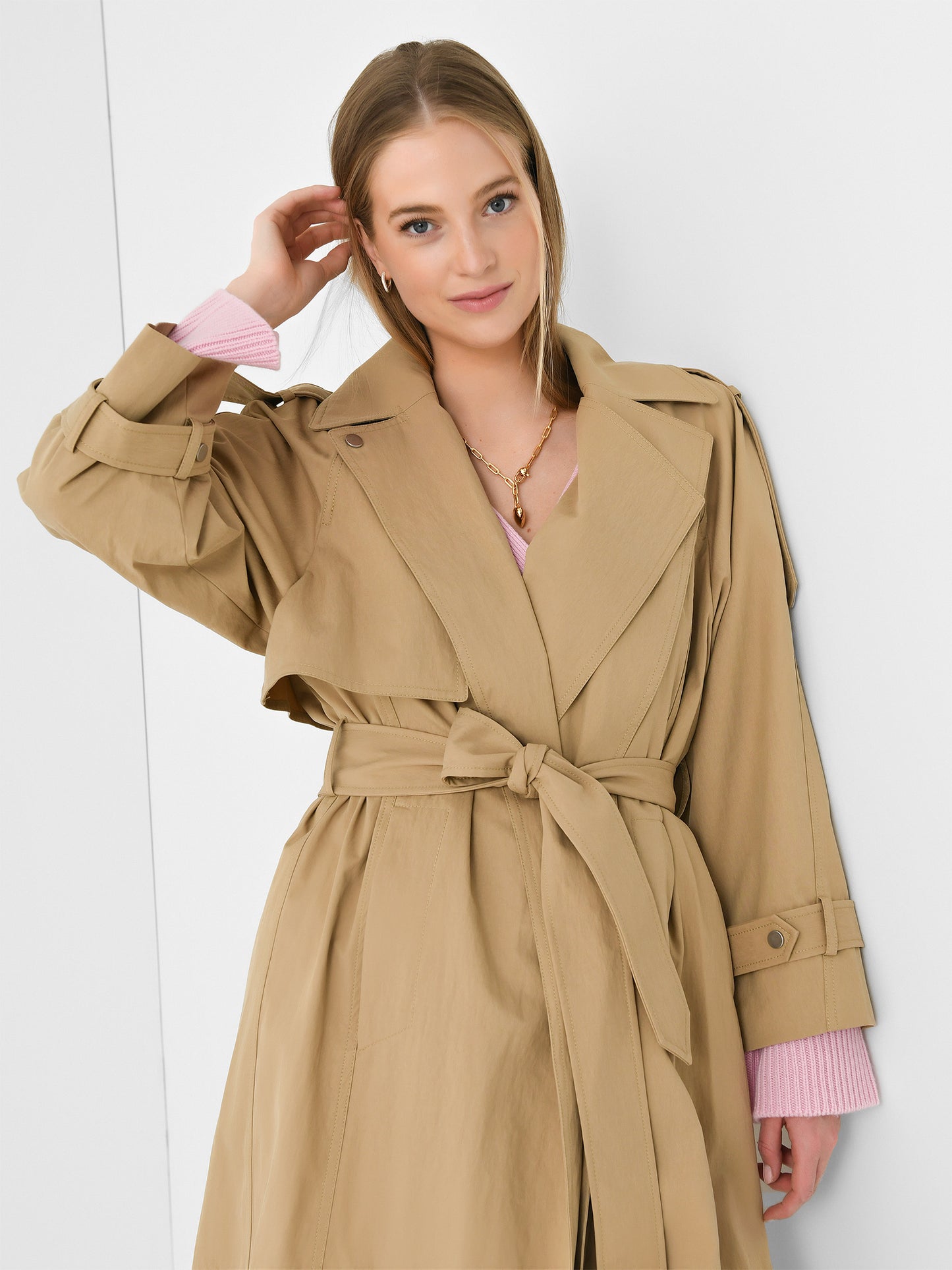 A light and airy trench coat crafted from softly structured fabric with a water-repellent finish.