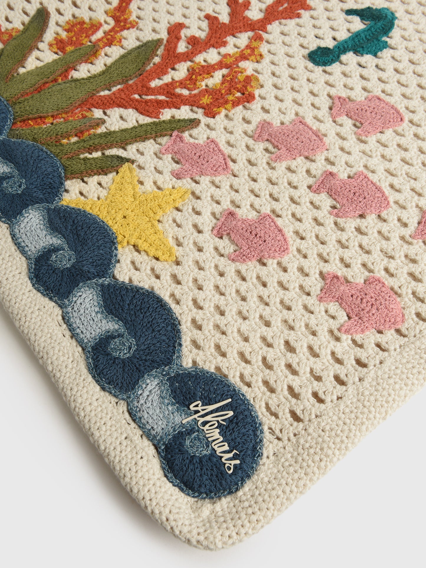 A lightweight crochet tote bag featuring embroidered underwater appliqués.