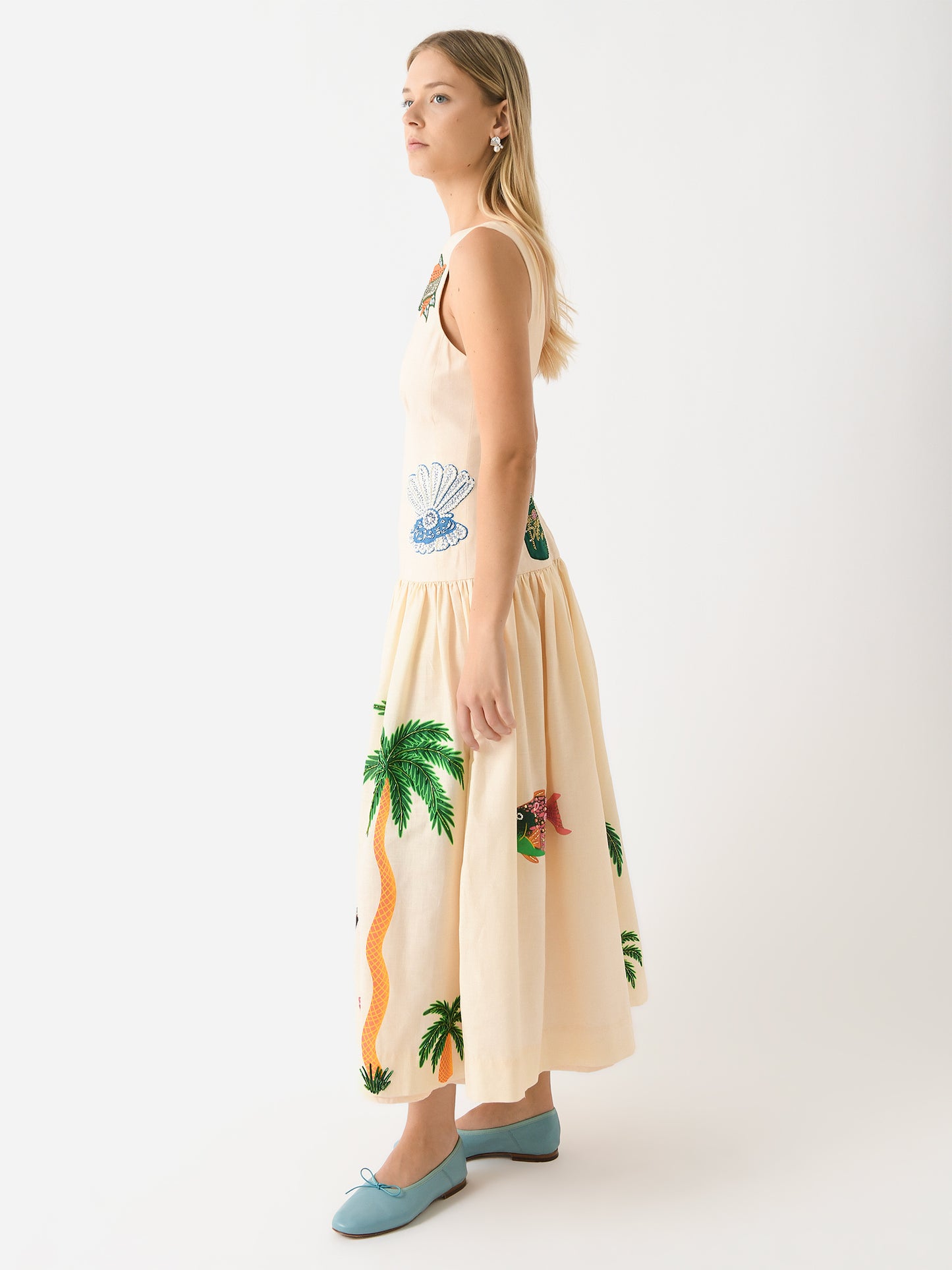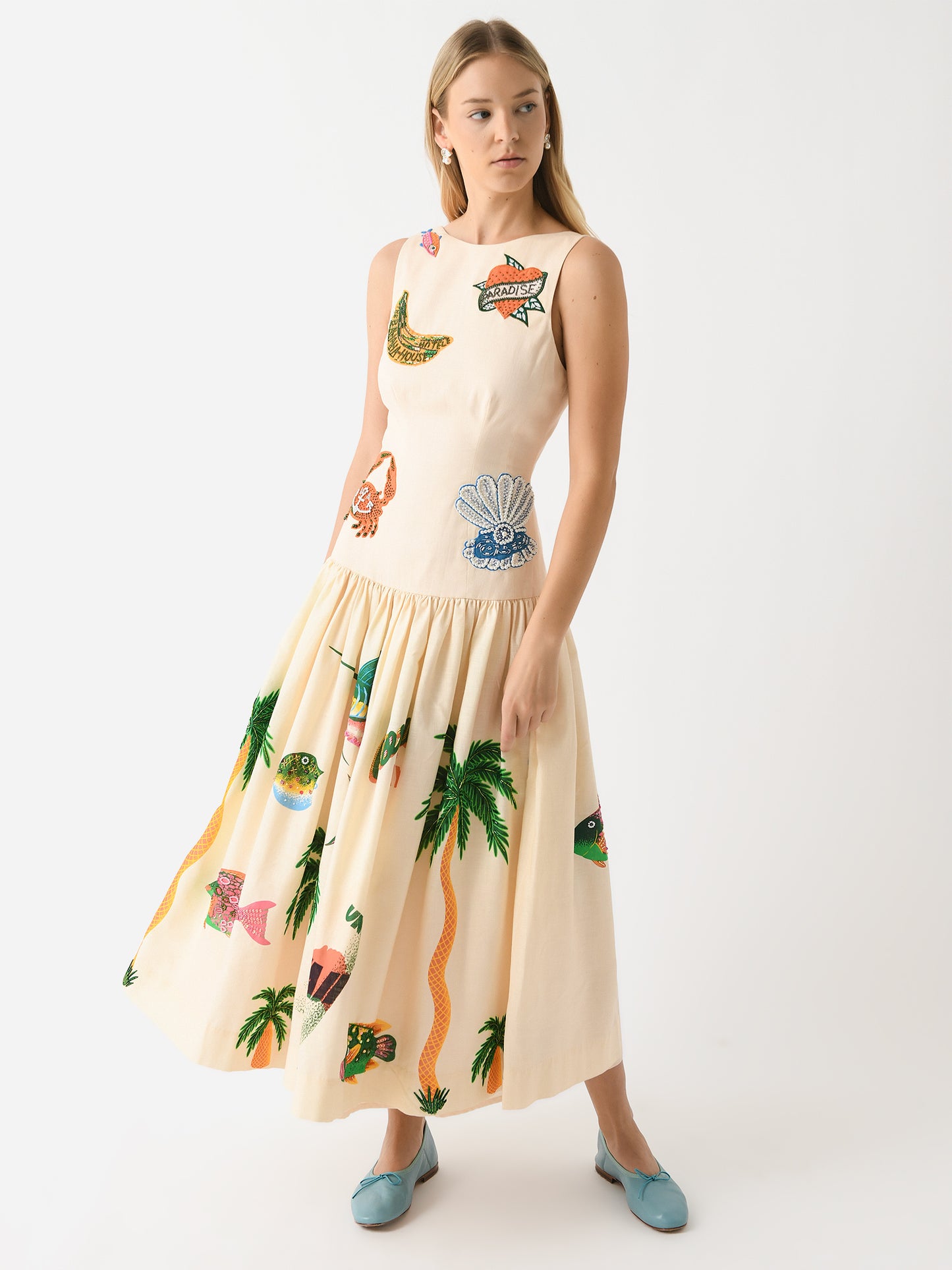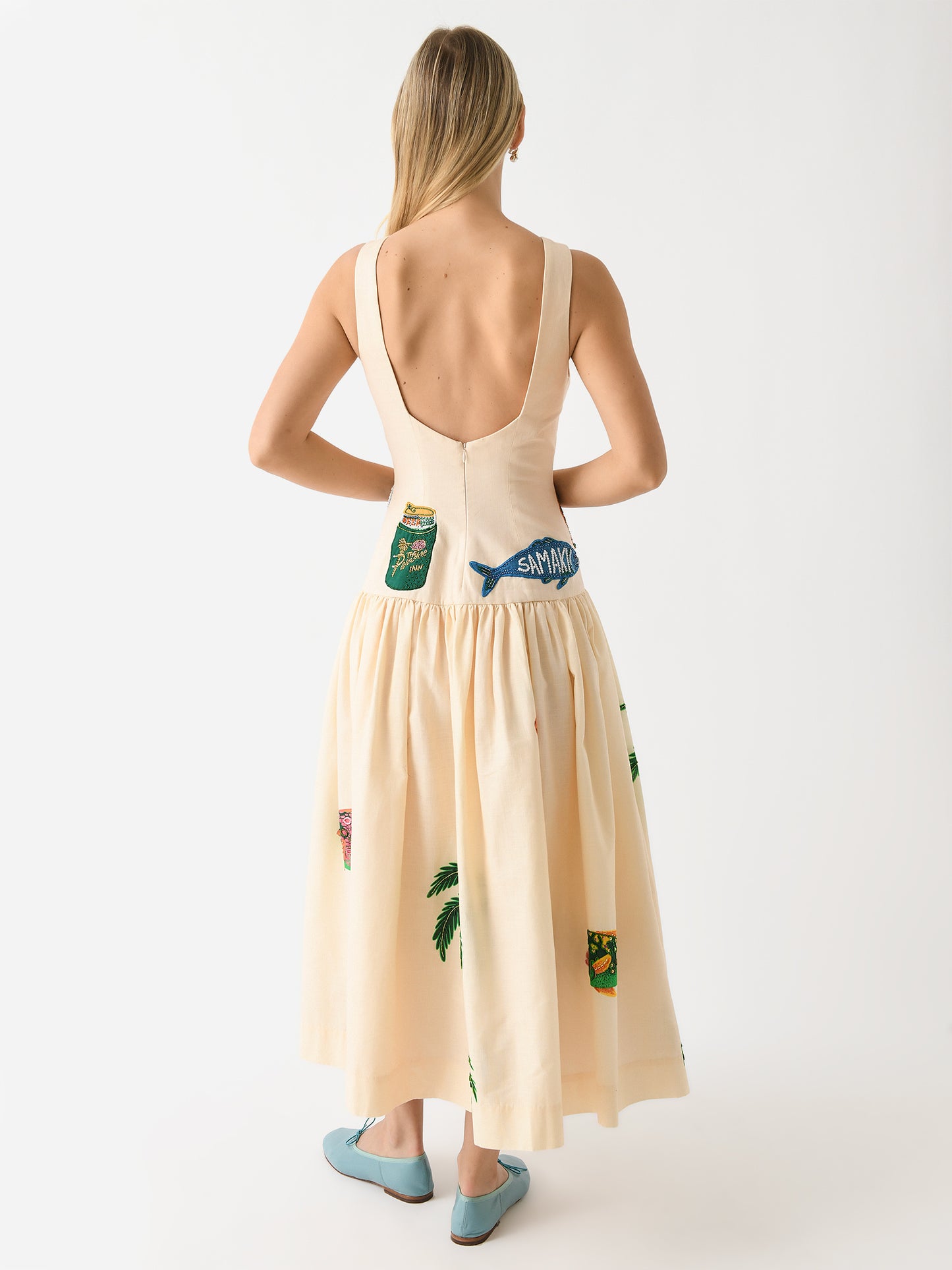 A long, fitted dress with a full, gathered skirt and custom embroidered designs.
