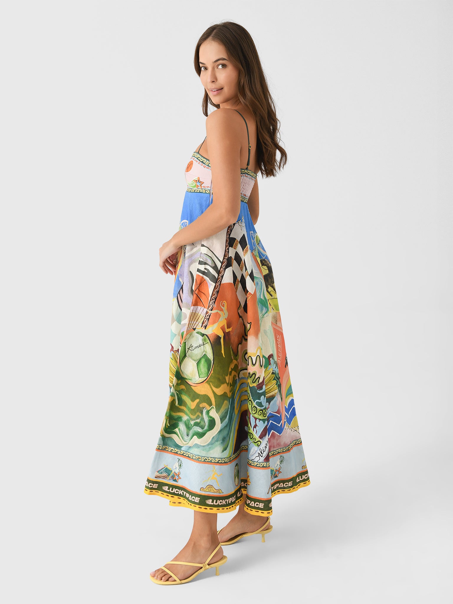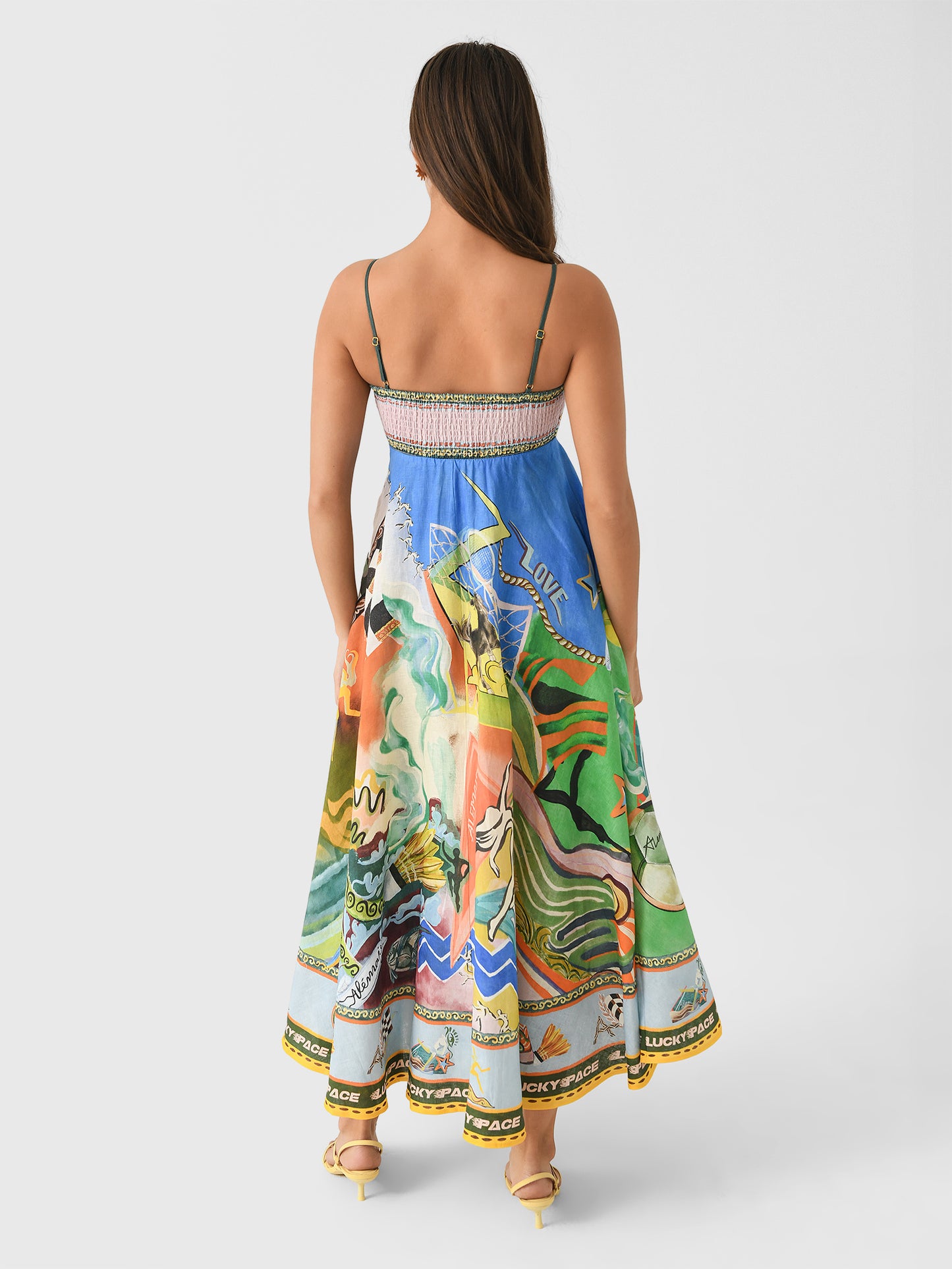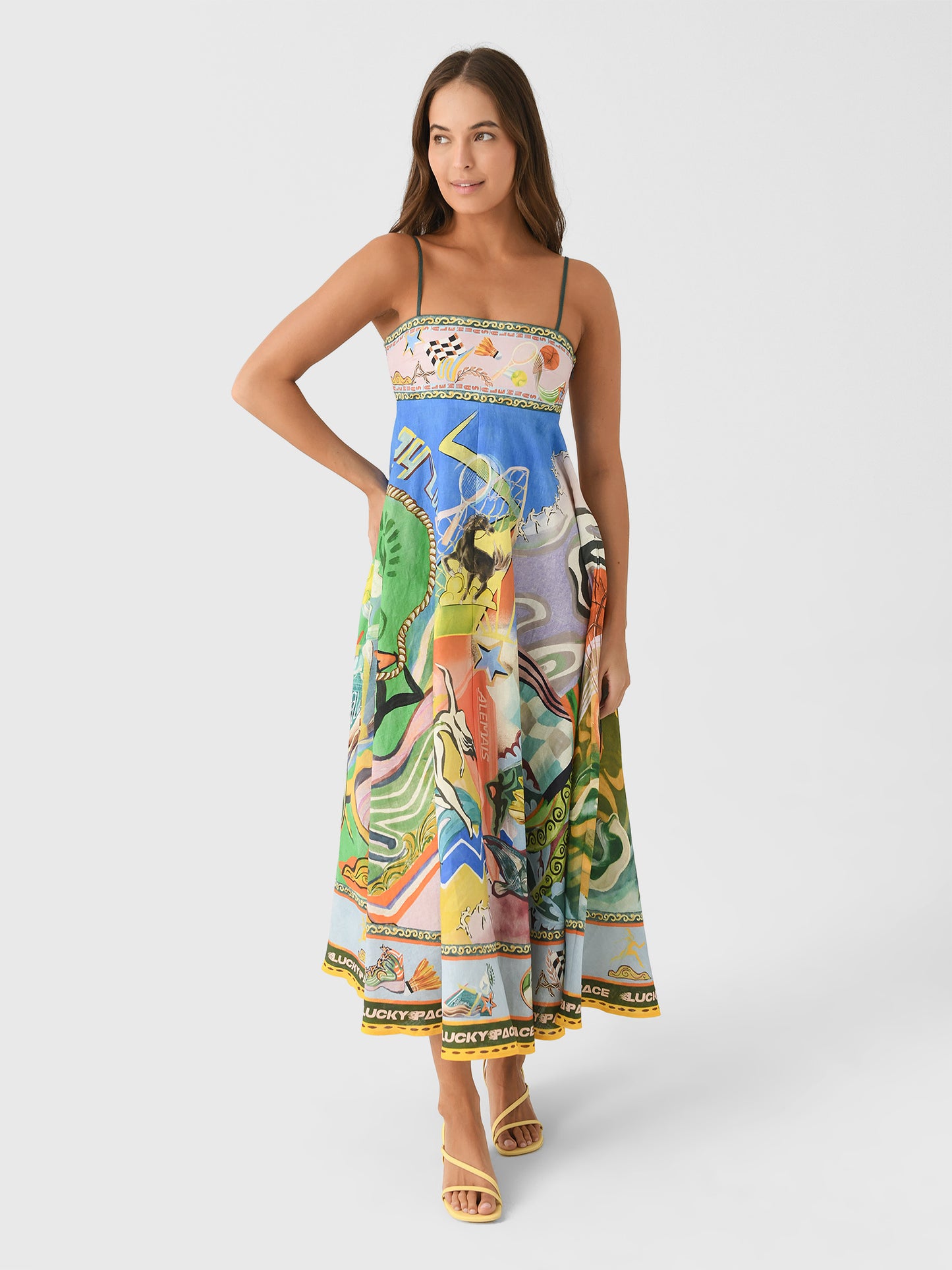 A long and flowy sundress made from lightweight linen featuring a custom Alemais print.