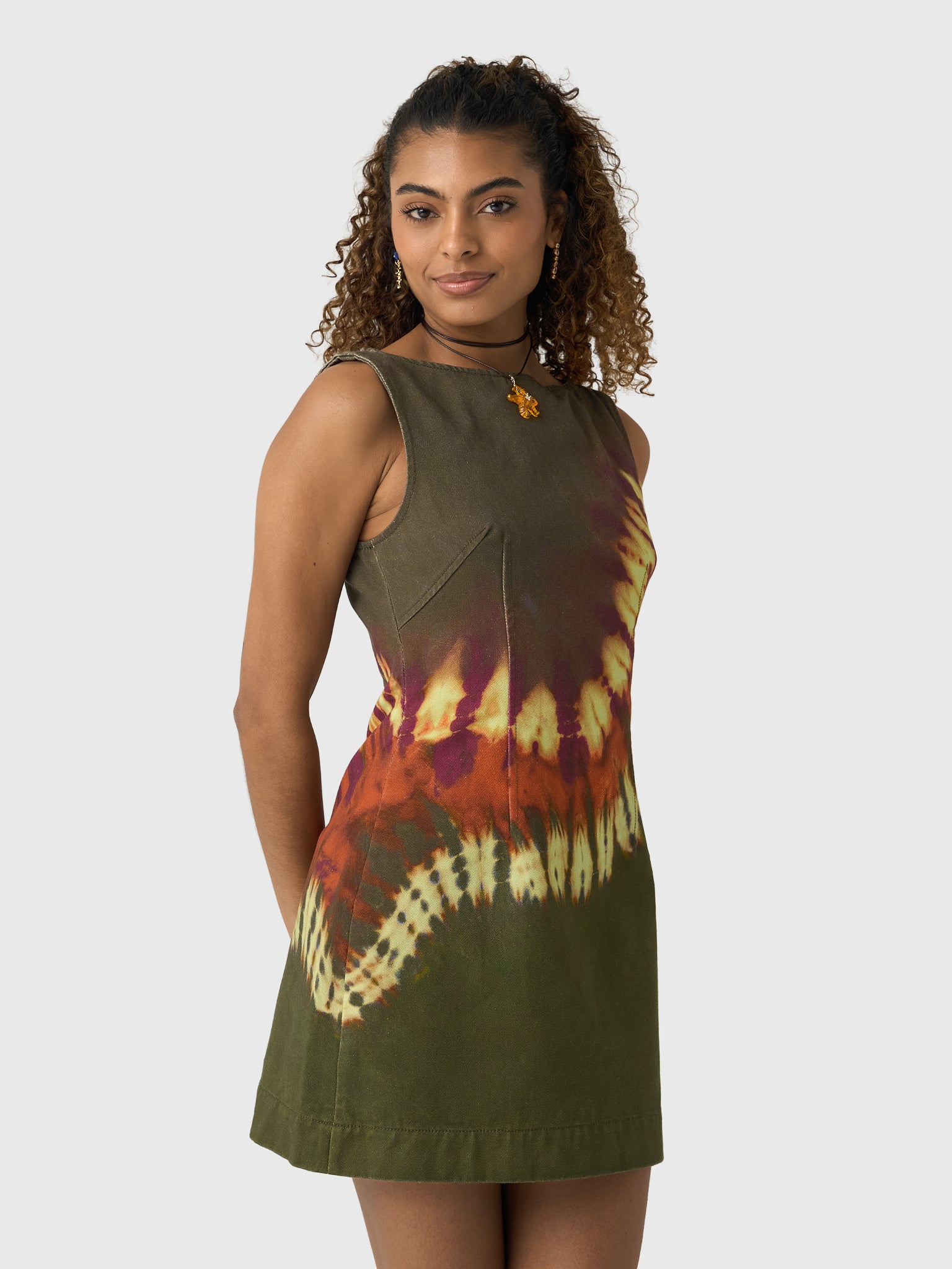This denim mini dress features a fitted silhouette and a flattering straight neckline that beautifully highlights the form. Finished with a bold tie-dye print, it adds a striking, modern edge to your warm-weather wardrobe.