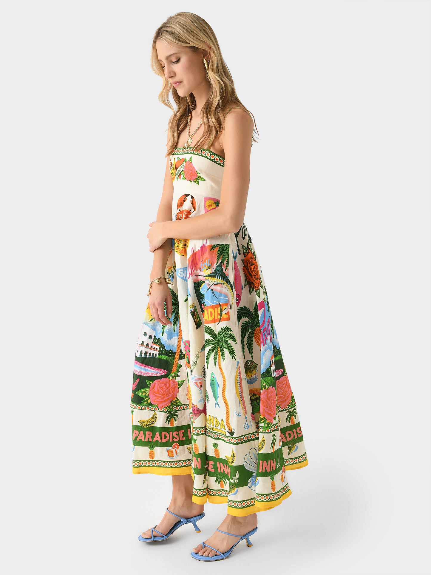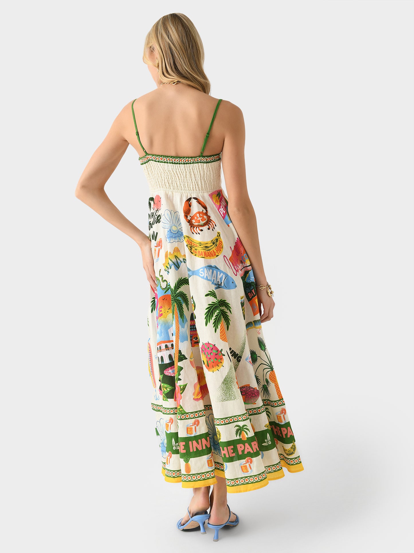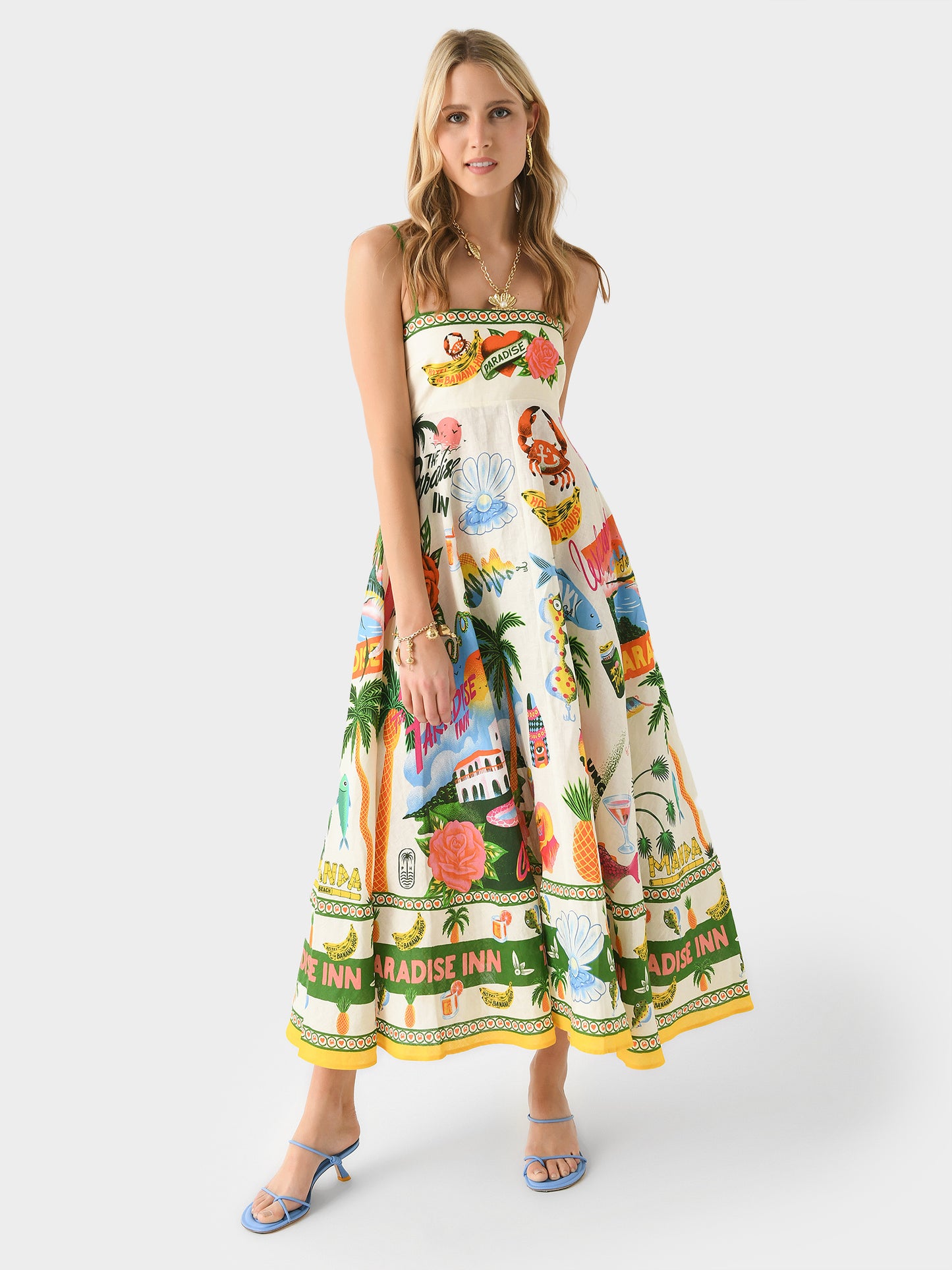 A custom-printed sundress made from lightweight linen with a classic silhouette.