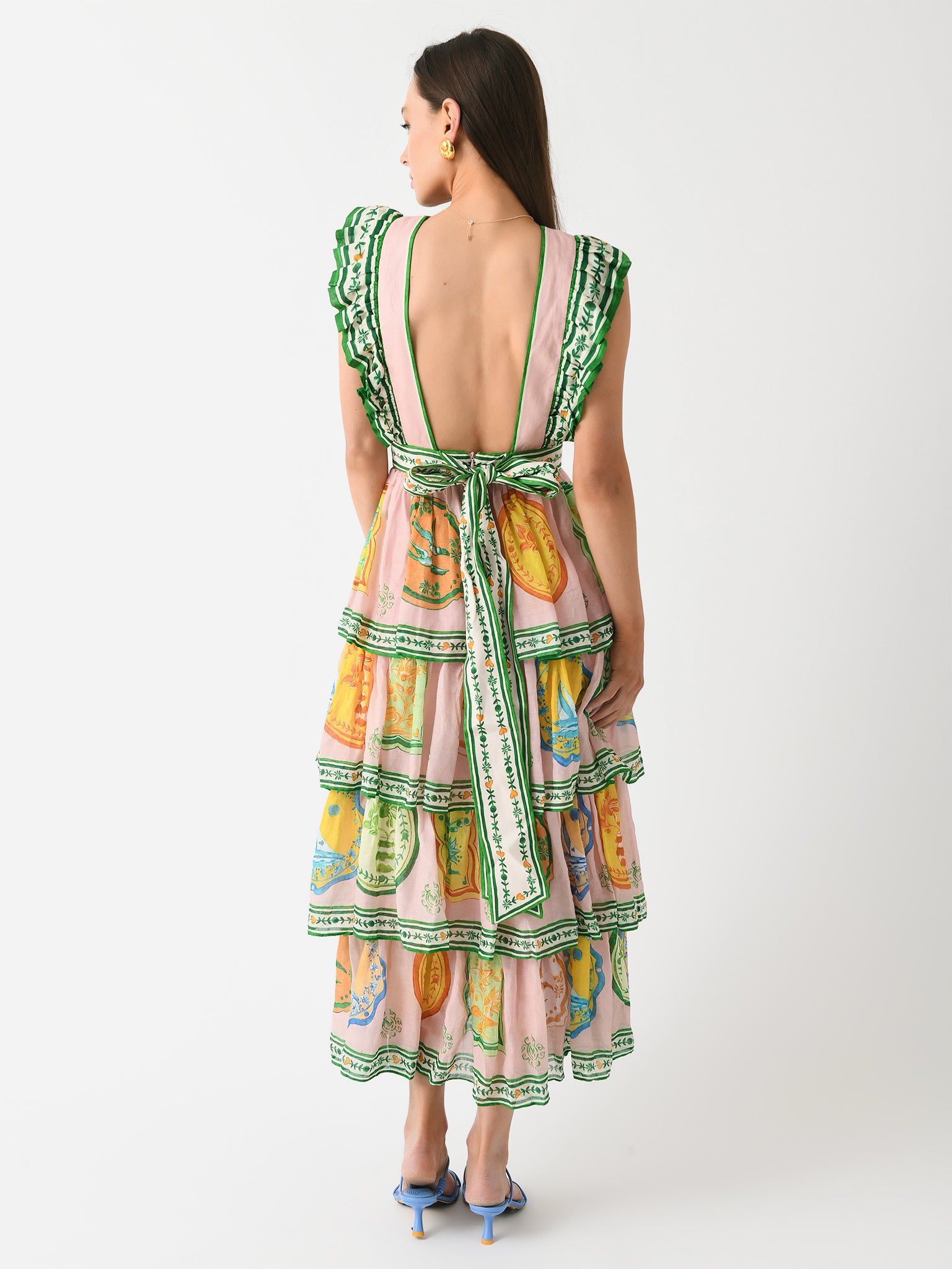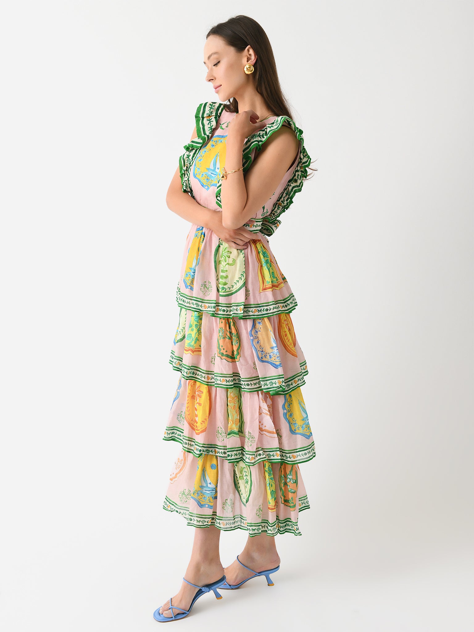 A custom-printed midi dress with gathered frills and a layered tiered skirt.