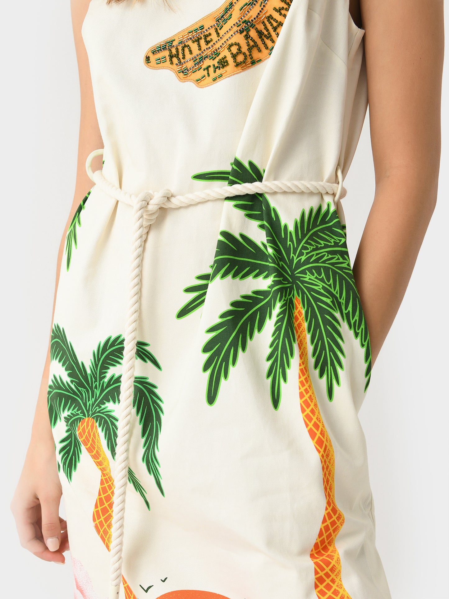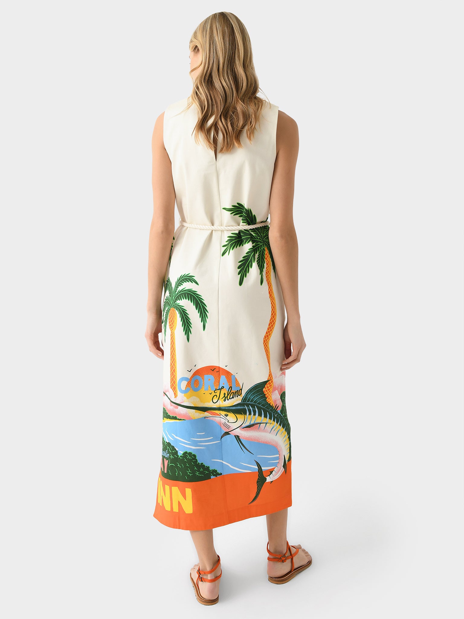 A sleeveless midi dress constructed from organic cotton twill with a custom-design print.
