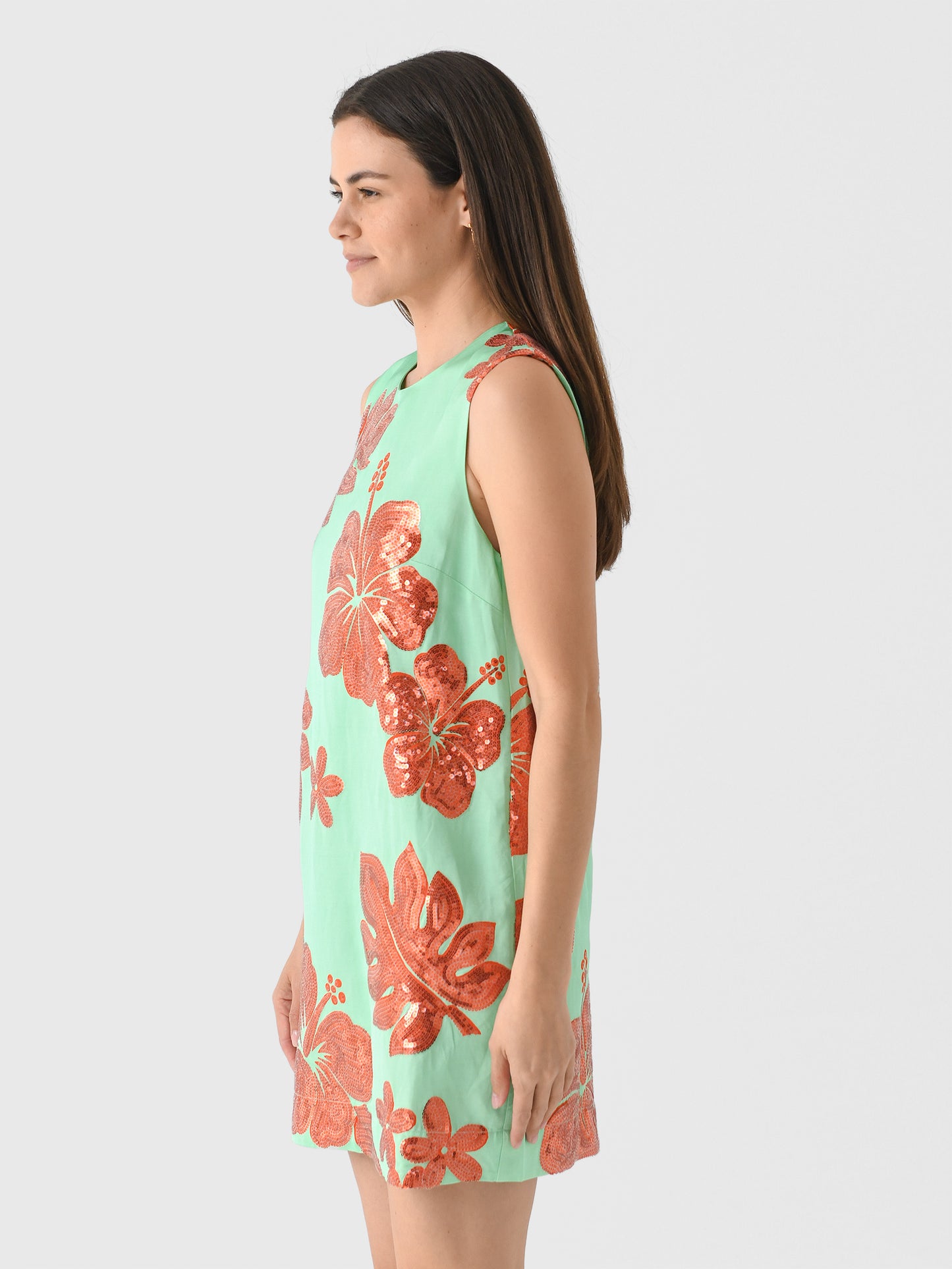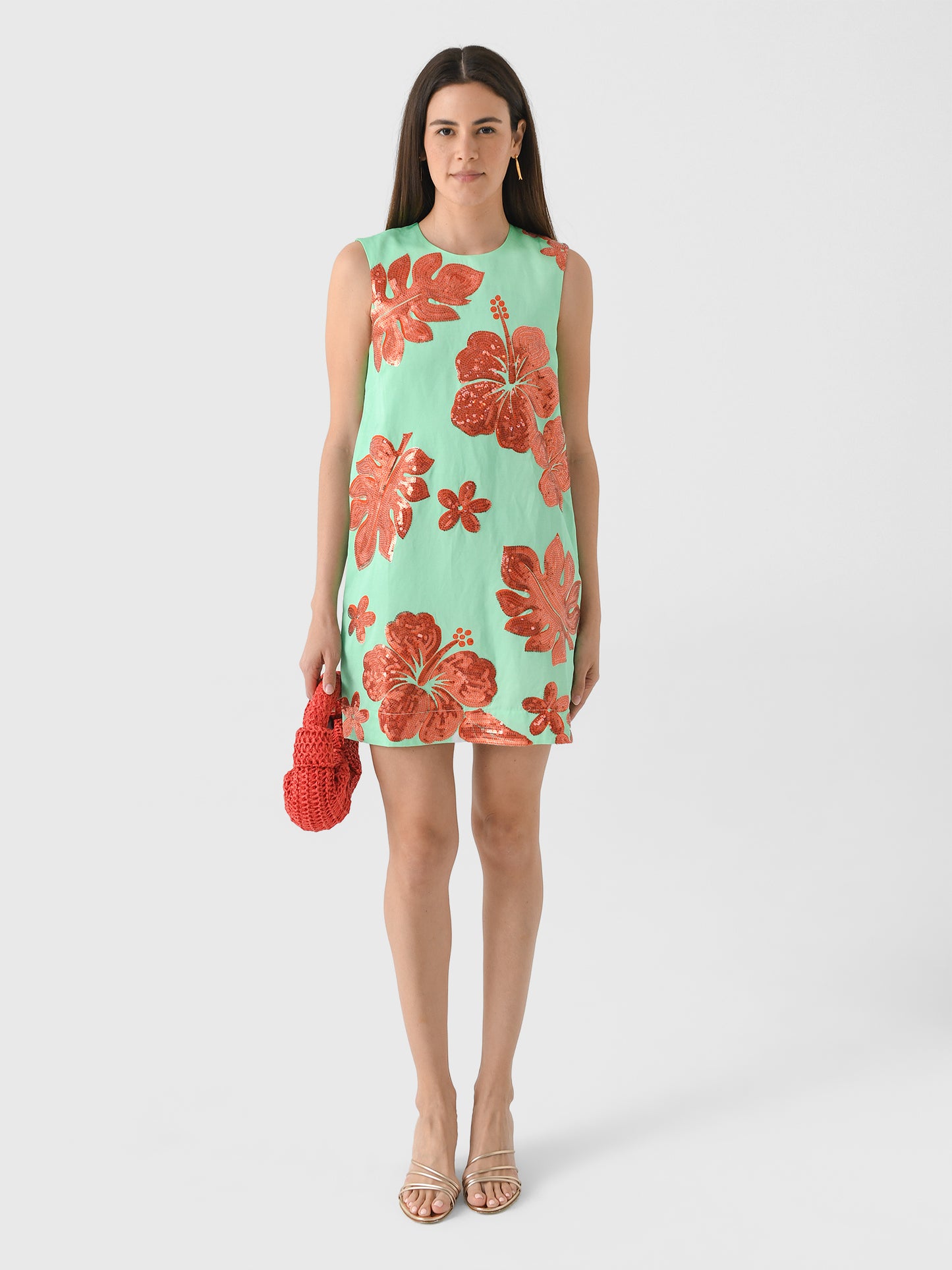 This shift-style mini dress is made from lustrous satin and features shimmery embroidered sequin motifs.