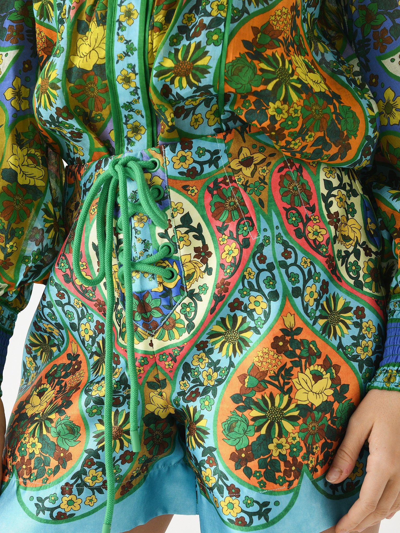 A high-waisted short with a chunky lace-up detail and colorful floral print.