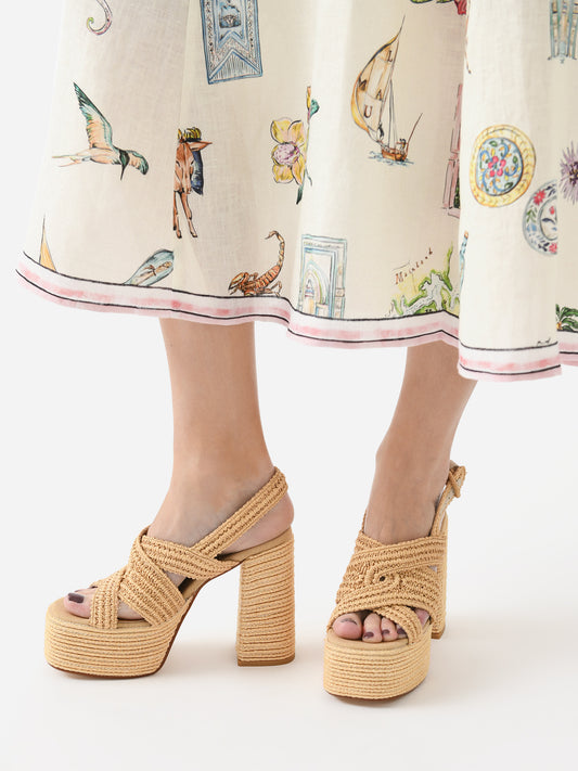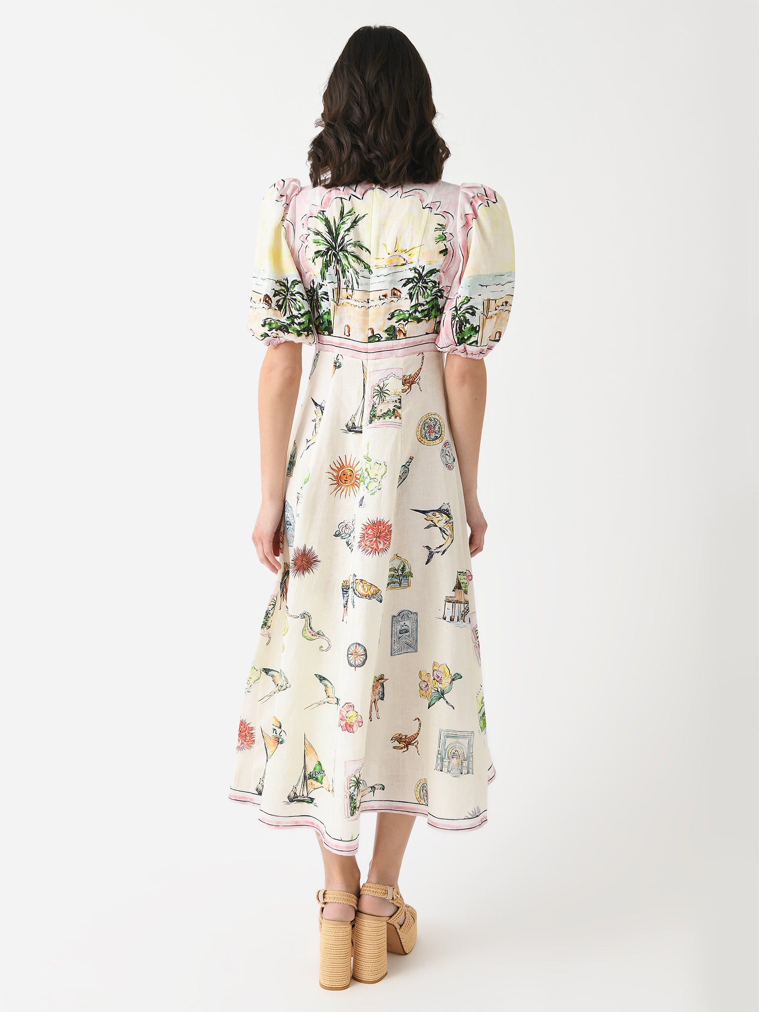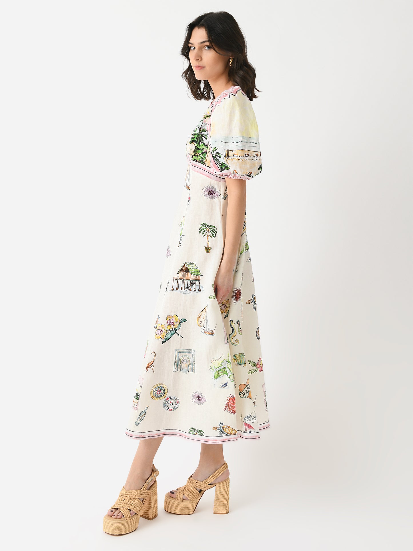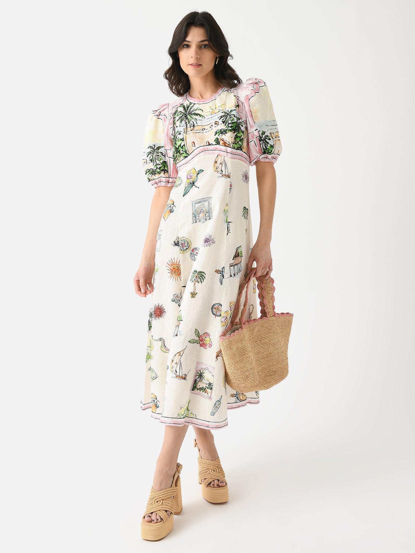 A mid-length dress with a flattering A-line silhouette and tropical-inspired print.