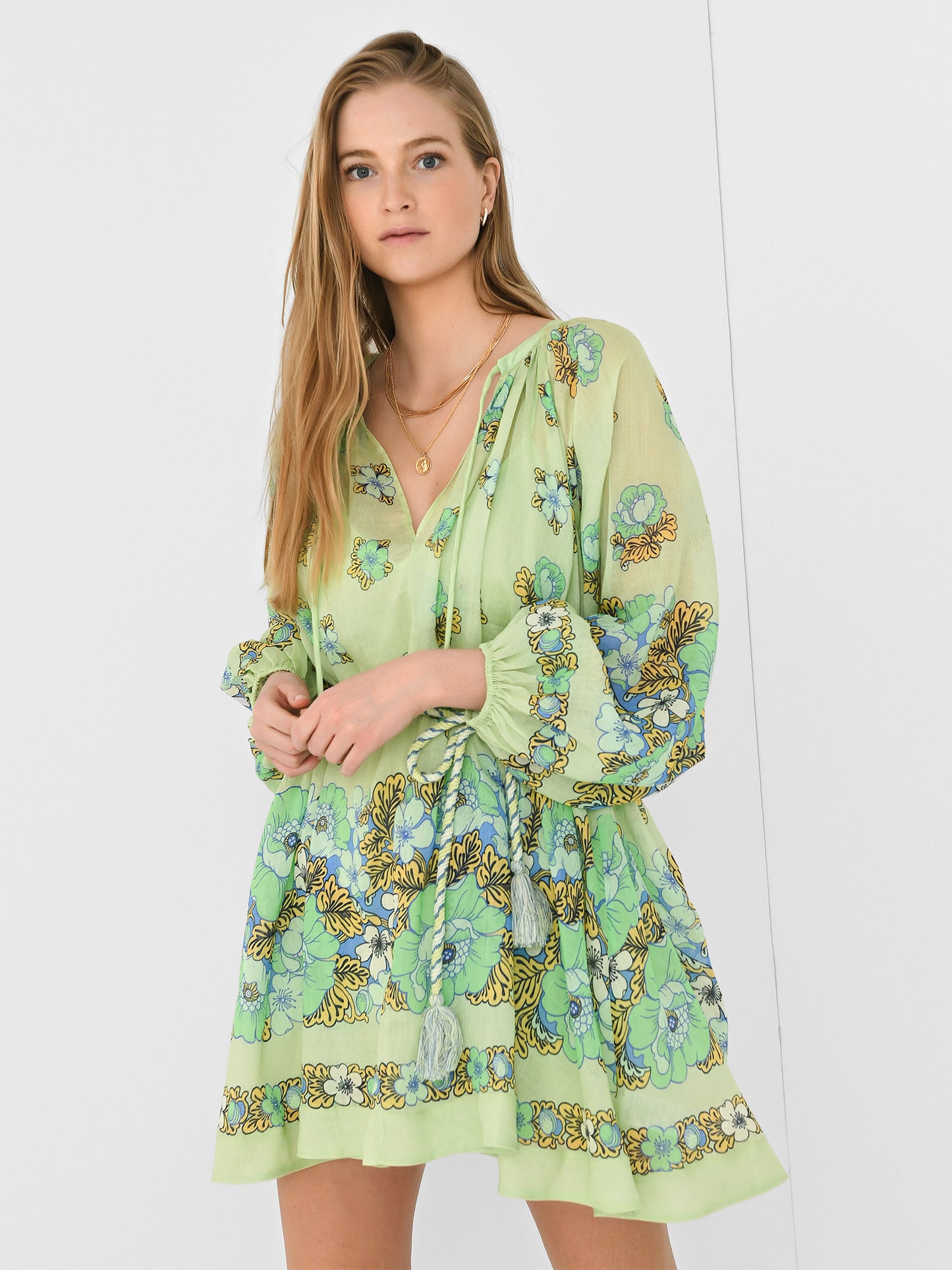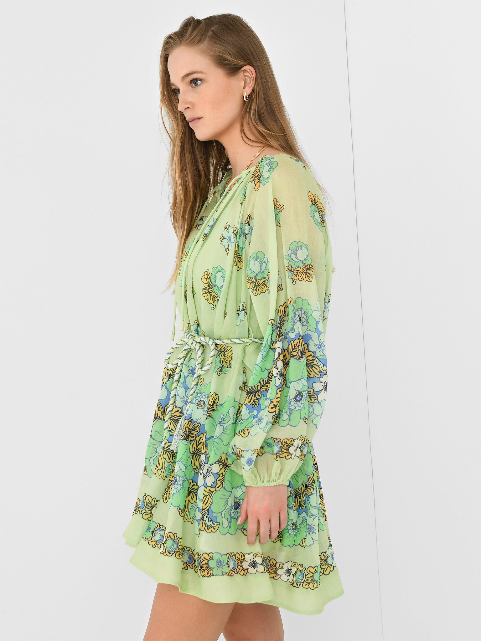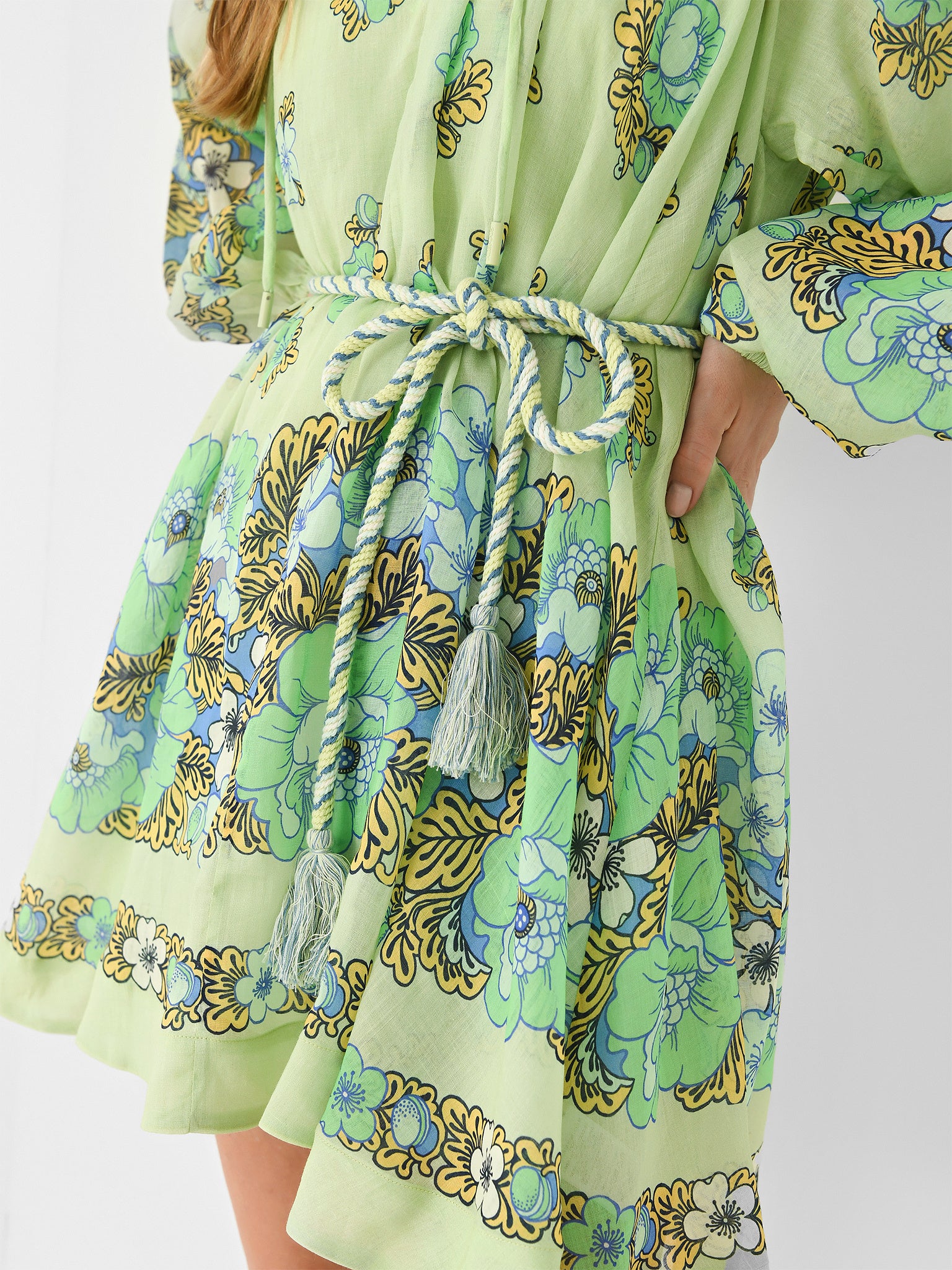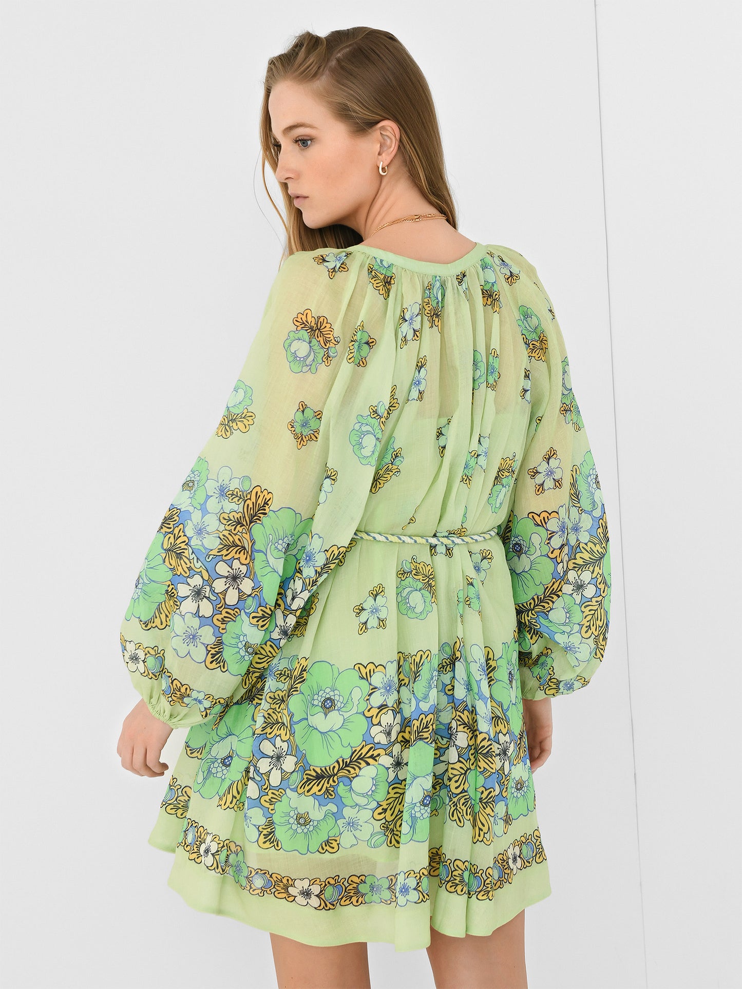 An easy-fitting mini dress with a deep neckline, balloon sleeves, and removable rope belt.