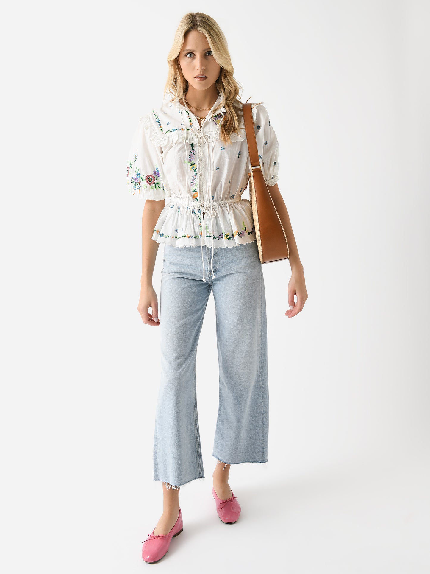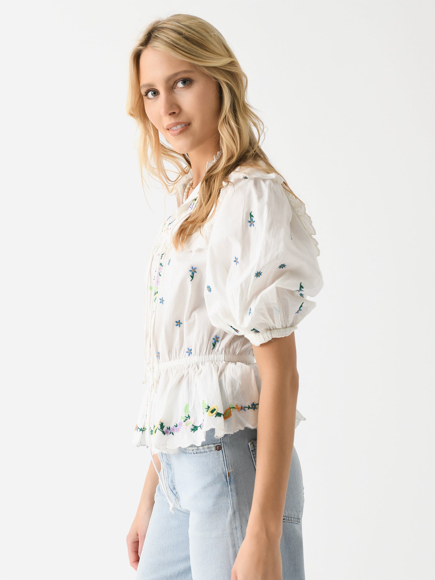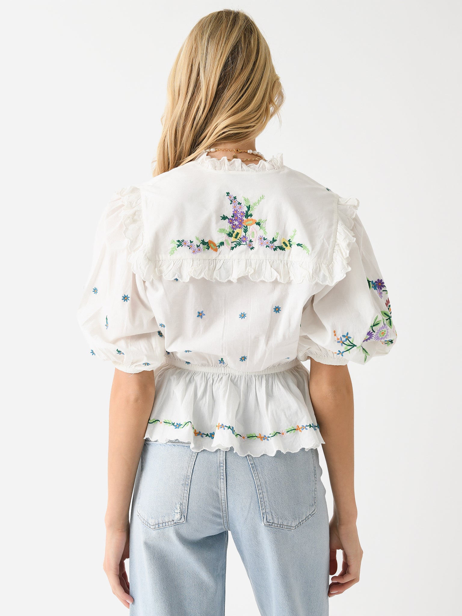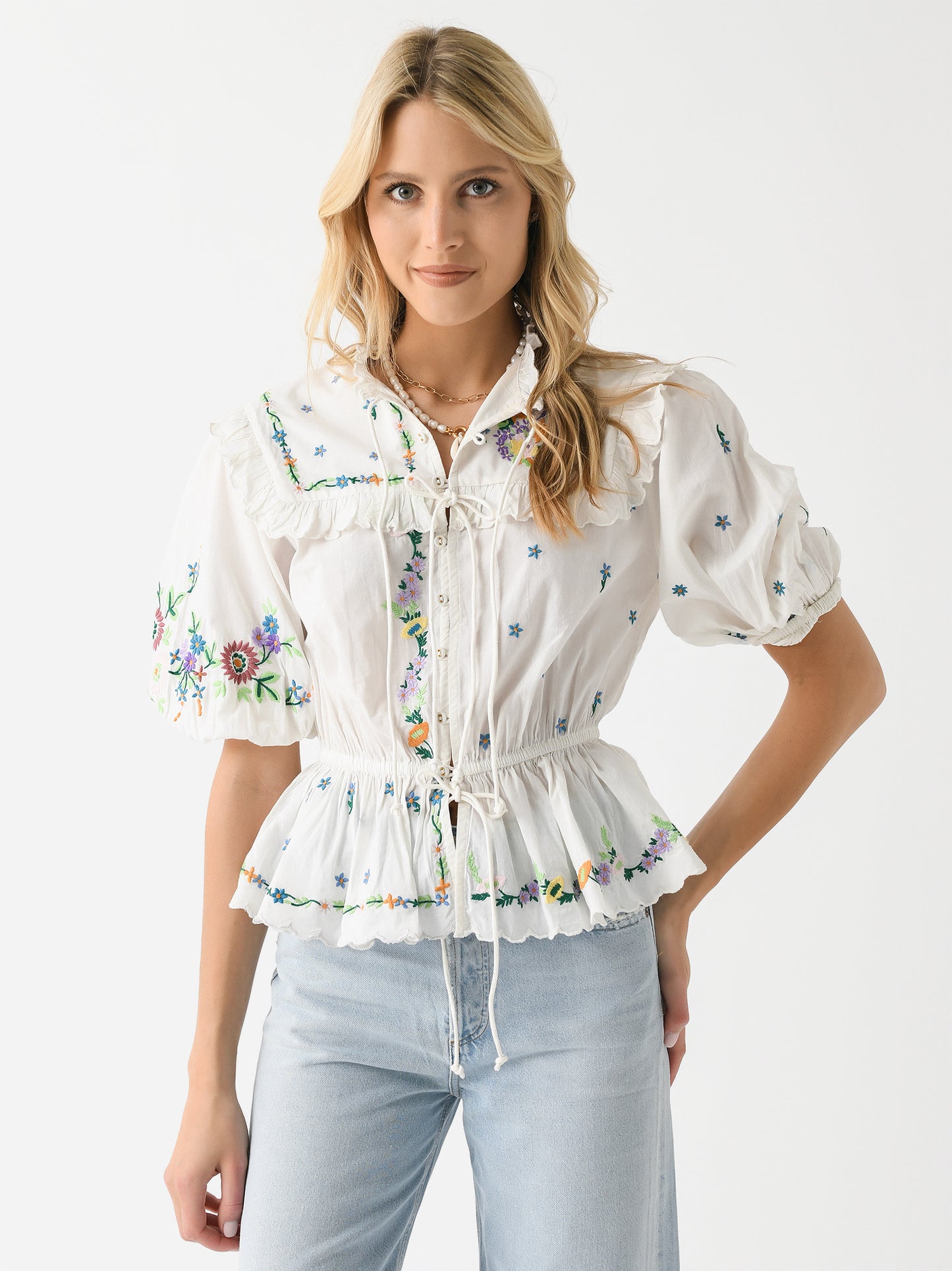 A frilled blouse made from organic cotton with self-tie closures and delicate embroidered motifs.