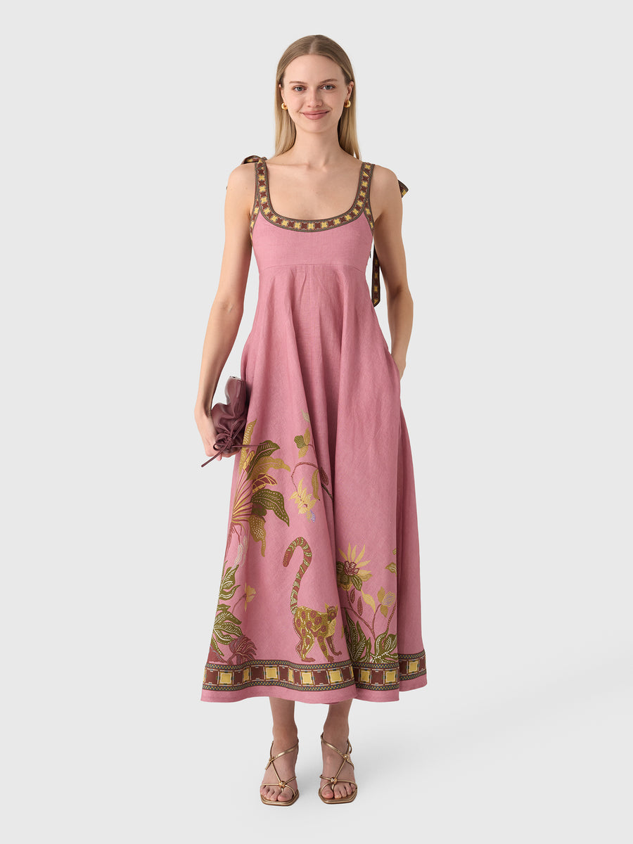 Scoop Neckline Self-Tie Straps Side Zip Closure Side Pockets Gathered Skirt Midi Silhouette All-Over Novelty Print 100% Linen Classic Fit