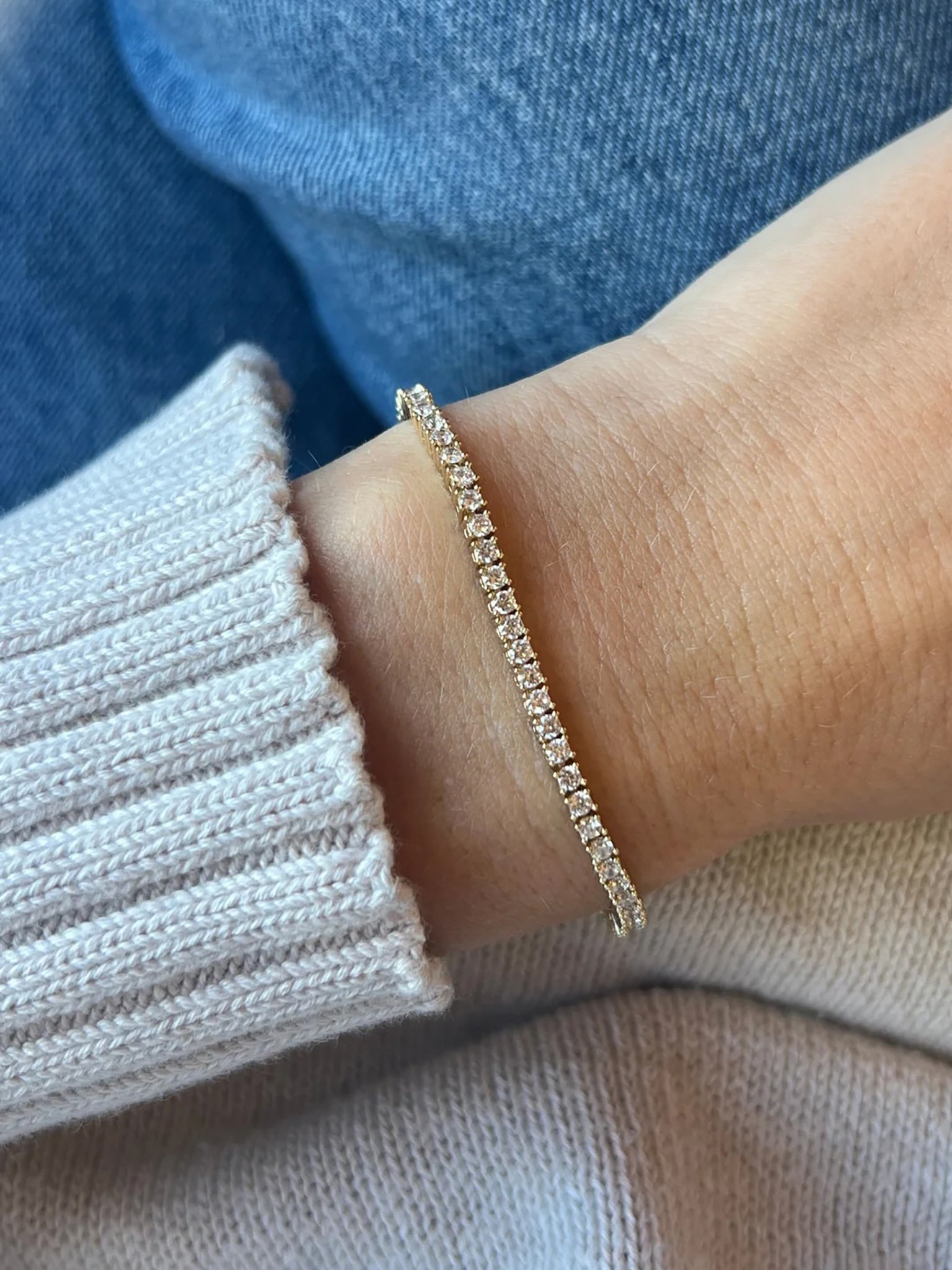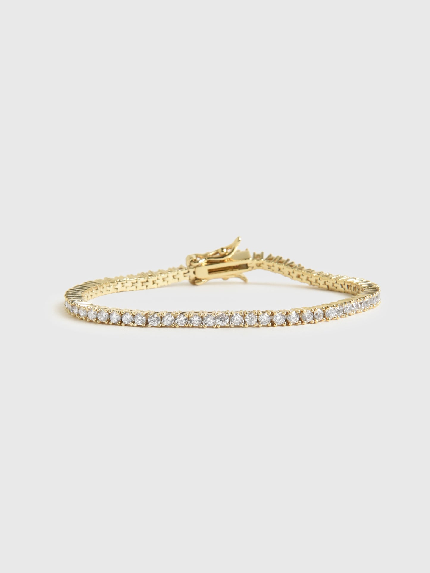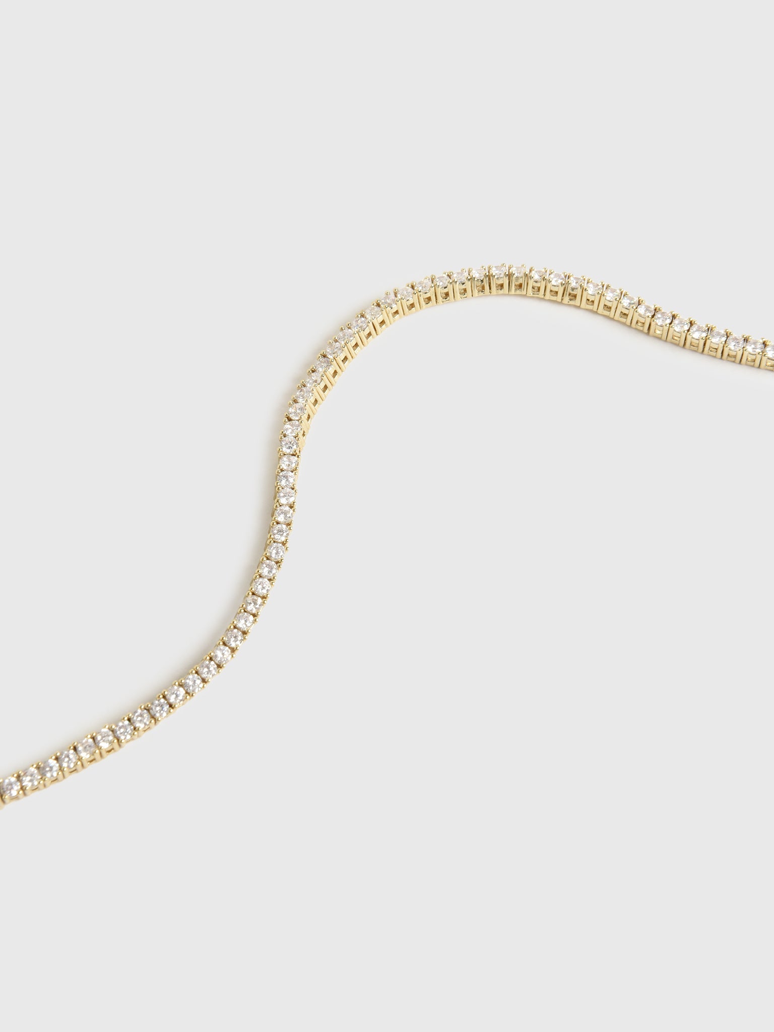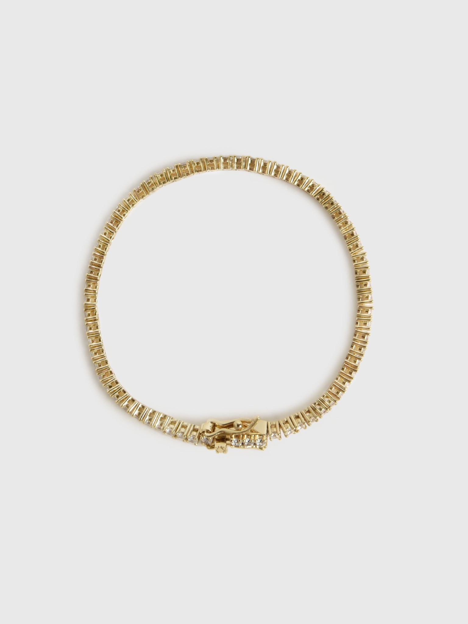 A classic tennis bracelet made from 14-karat gold-filled metal with sparkling cubic zirconia stones.