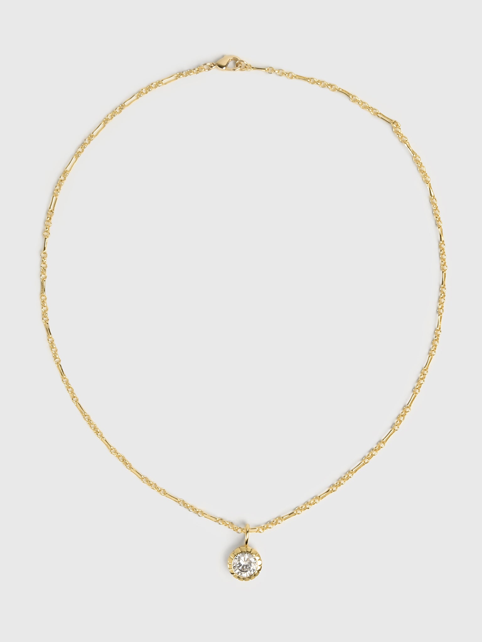 A 14-karat gold-filled necklace featuring a ball chain and a bezel-set cubic zirconia charm.